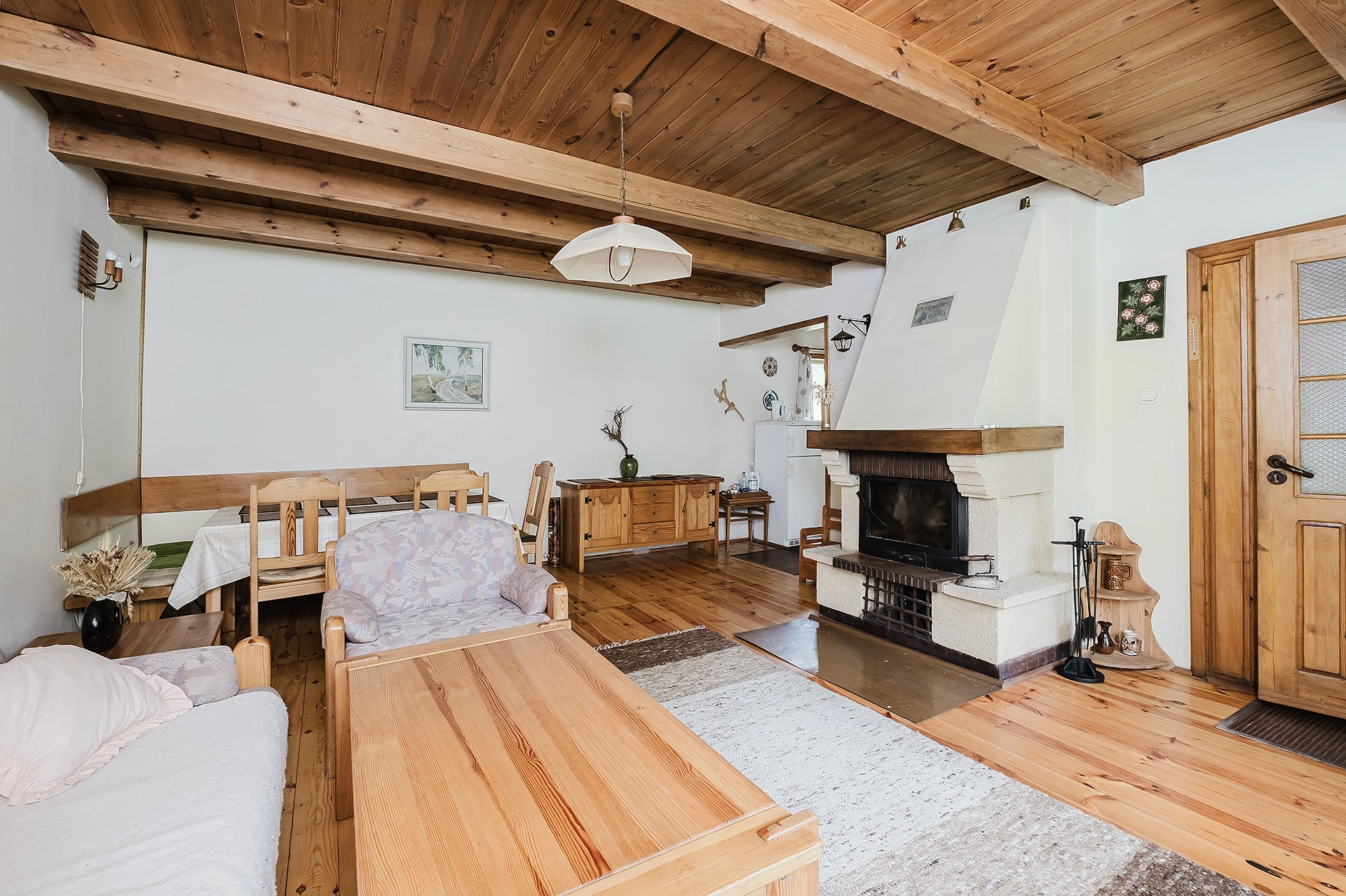 – salon z kominkiem z wyjściem na taras i ogrodu.