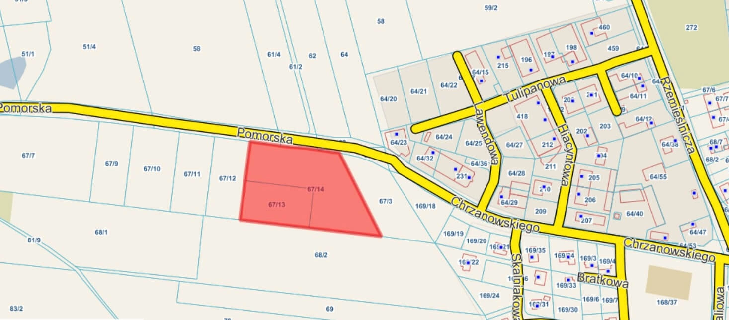 – działka o numerze 67/13 o pow. 3.002 m2 w kształcie prostokąta,