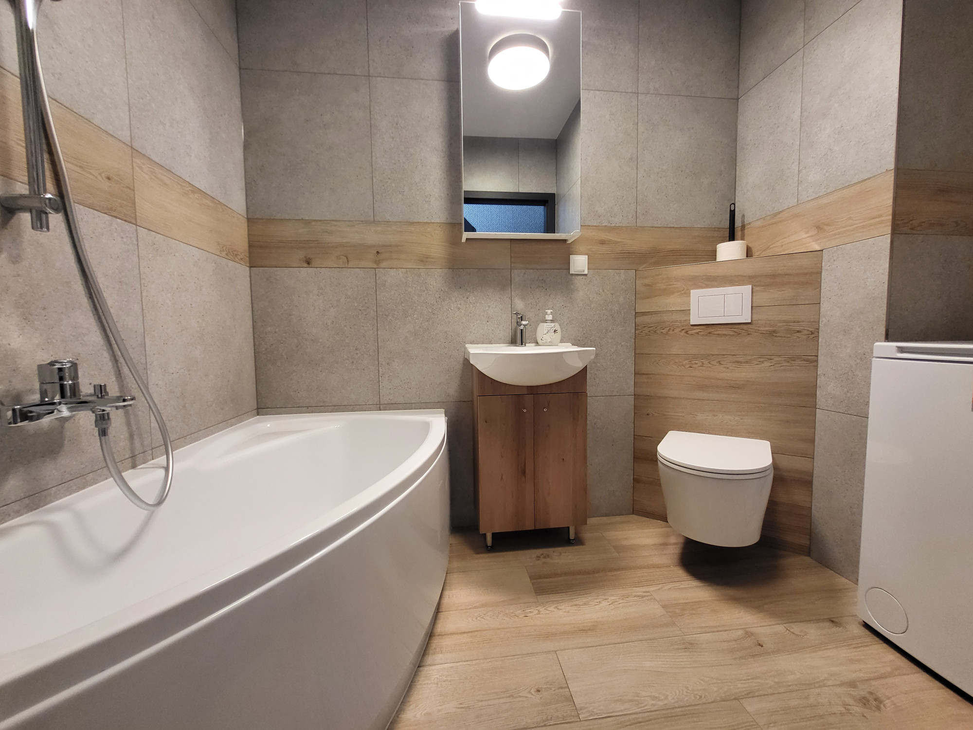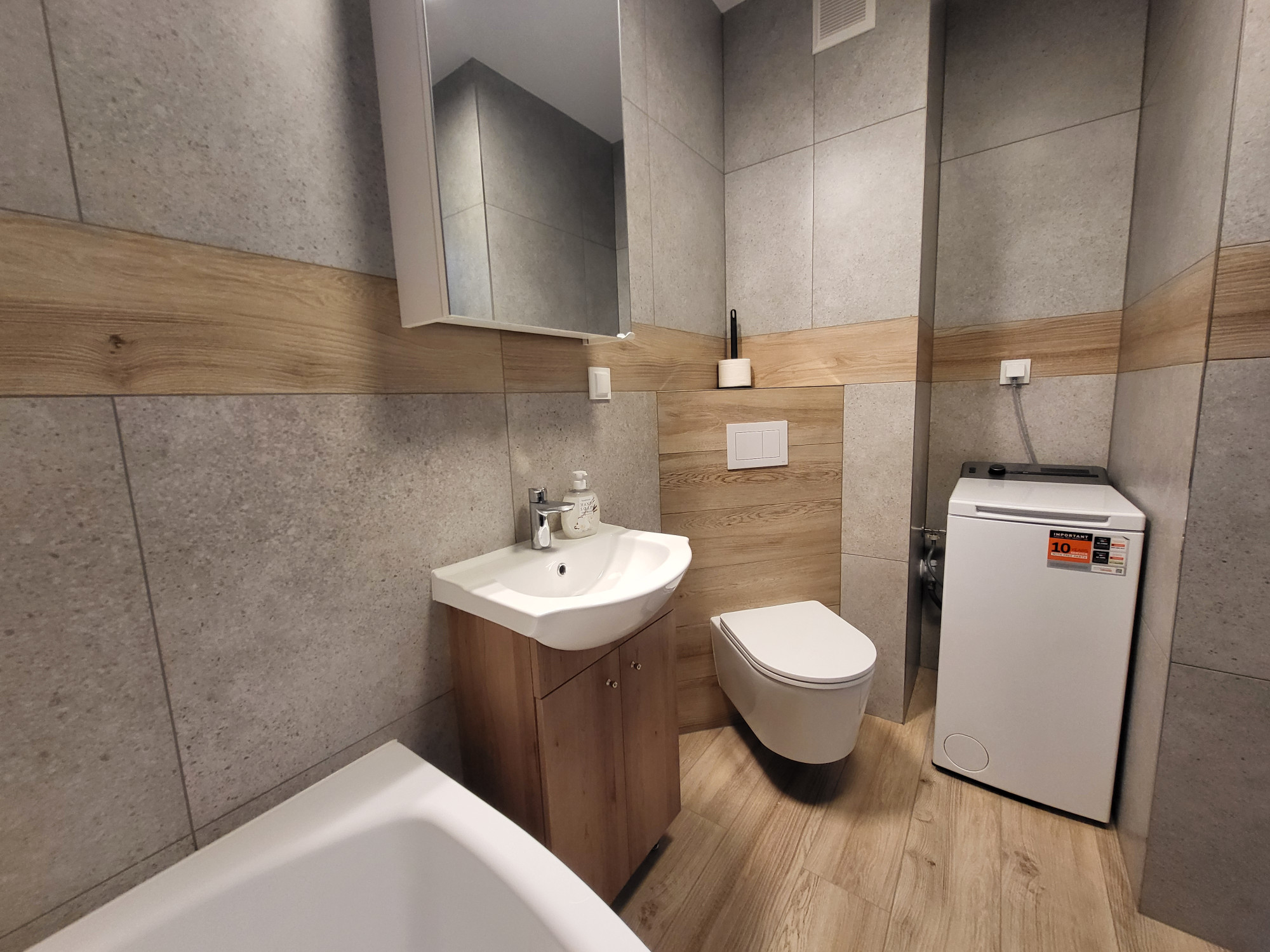– Łazienka z wanną, wyposażona w pralkę.