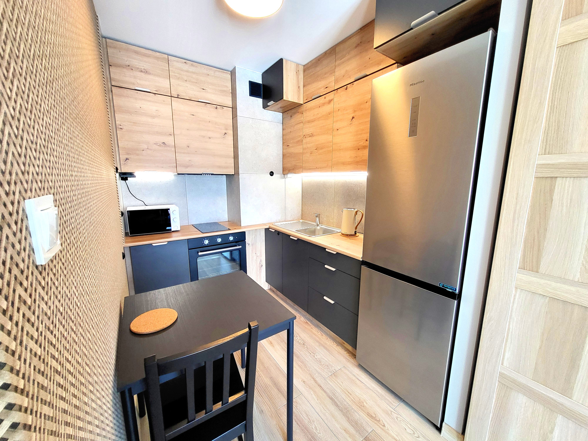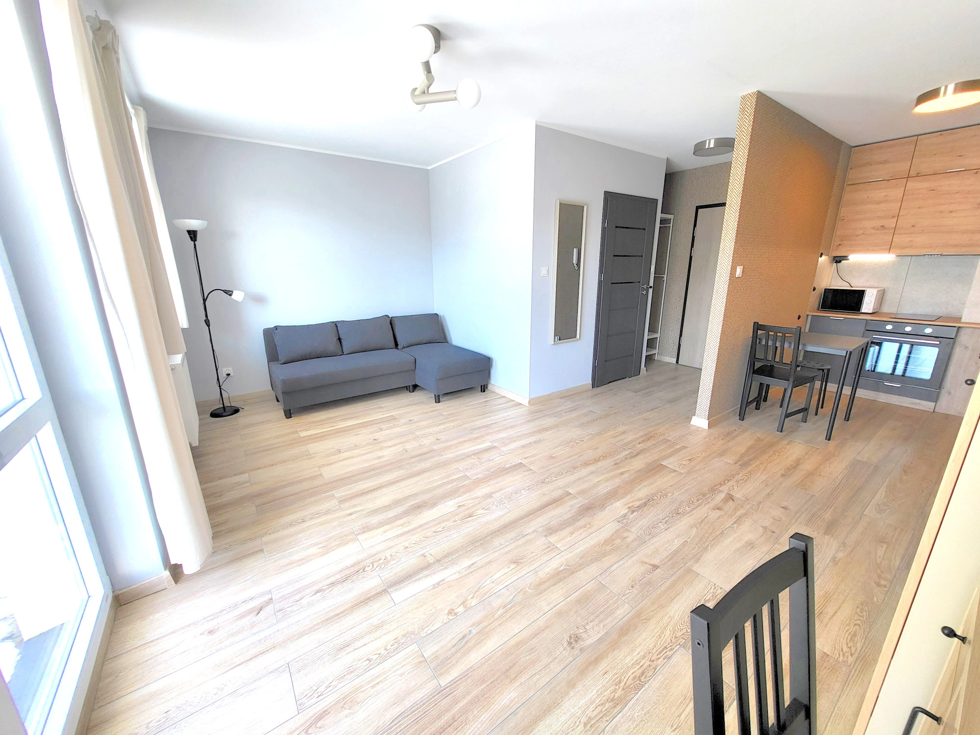 – Przestronny pokój dzienny z wyjściem na wygodny i balkon od strony zachodniej, aneks kuchenny, wyposażonym w sprzęt AGD, stół z krzesłami