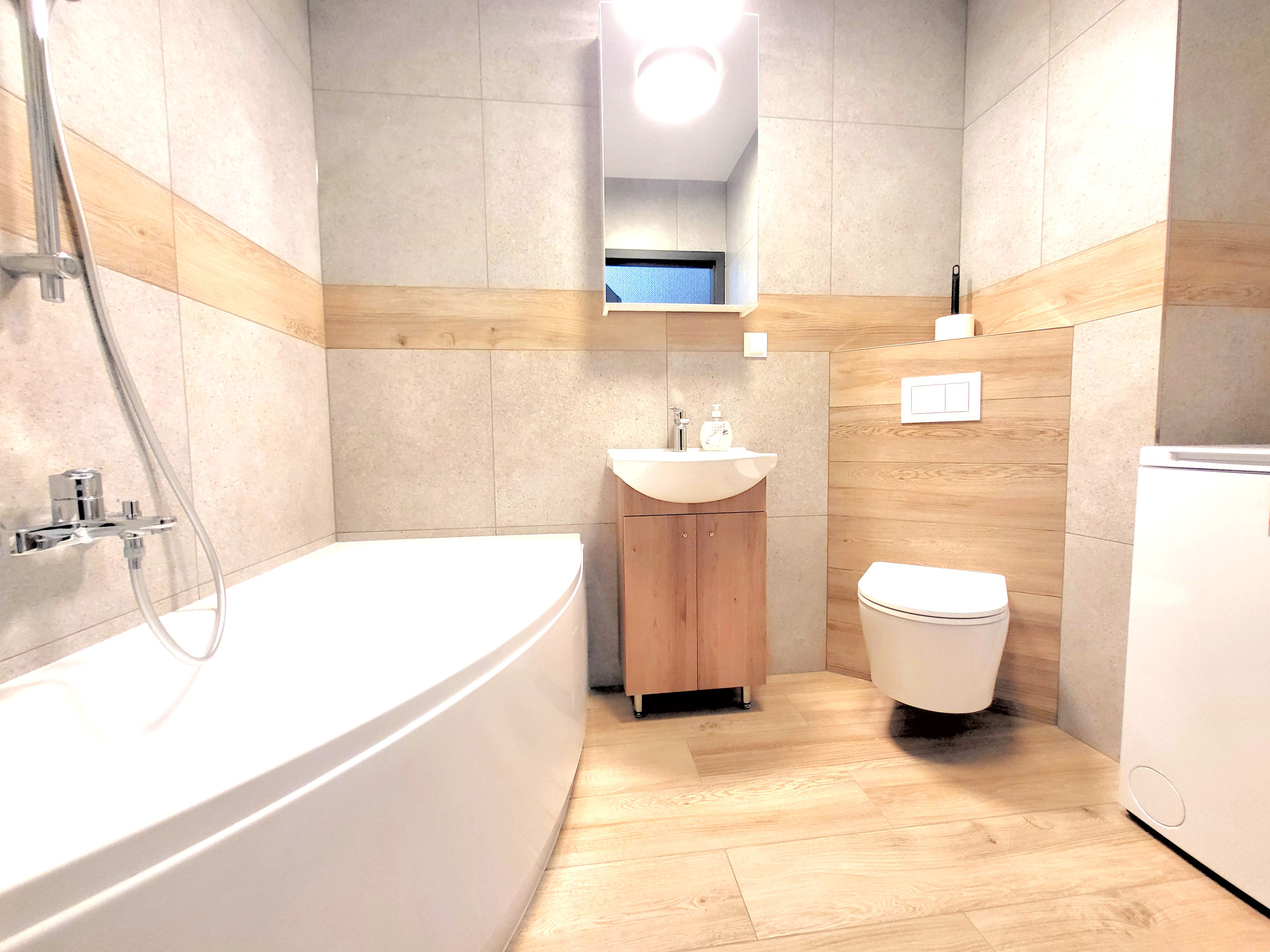 – Łazienka z wanną, wyposażona w pralkę.