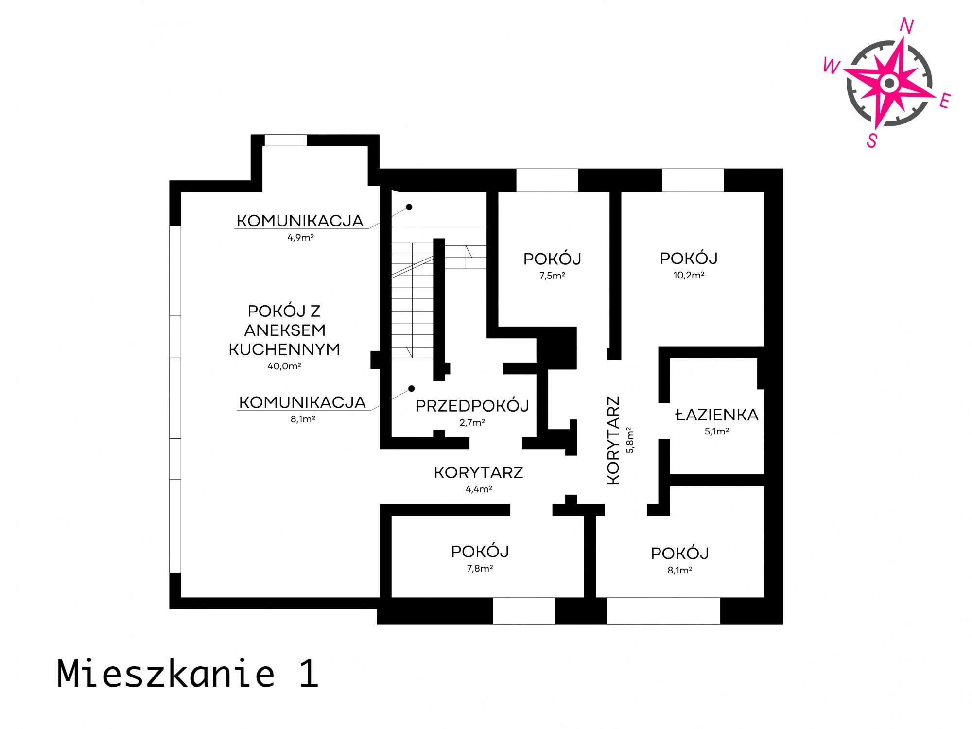 – 4 pokoje o pow. odpowiednio ok. 7,5 m2, 10,2 m2, 8,1 m2 oraz 7,8 m2,