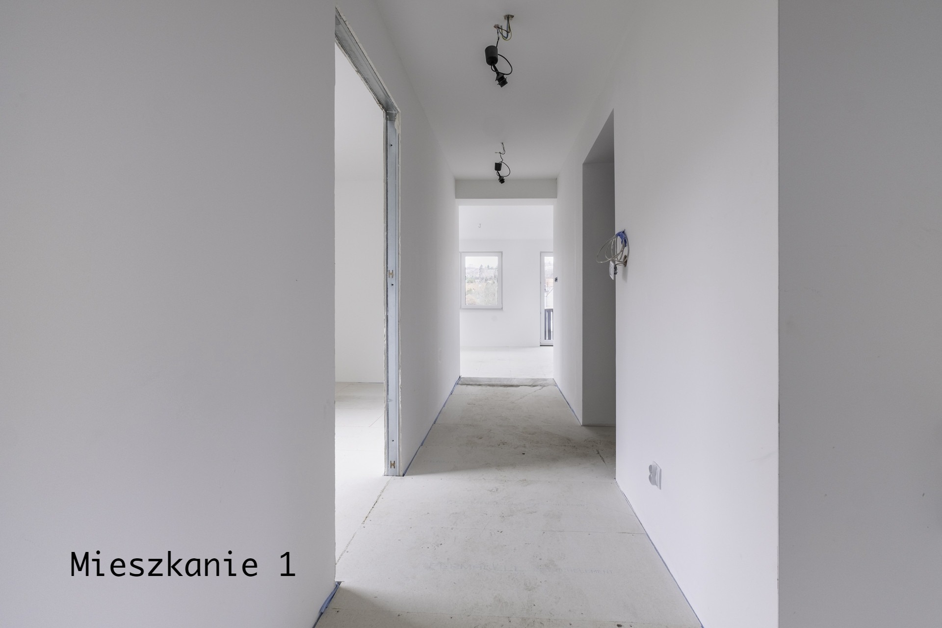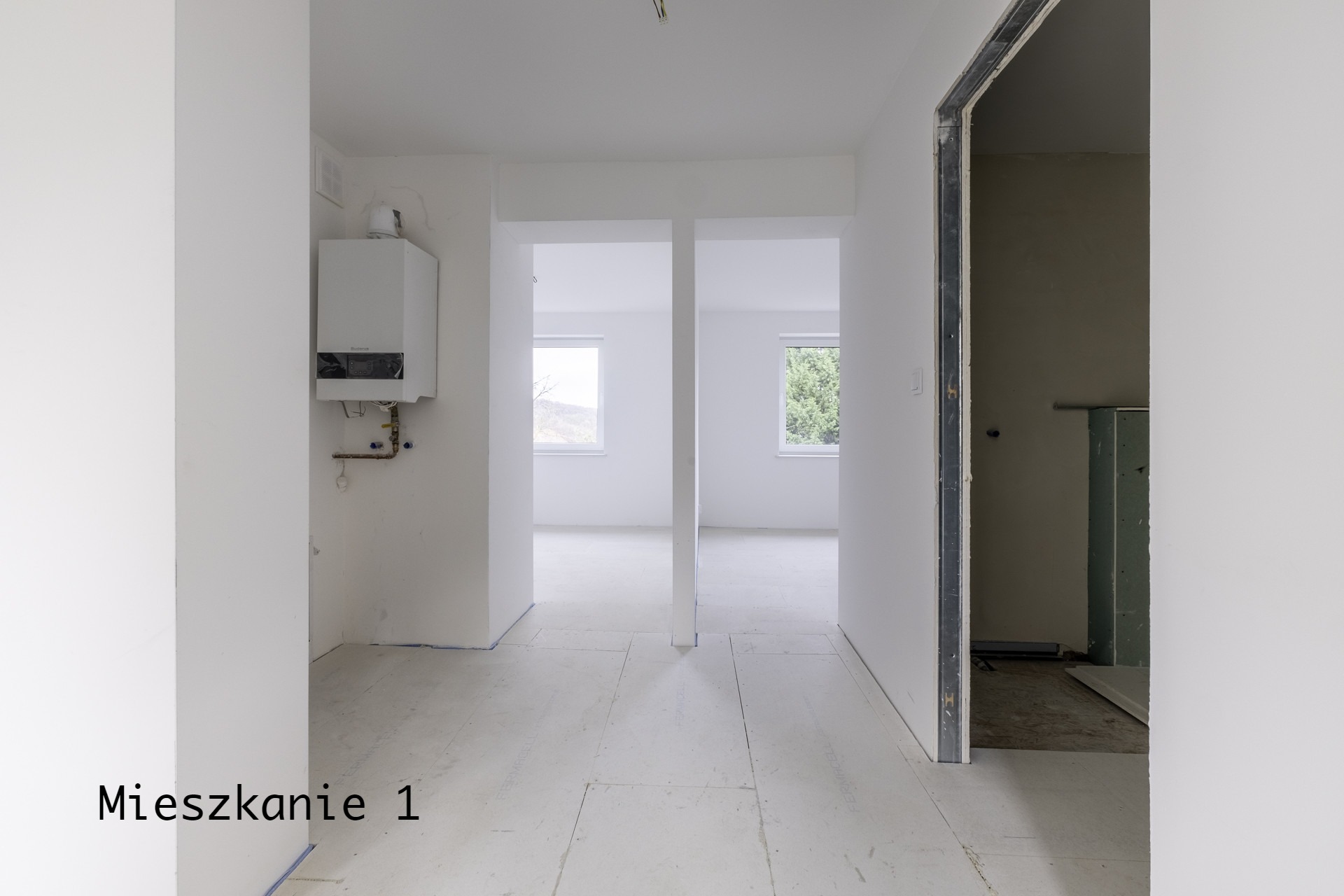 Mieszkanie Nr 1 o pow. ok. 100 m2 (w zależności od miejsca posadowienia drzwi dzielących oba mieszkania) z następującymi pomieszczeniami