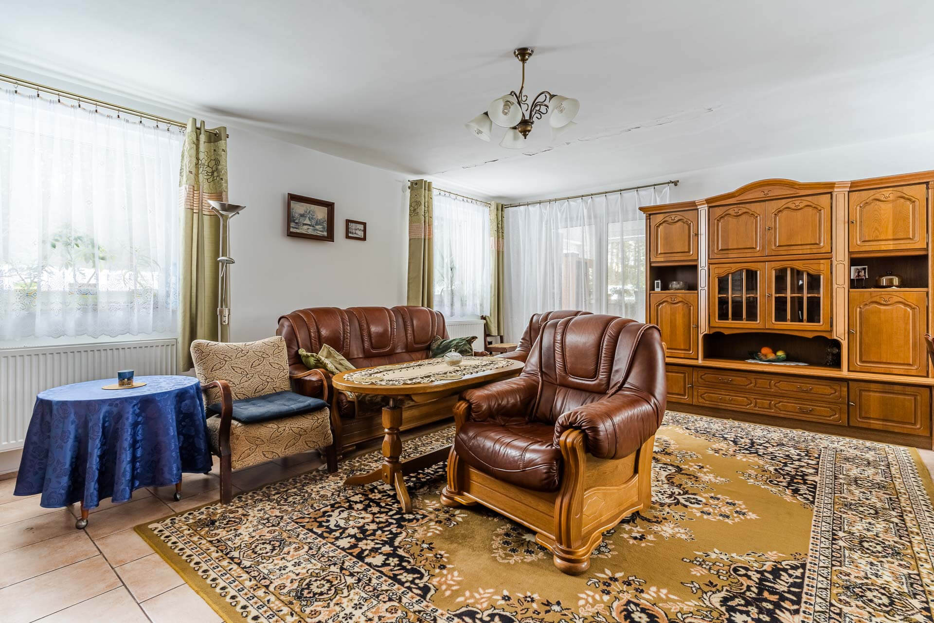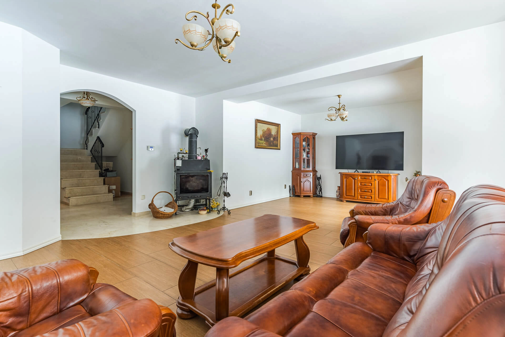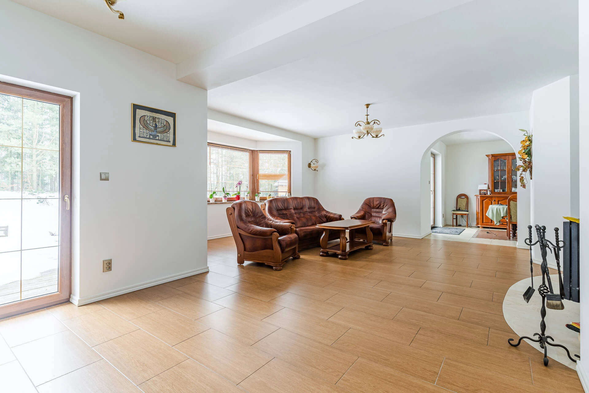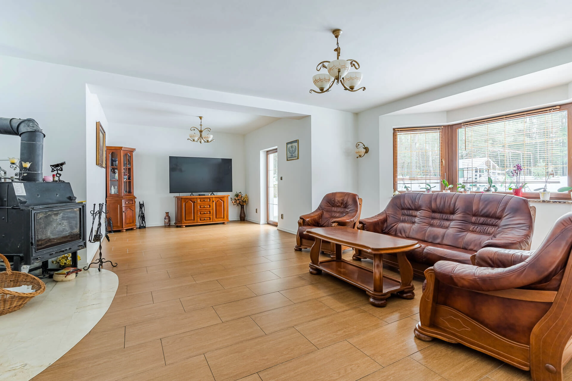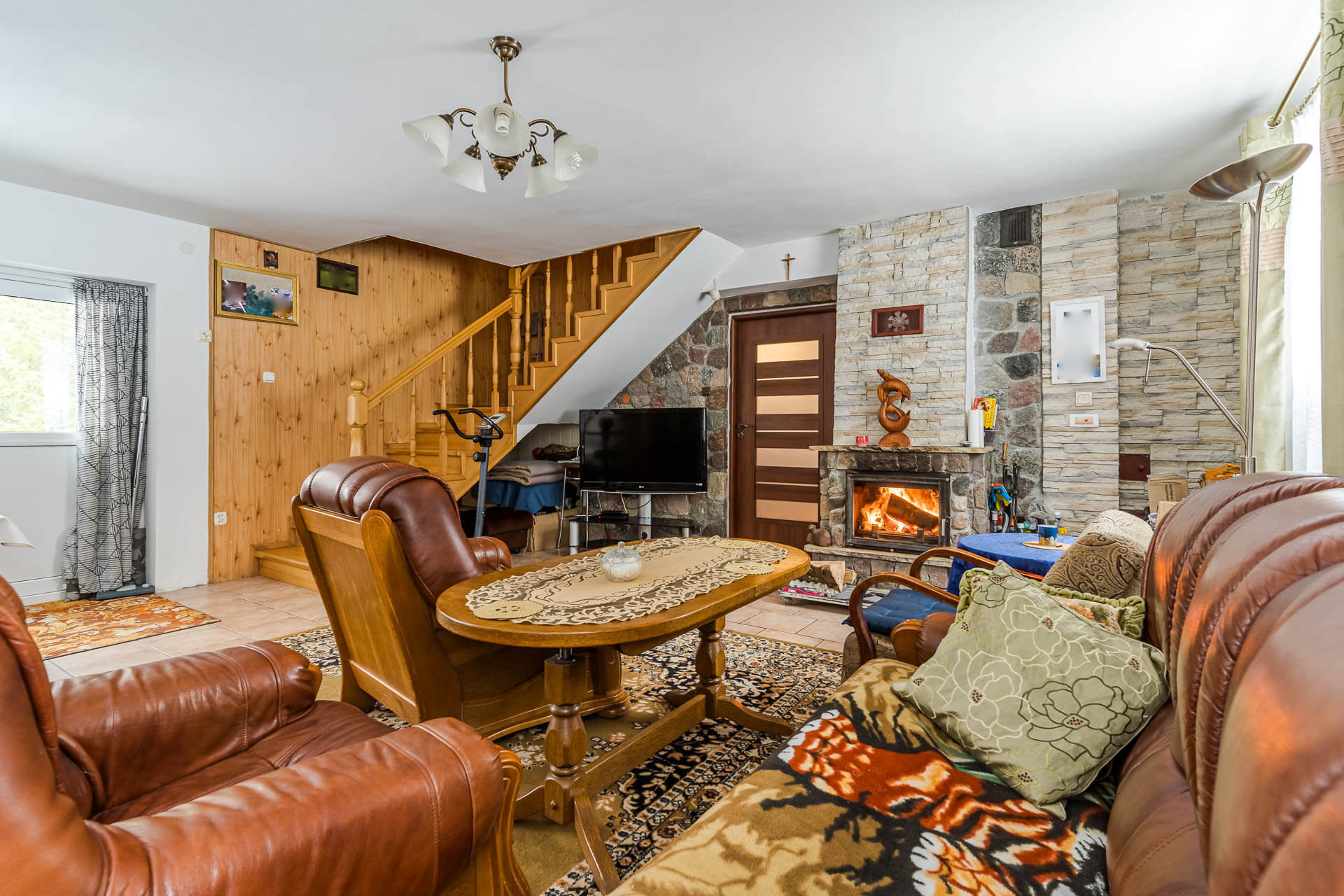 – salon o powierzchni około 45 m/2 z wyjściem na słoneczny taras od strony południowej. W salonie kominek z płaszczem wodnym