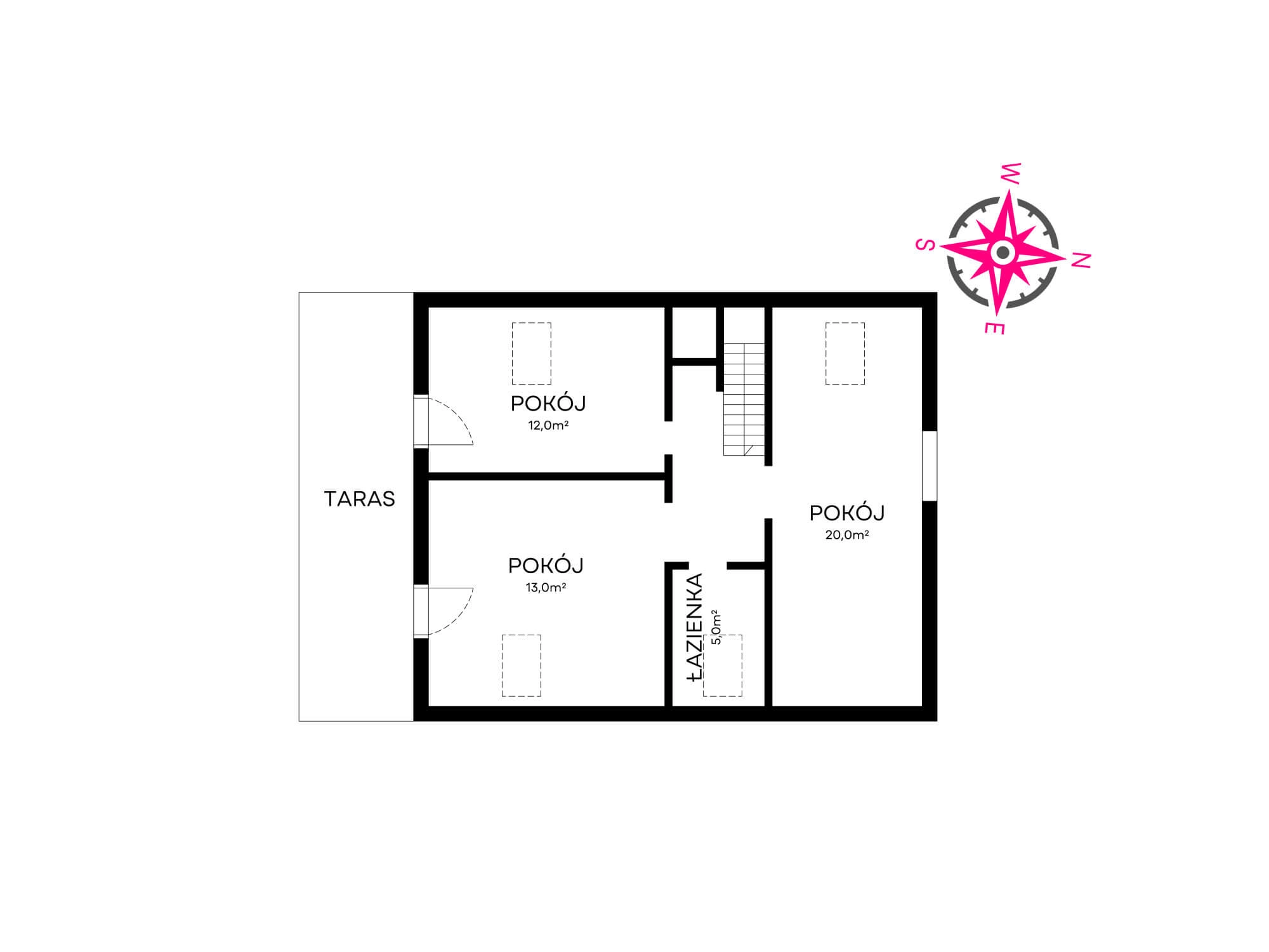 – 2 pokoje ( 12 m/2 i 13 m/2) z wyjściami na zadaszony balkon od strony południowej