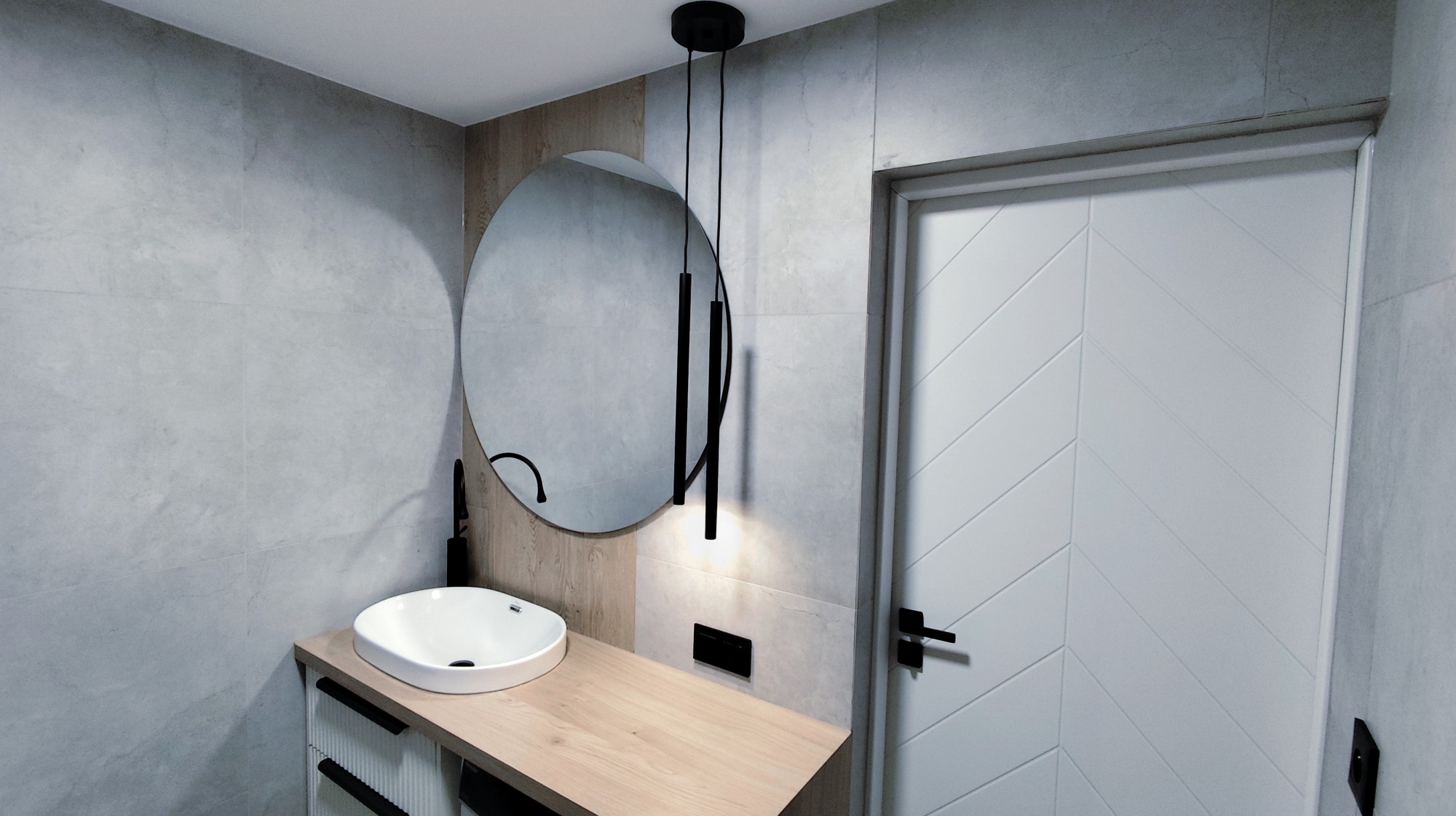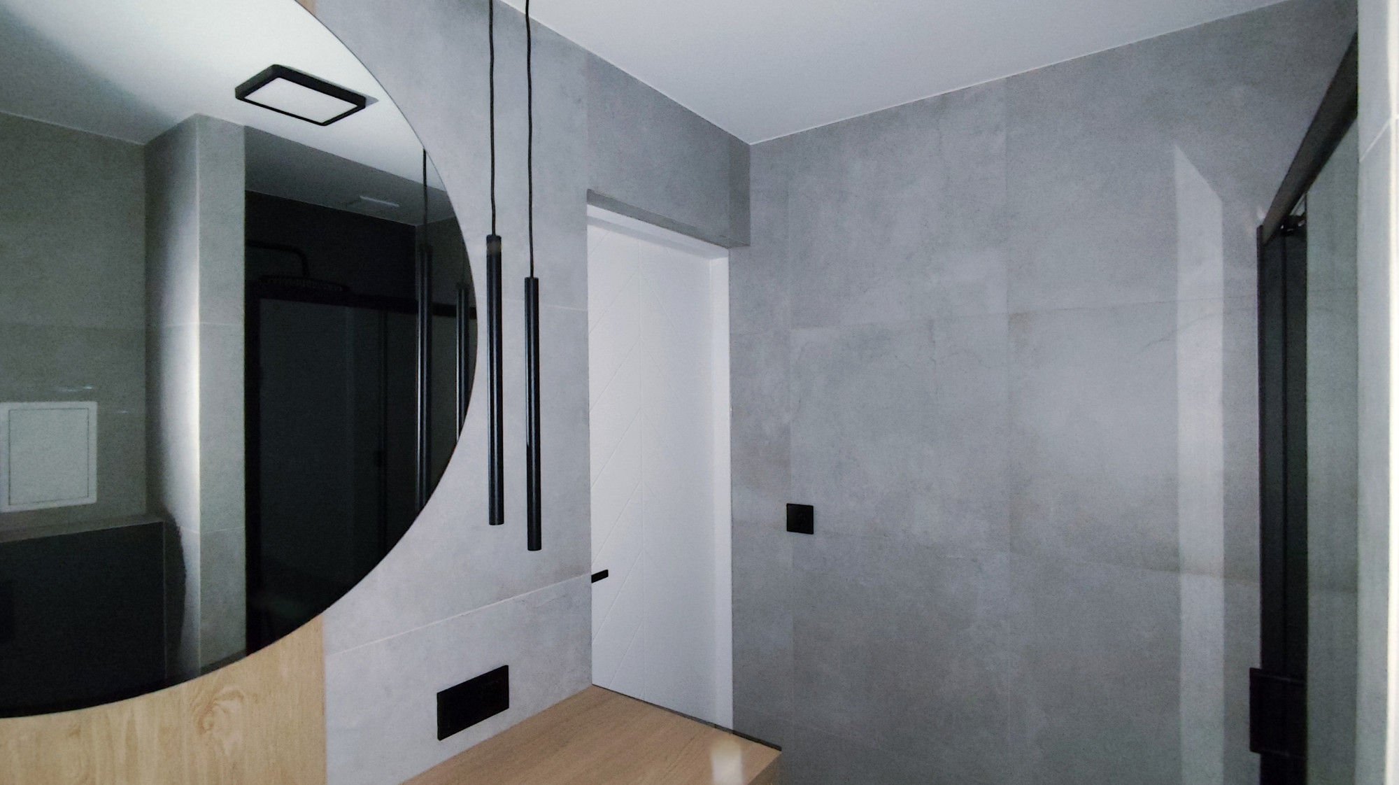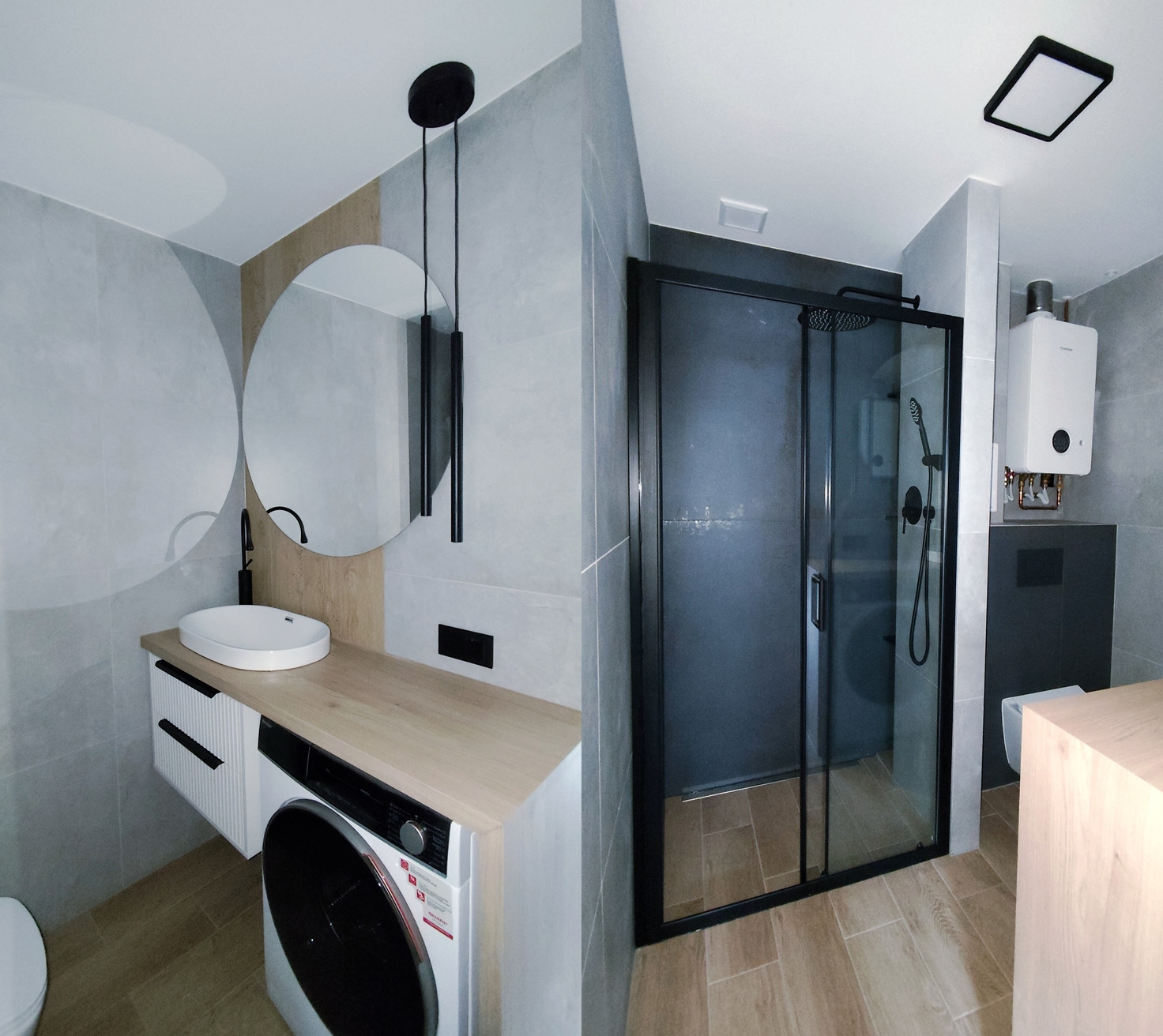 – łazienka z WC, prysznicem typu walk-in, pralką, umywalką, lustrem,