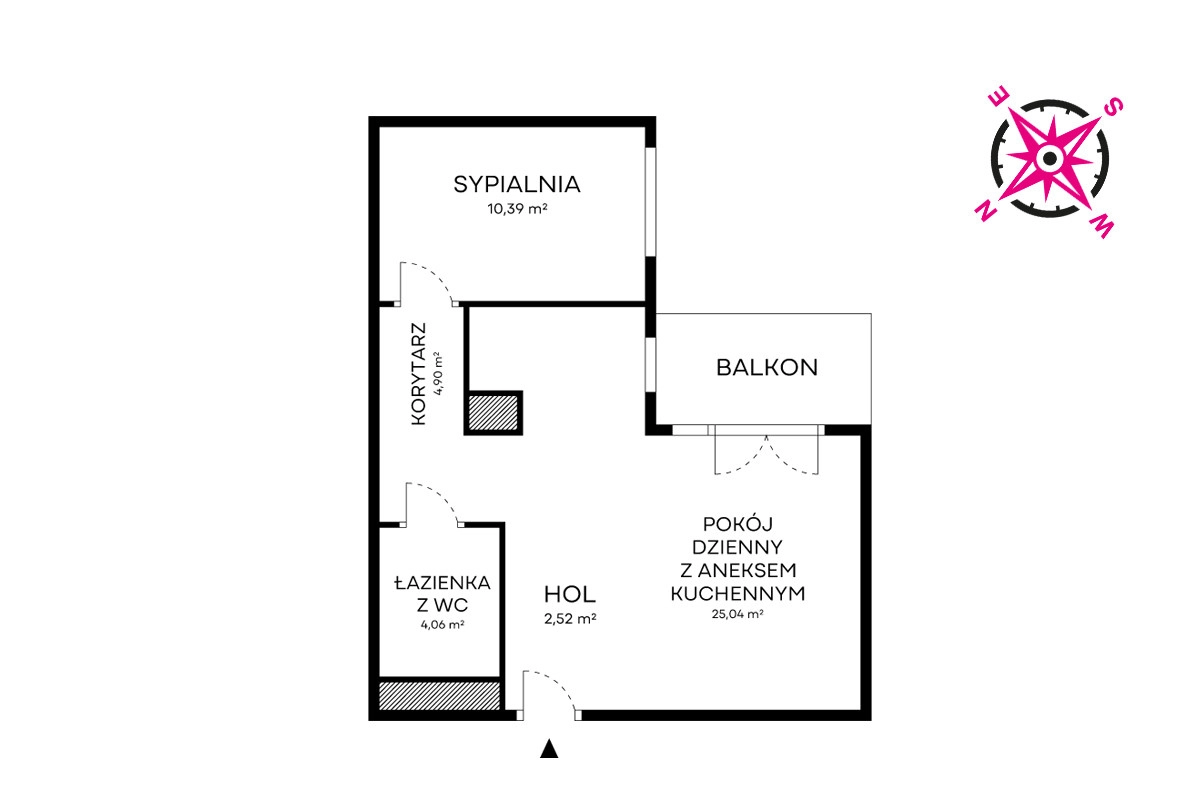 – pokój dzienny z aneksem kuchennym (25,04 m2), klimatyzacją i wyjściem na balkon; aneks z meblami w zabudowie, wyposażeniem w sprzęt AGD oraz oknem,