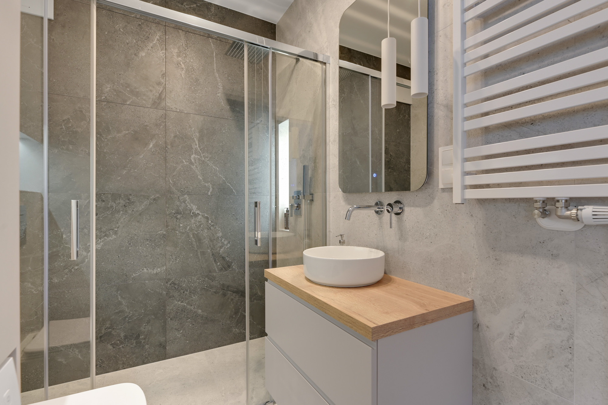 – łazienka (4,06 m2) z WC, prysznicem, pralką, umywalką, lustrem, grzejnikiem drabinkowym,