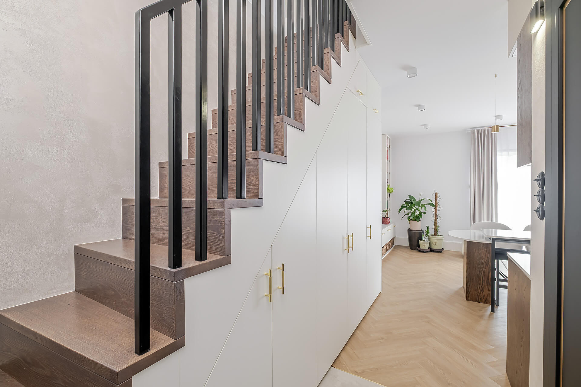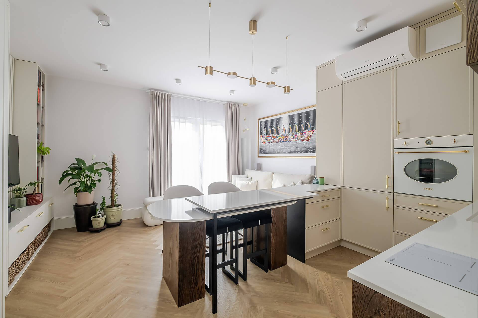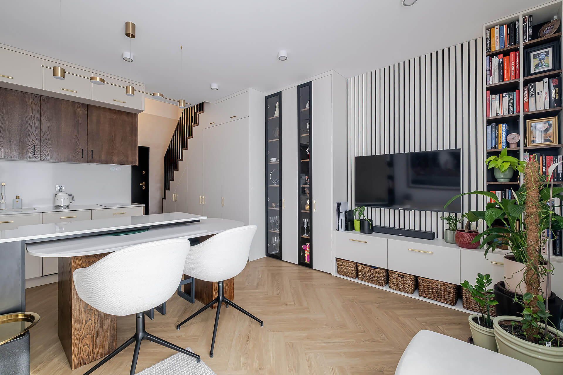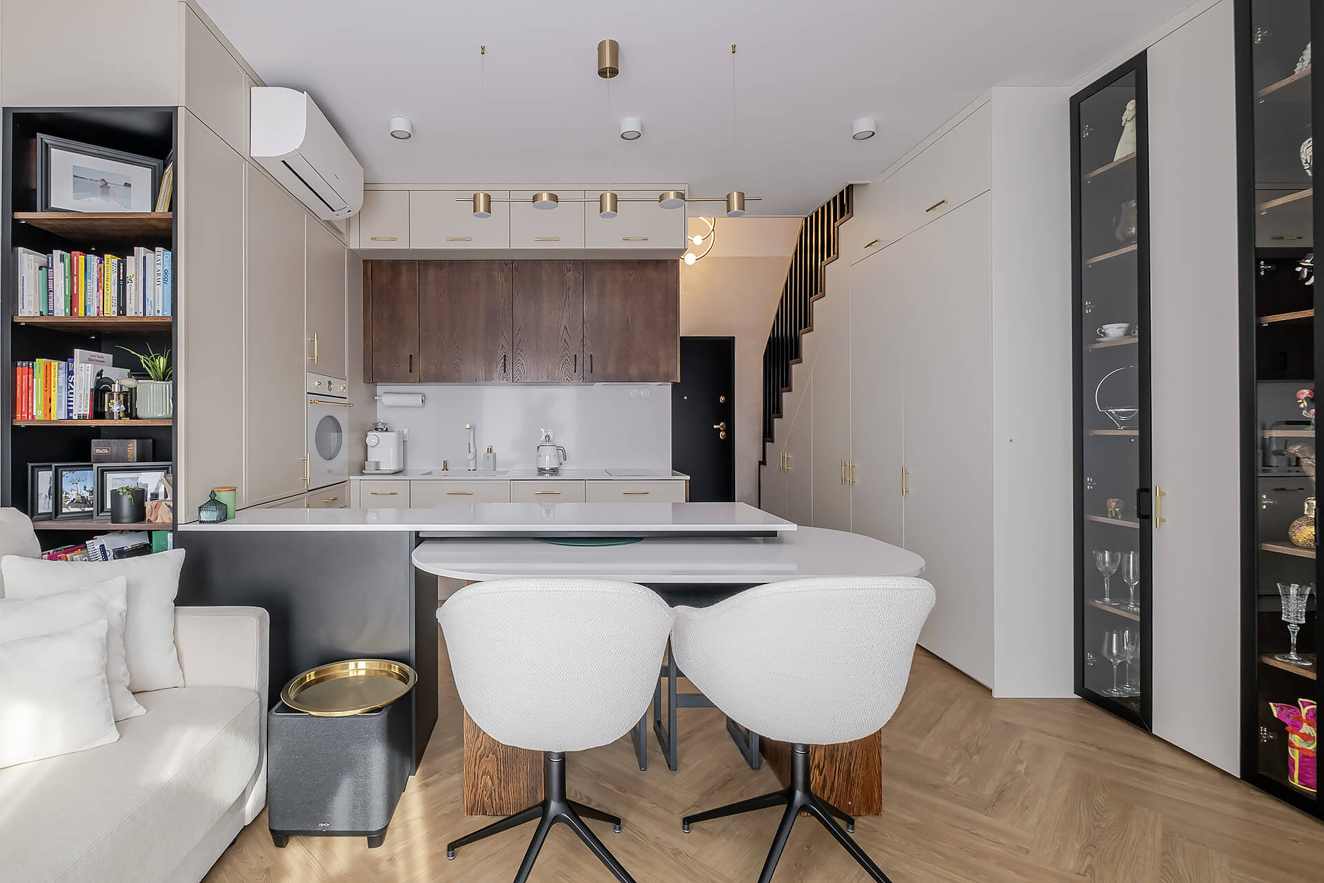Całość mieszkania została wykończona zgodnie z indywidualnym projektem. Wyposażenie w wysokim standardzie: wysokiej jakości sprzęty kuchenne, meble oraz zabudowy stolarskie i kamienne wykonane ręcznie, klimatyzacja z oddzielnym sterowaniem na obu poziomach.