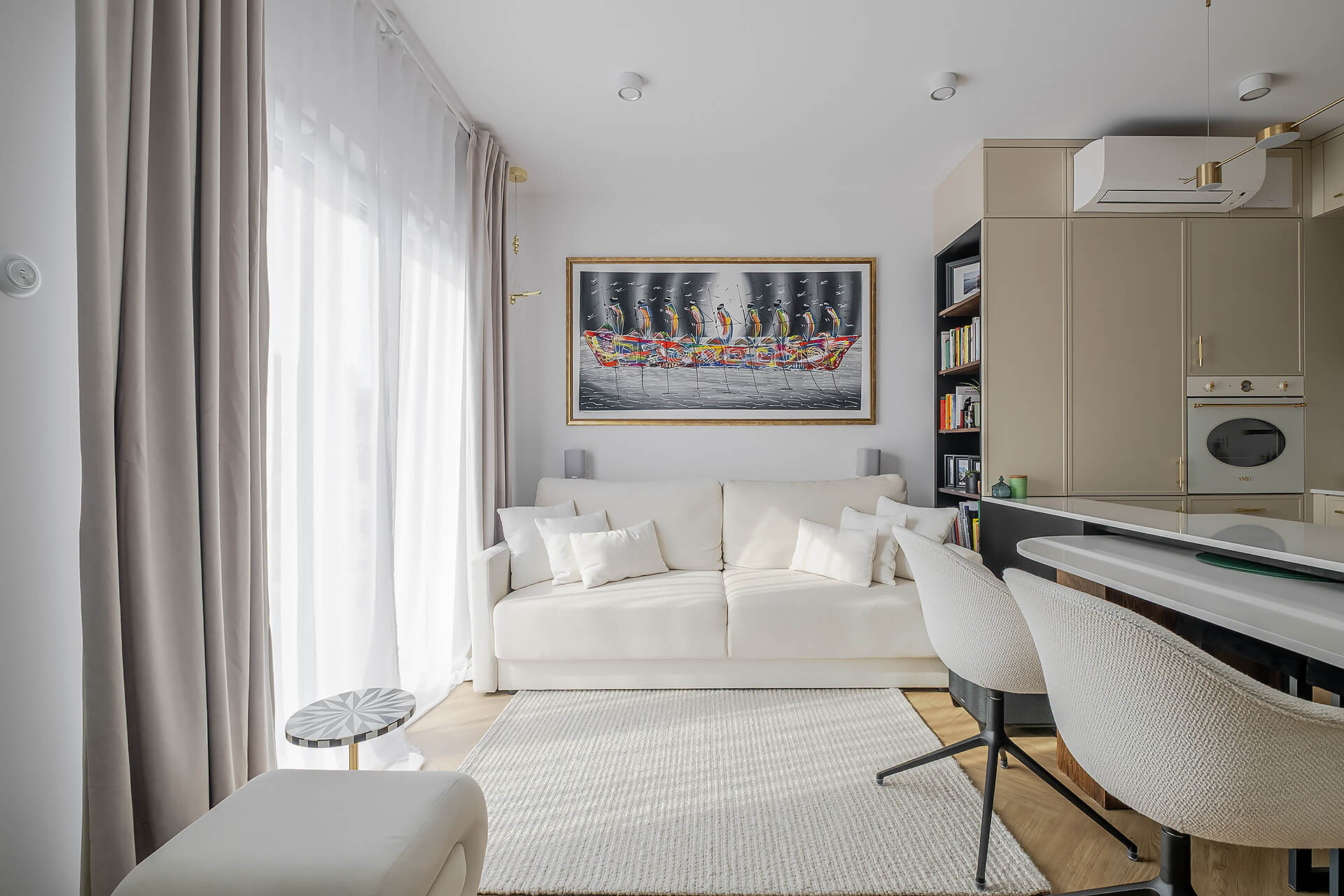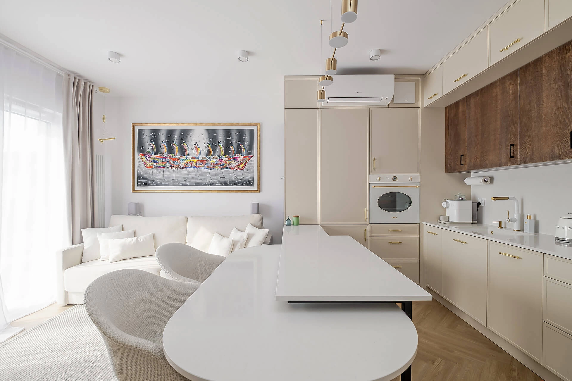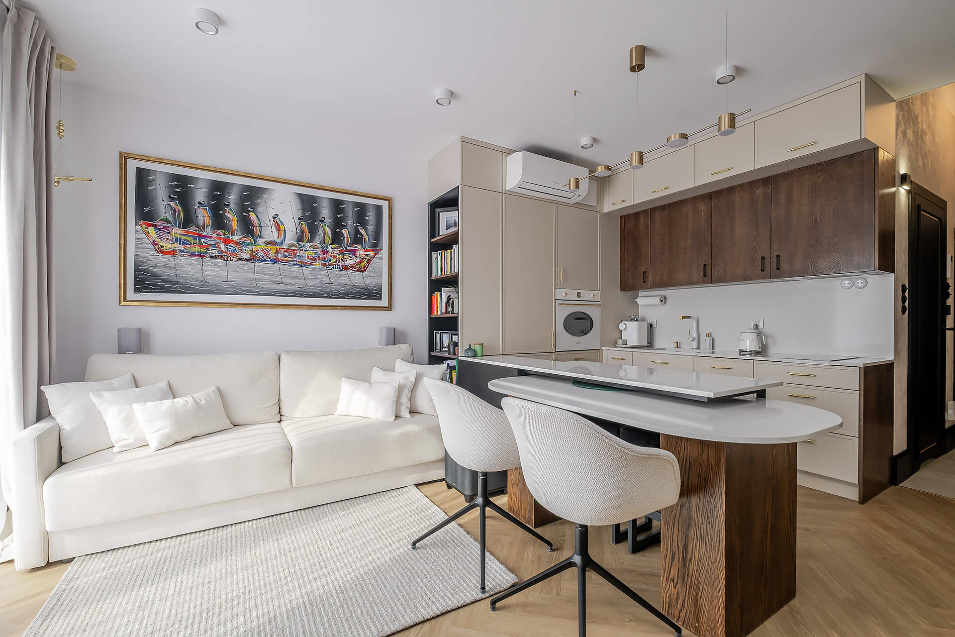 Całość mieszkania została wykończona zgodnie z indywidualnym projektem. Wyposażenie w wysokim standardzie: wysokiej jakości sprzęty kuchenne, meble oraz zabudowy stolarskie i kamienne wykonane ręcznie, klimatyzacja z oddzielnym sterowaniem na obu poziomach.
