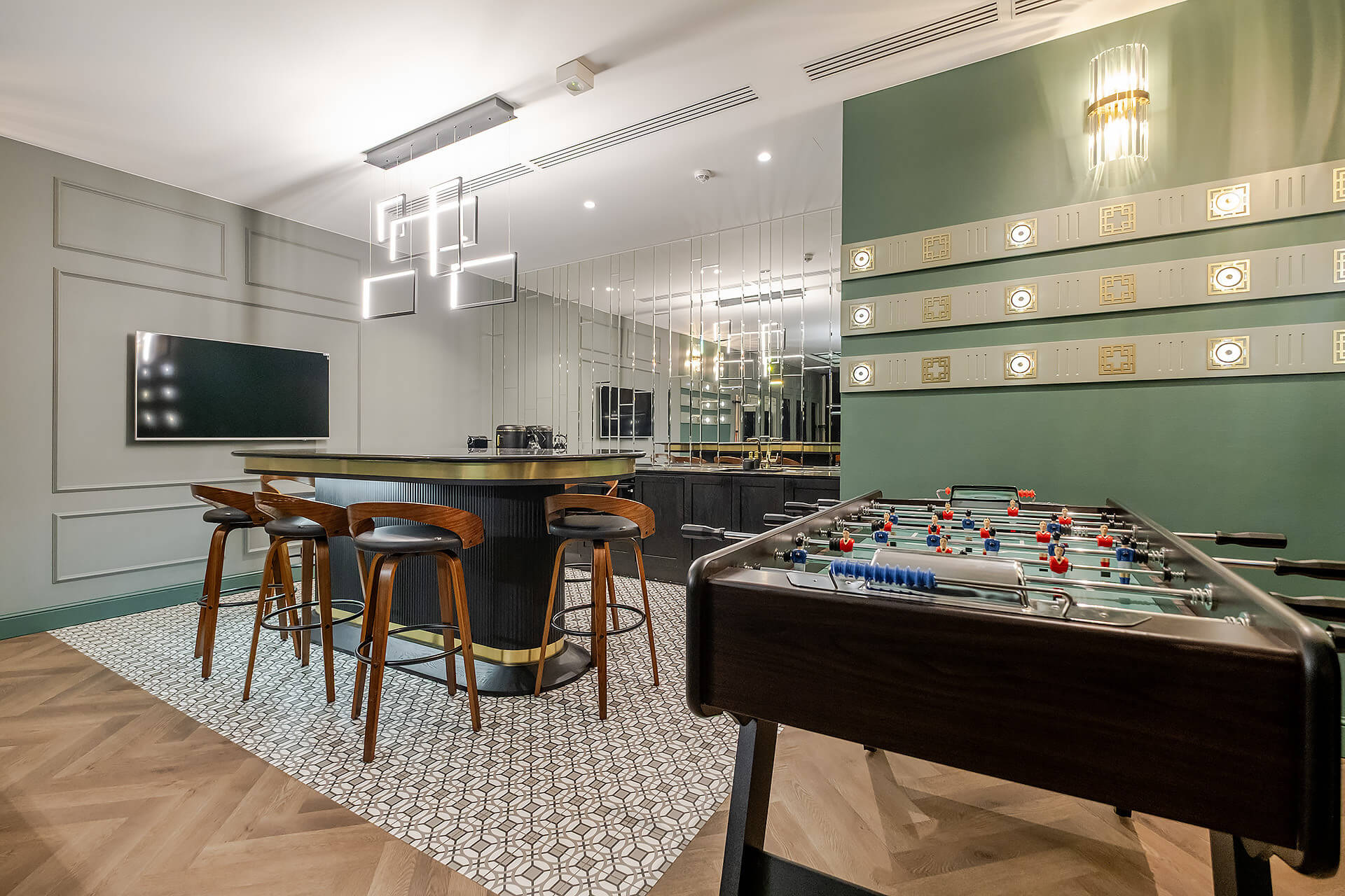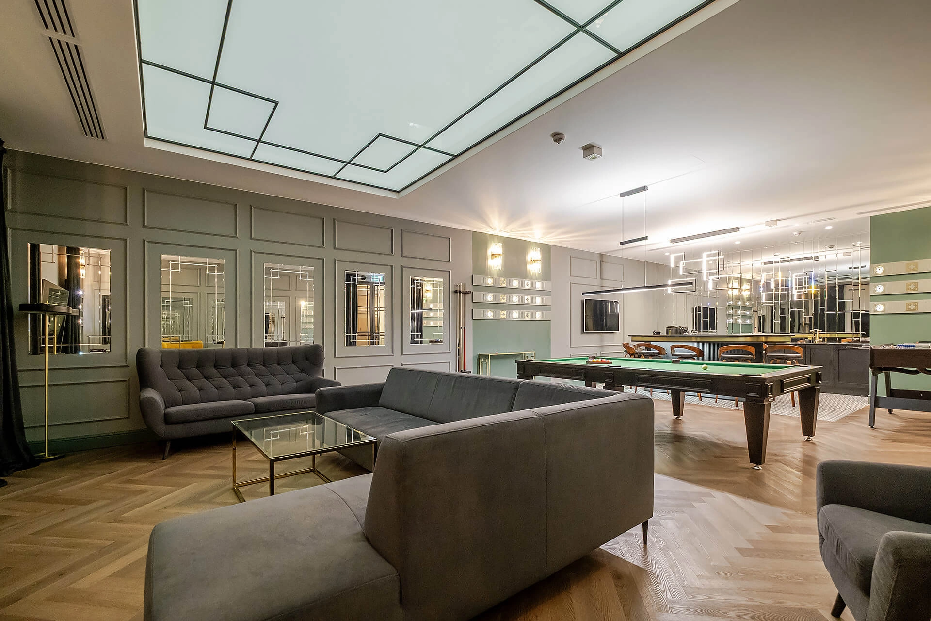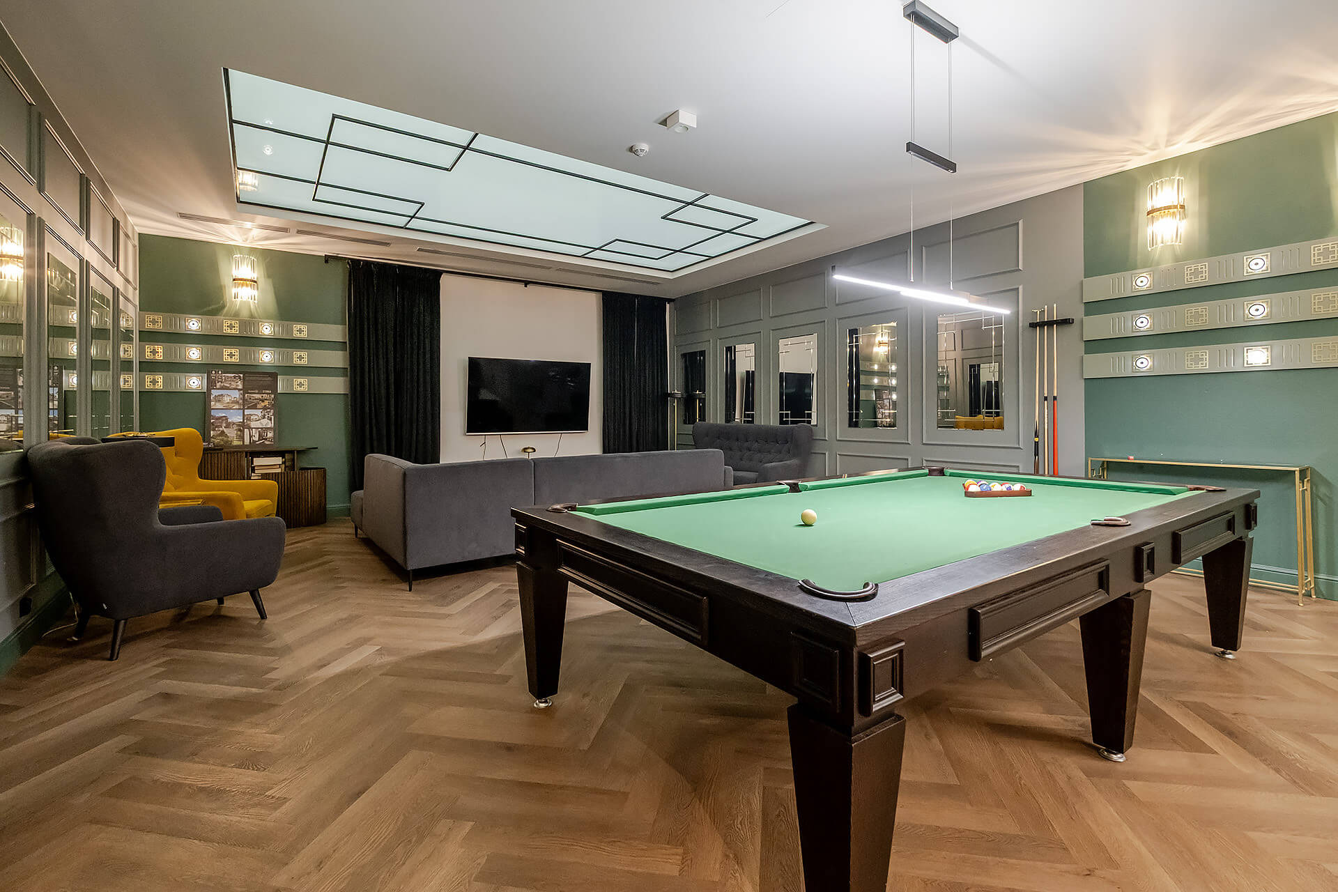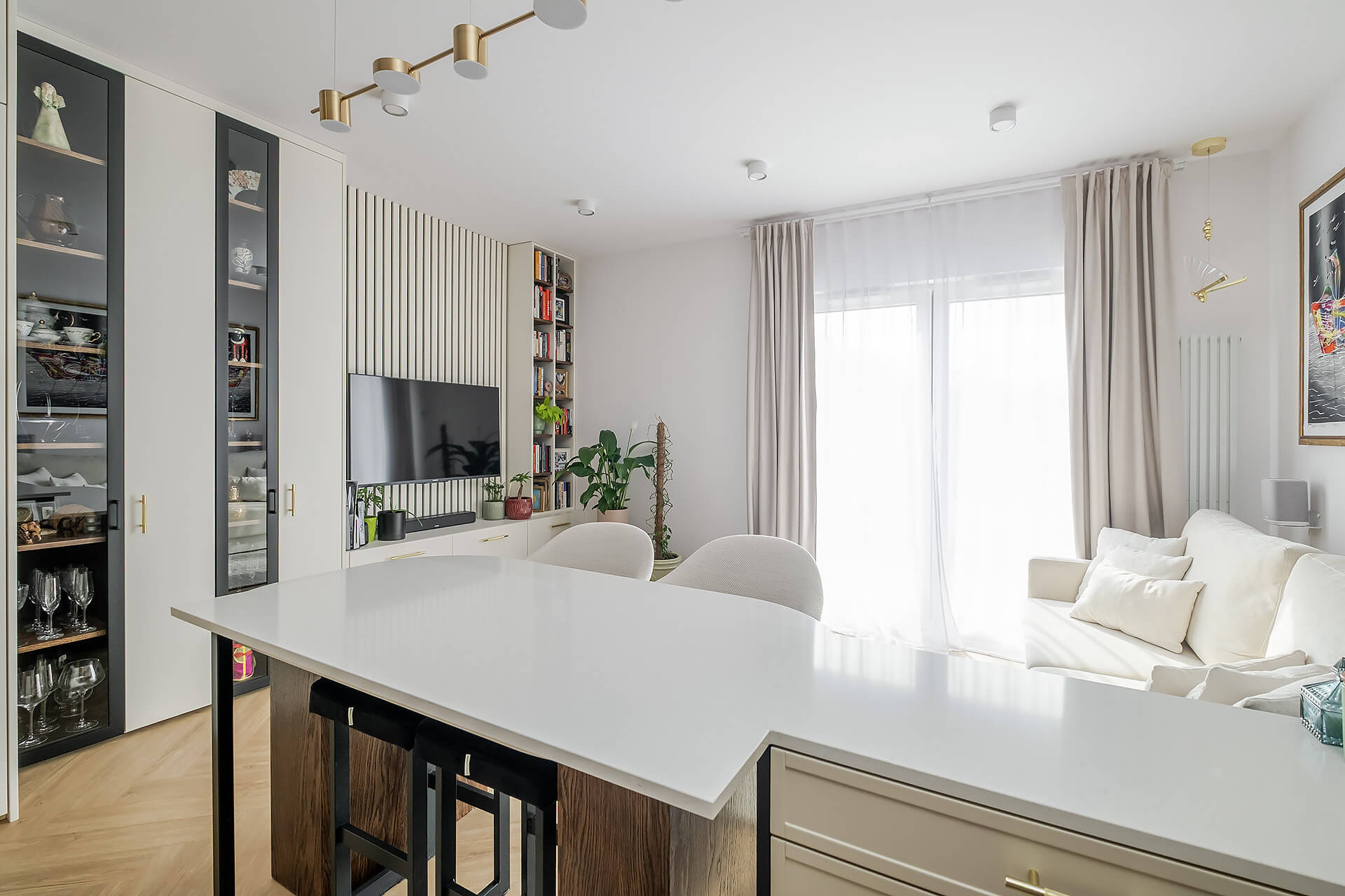 Całość mieszkania została wykończona zgodnie z indywidualnym projektem. Wyposażenie w wysokim standardzie: wysokiej jakości sprzęty kuchenne, meble oraz zabudowy stolarskie i kamienne wykonane ręcznie, klimatyzacja z oddzielnym sterowaniem na obu poziomach.