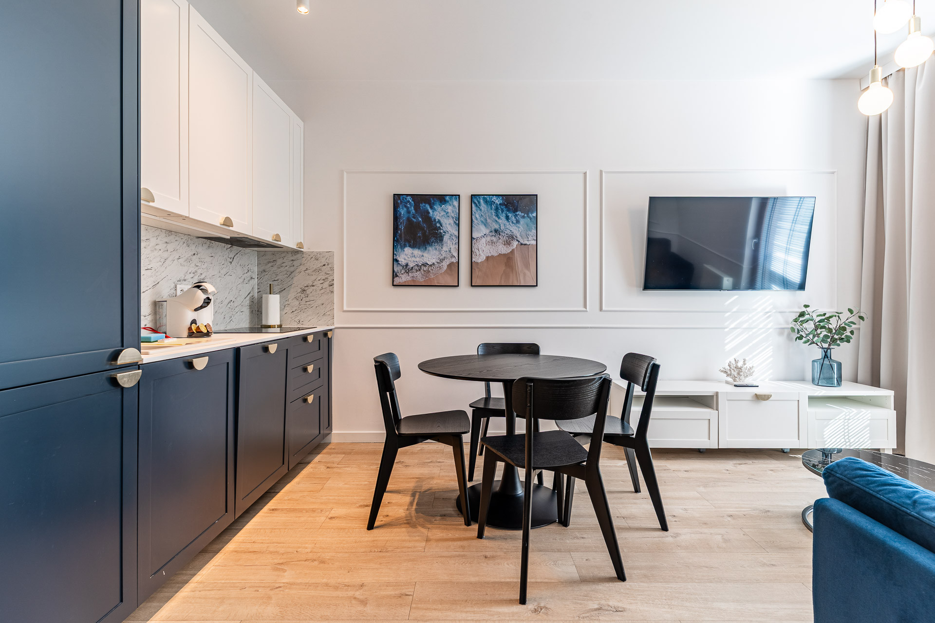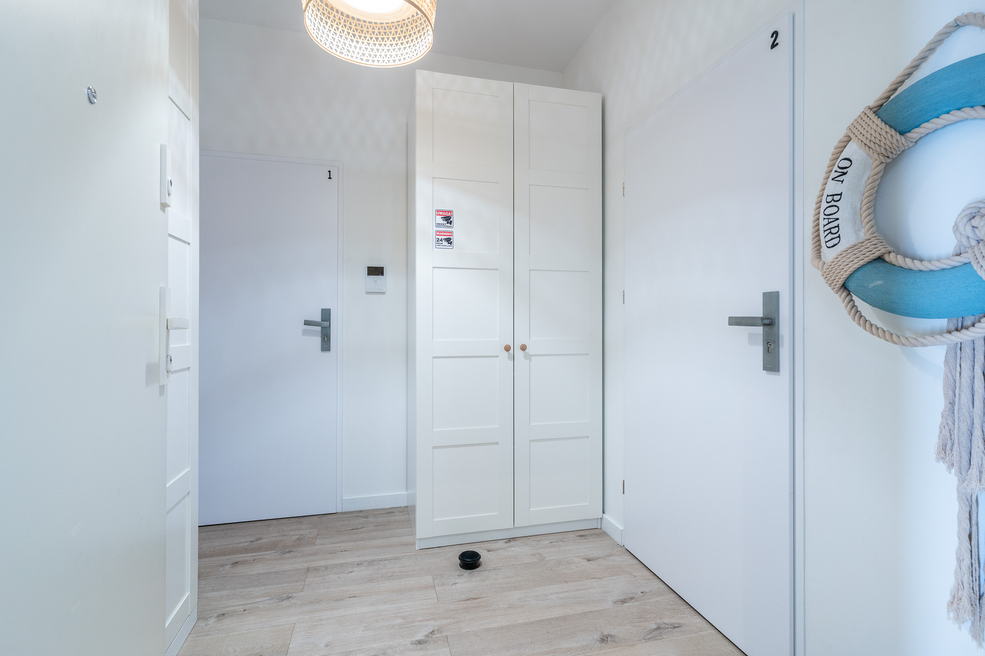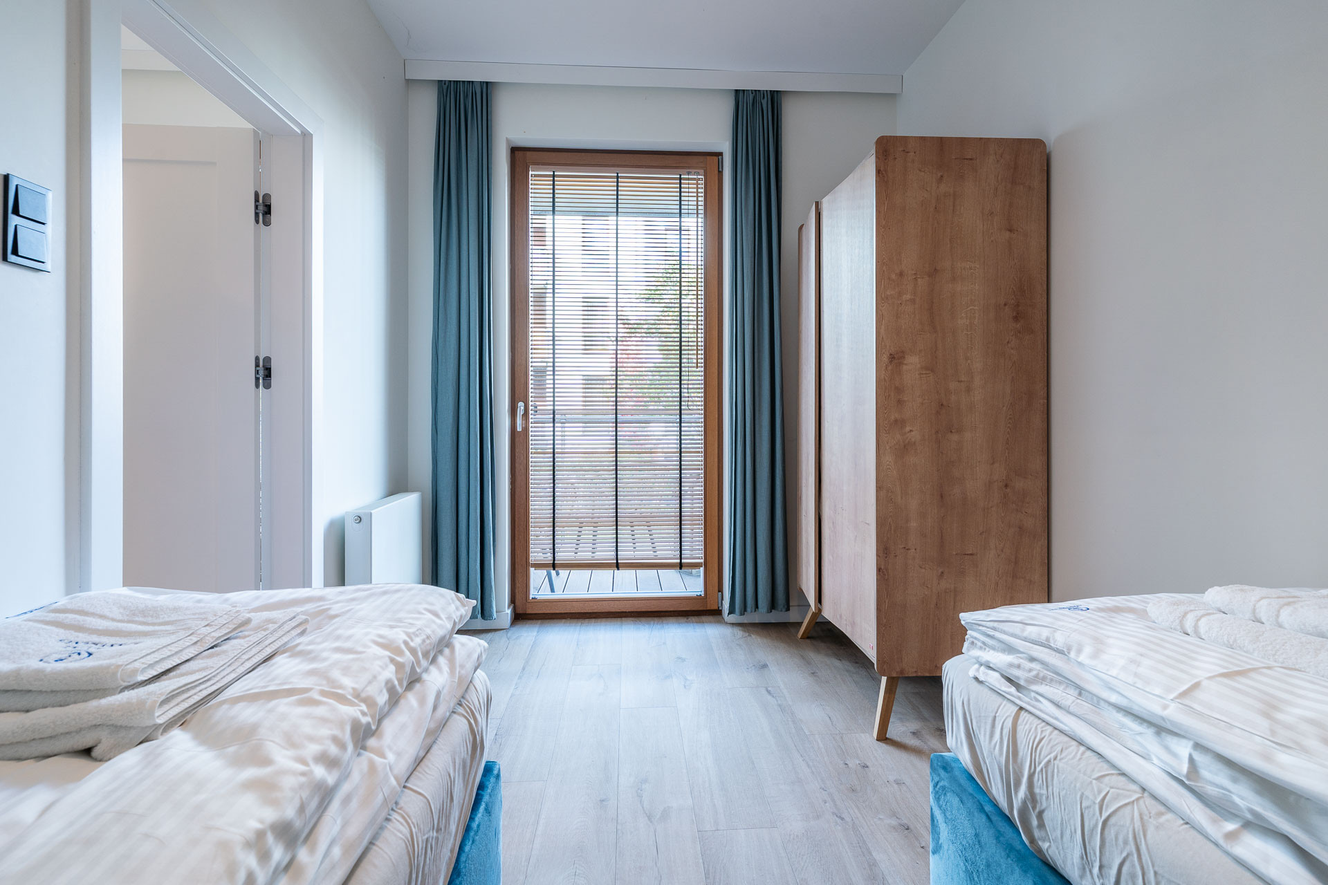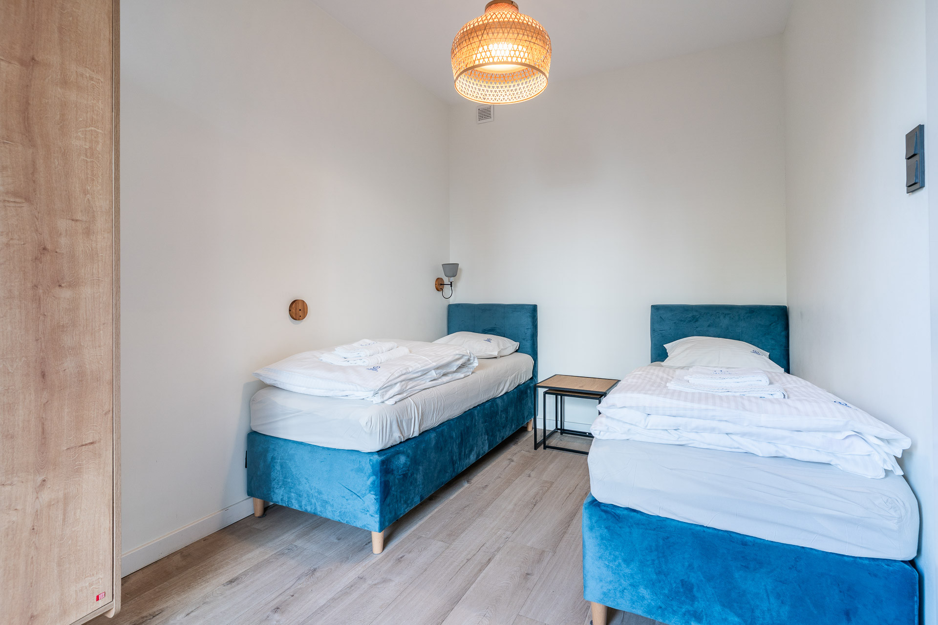 znajduje się na 1. piętrze kameralnego budynku i został urządzony w jasnym, nadmorskim stylu z dbałością o każdy detal. Wnętrze utrzymane jest w spójnej kolorystyce bieli, błękitu i naturalnego drewna, tworząc atmosferę komfortu i relaksu.