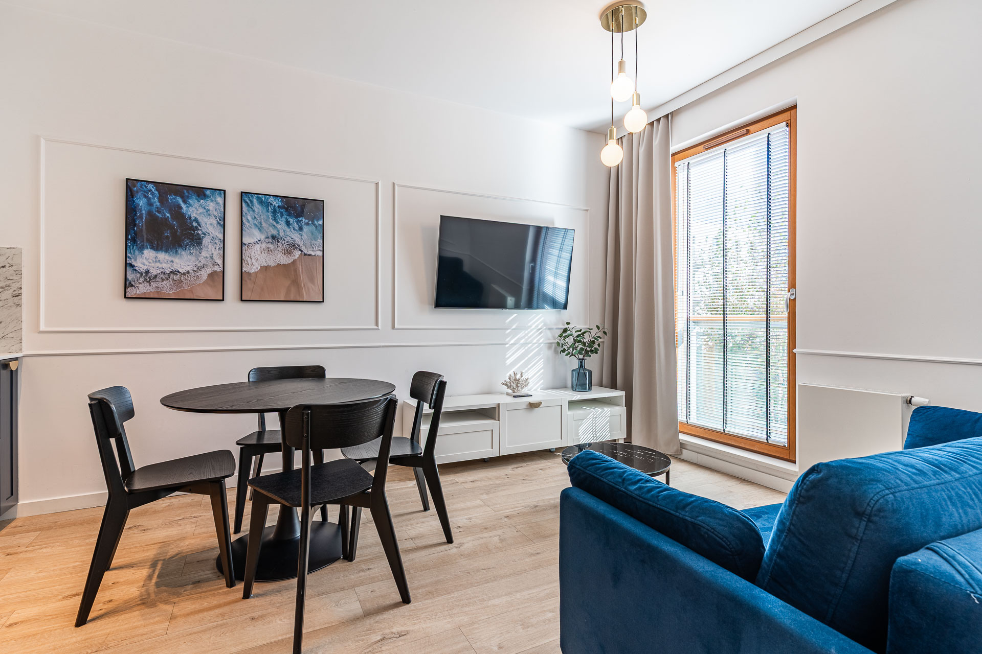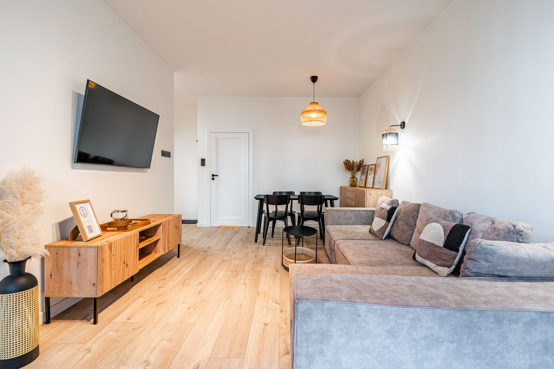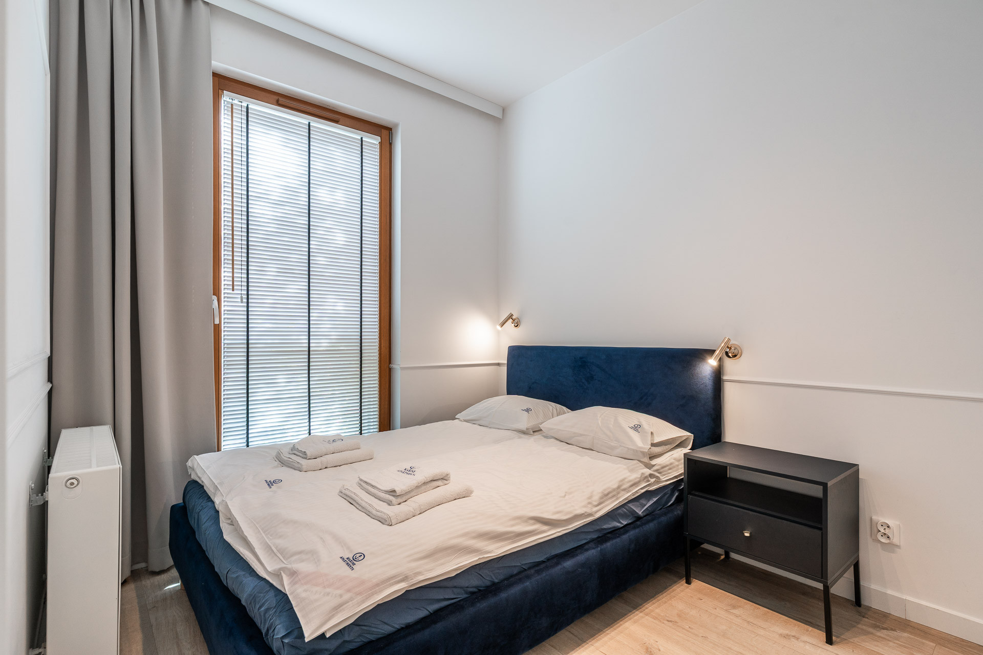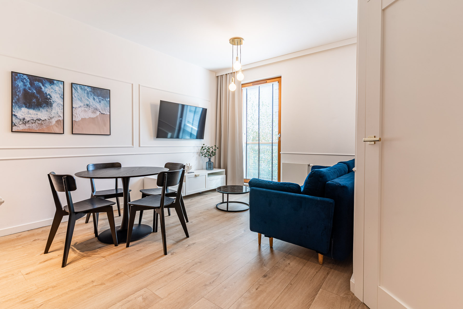 znajduje się na 1. piętrze kameralnego budynku i został urządzony w jasnym, nadmorskim stylu z dbałością o każdy detal. Wnętrze utrzymane jest w spójnej kolorystyce bieli, błękitu i naturalnego drewna, tworząc atmosferę komfortu i relaksu.