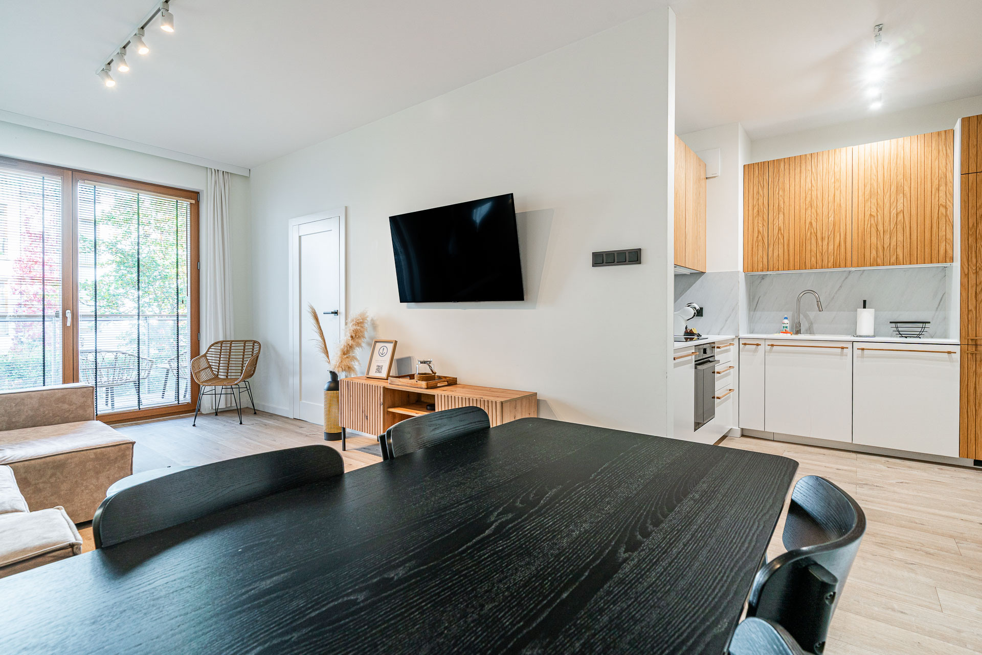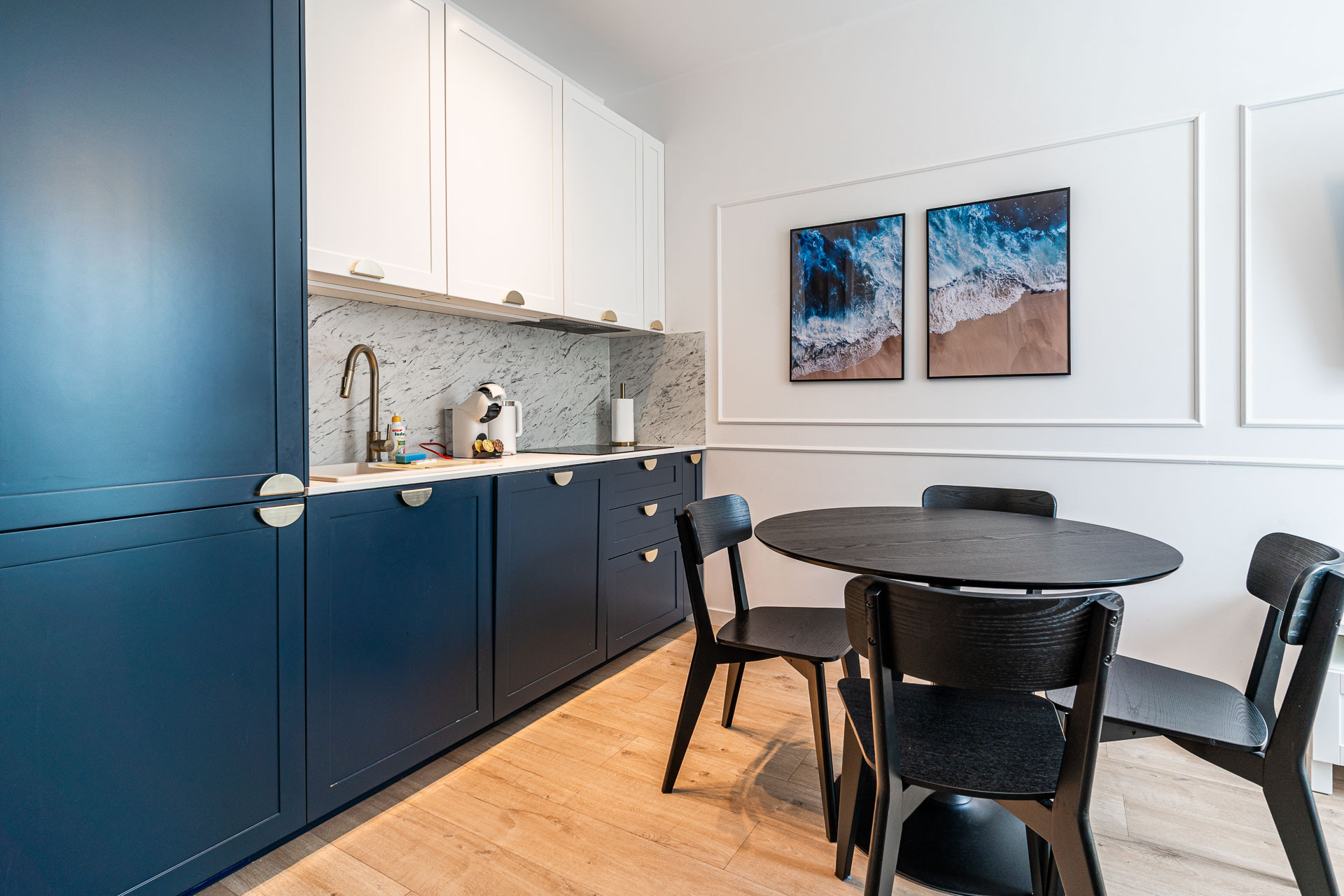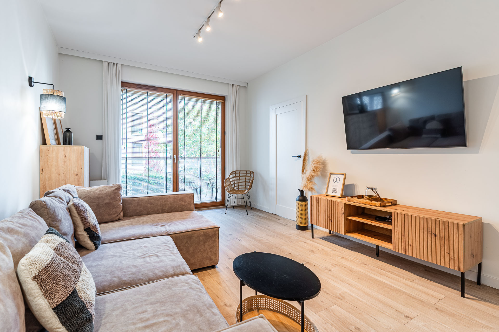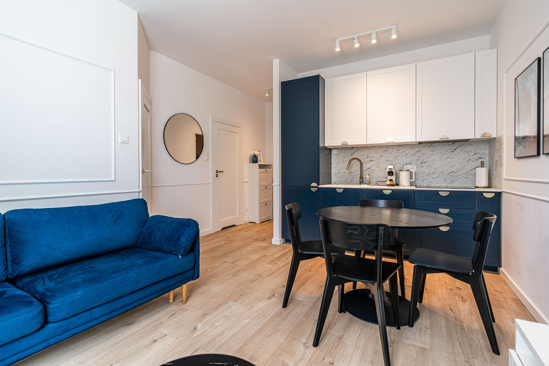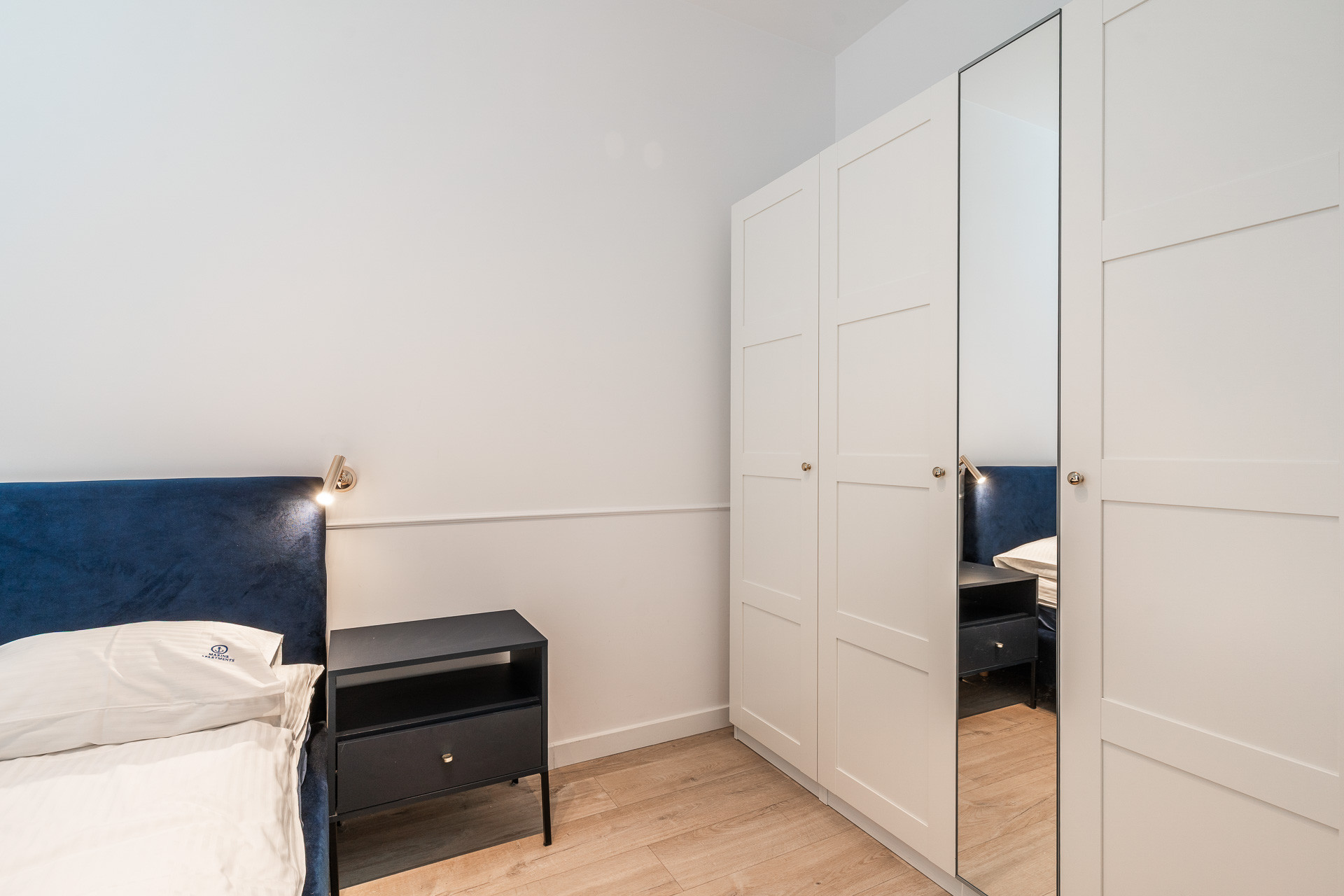 znajduje się na 1. piętrze kameralnego budynku i został urządzony w jasnym, nadmorskim stylu z dbałością o każdy detal. Wnętrze utrzymane jest w spójnej kolorystyce bieli, błękitu i naturalnego drewna, tworząc atmosferę komfortu i relaksu.