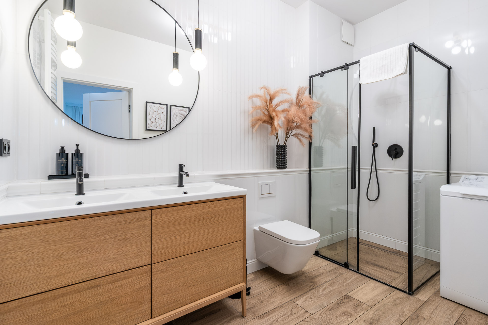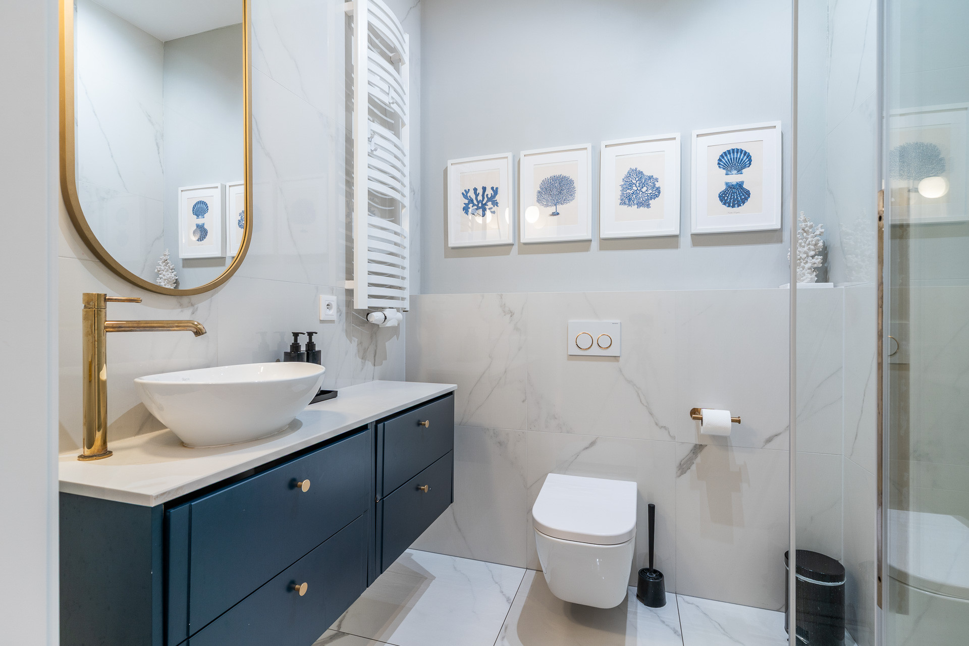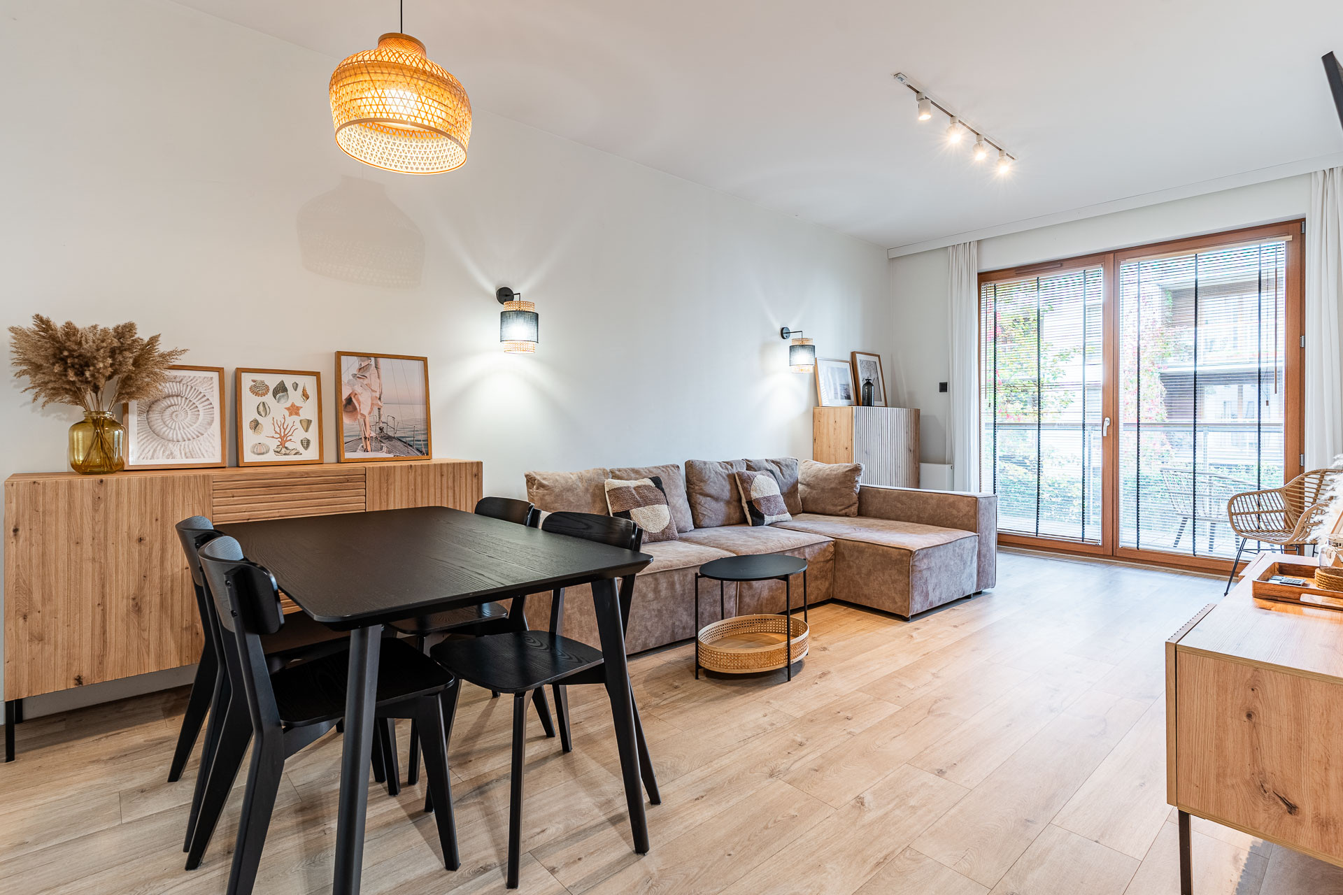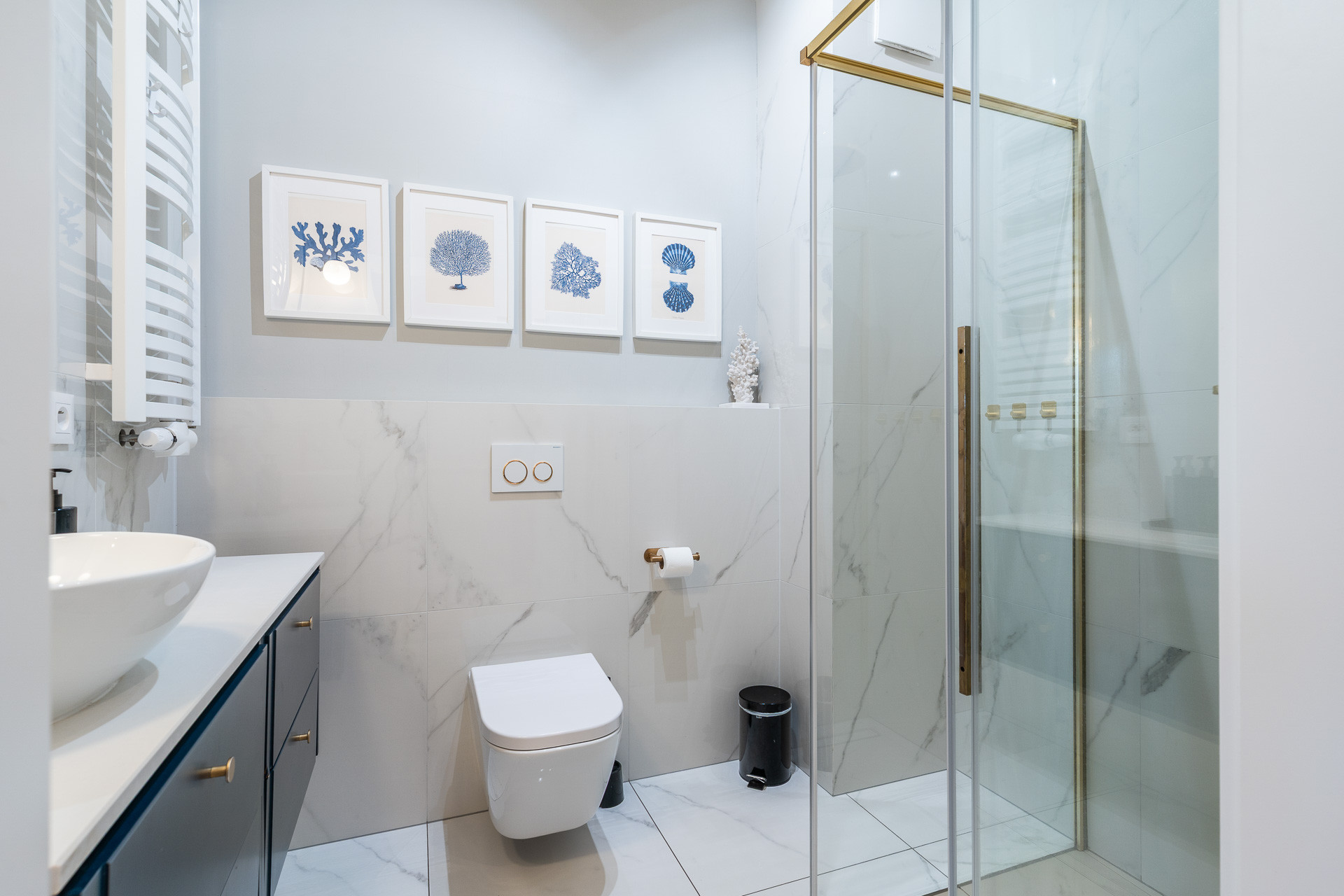 znajduje się na 1. piętrze kameralnego budynku i został urządzony w jasnym, nadmorskim stylu z dbałością o każdy detal. Wnętrze utrzymane jest w spójnej kolorystyce bieli, błękitu i naturalnego drewna, tworząc atmosferę komfortu i relaksu.