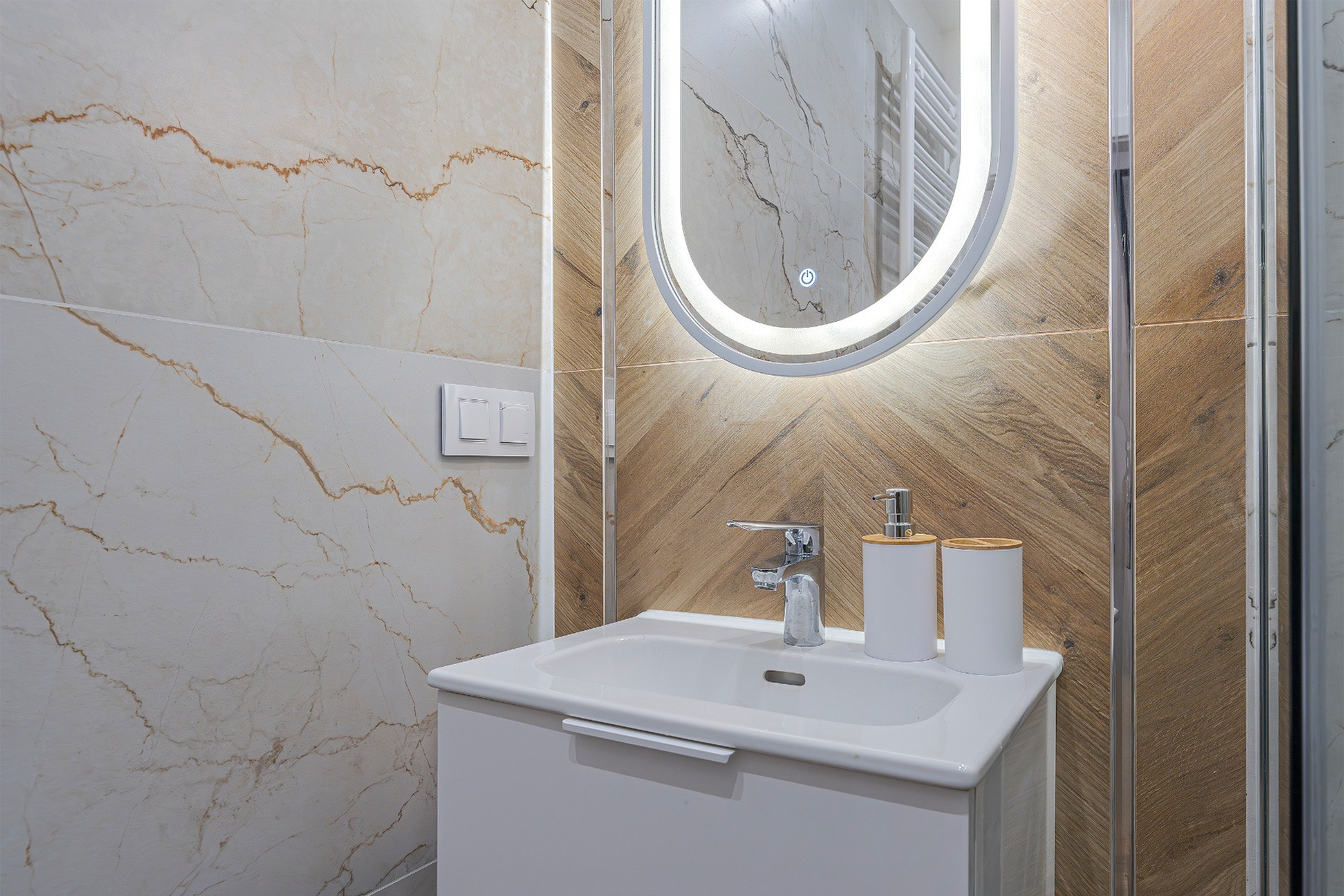 – łazienka z WC, prysznicem, umywalką, lustrem, grzejnikiem drabinkowym,