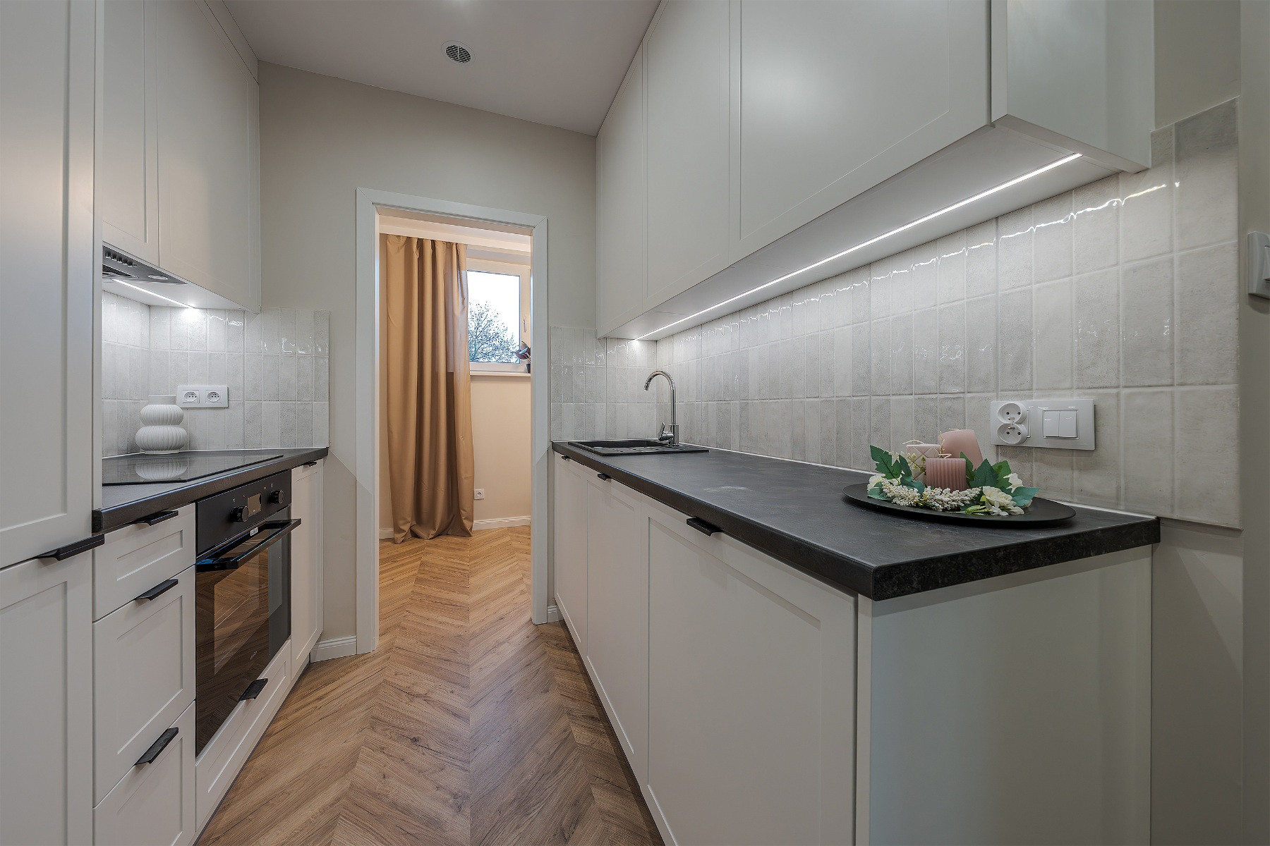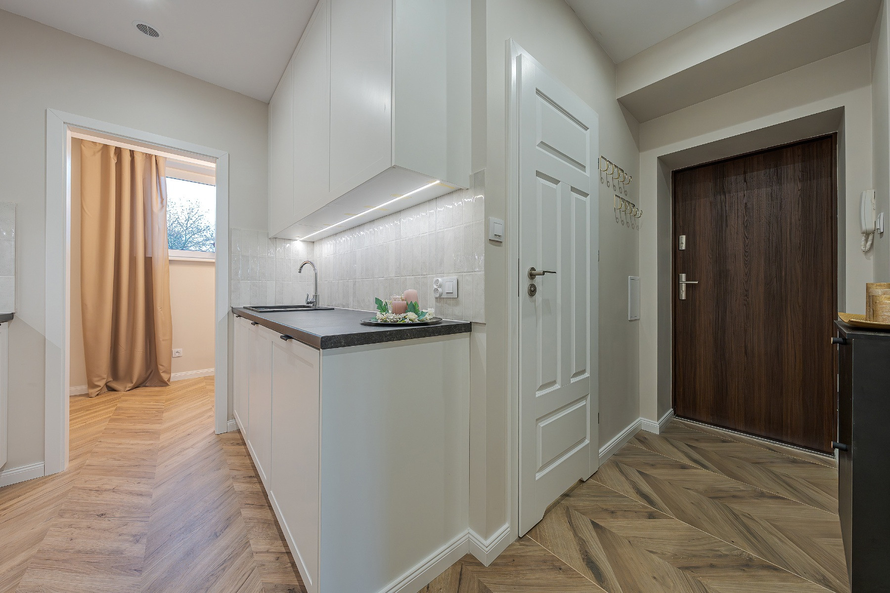 – kuchnia z meblami w zabudowie i częściowym wyposażeniem w sprzęt AGD,