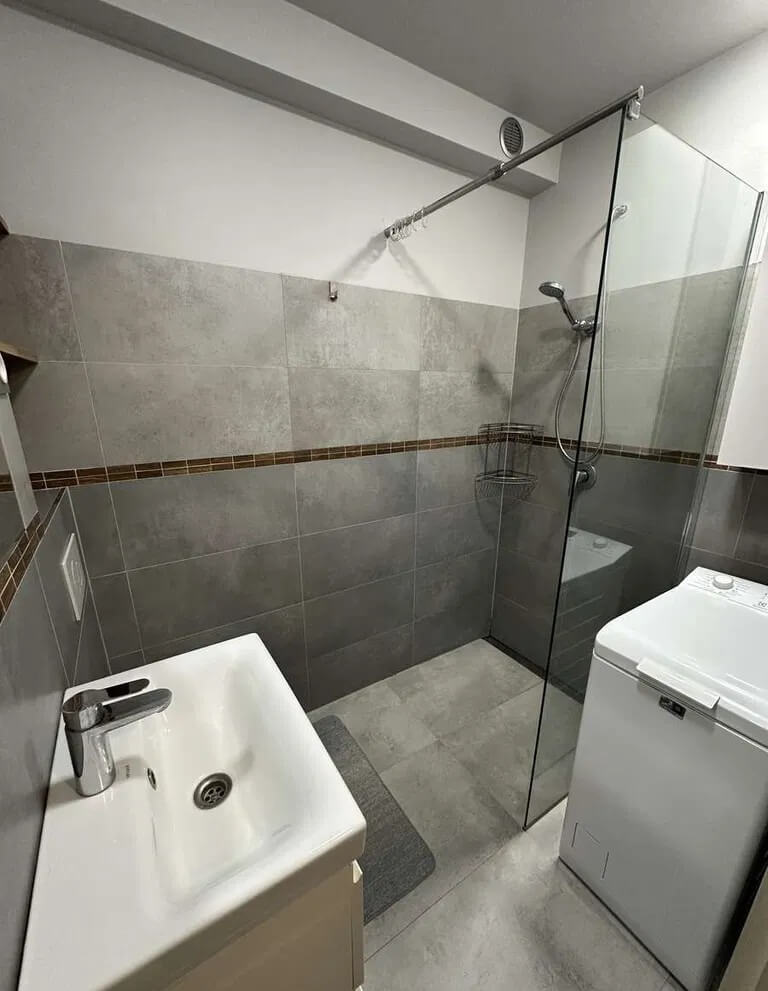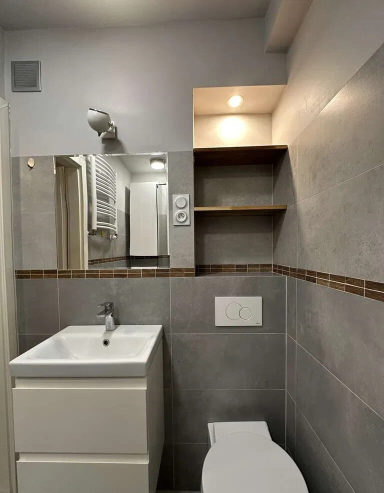 – łazienka z WC, prysznicem, umywalką, lustrem,