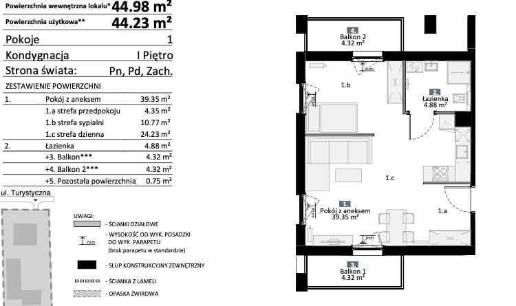 Komfortowy, 2-pokojowy wykończony pod klucz apartament, o powierzchni użytkowej wynoszącej 44.23 m2.