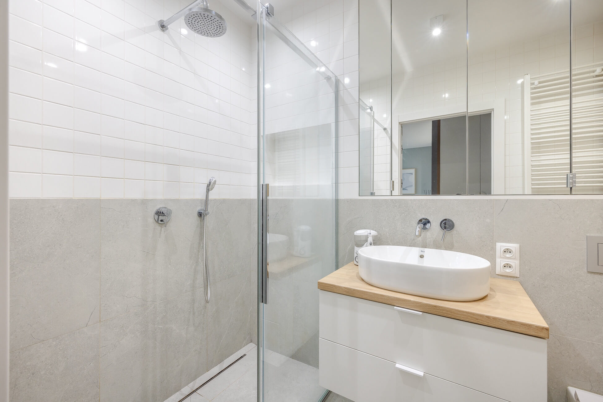 – łazienka (4,97 m2) z WC, prysznicem bezprogowym, umywalką, lustrem, grzejnikiem drabinkowym,