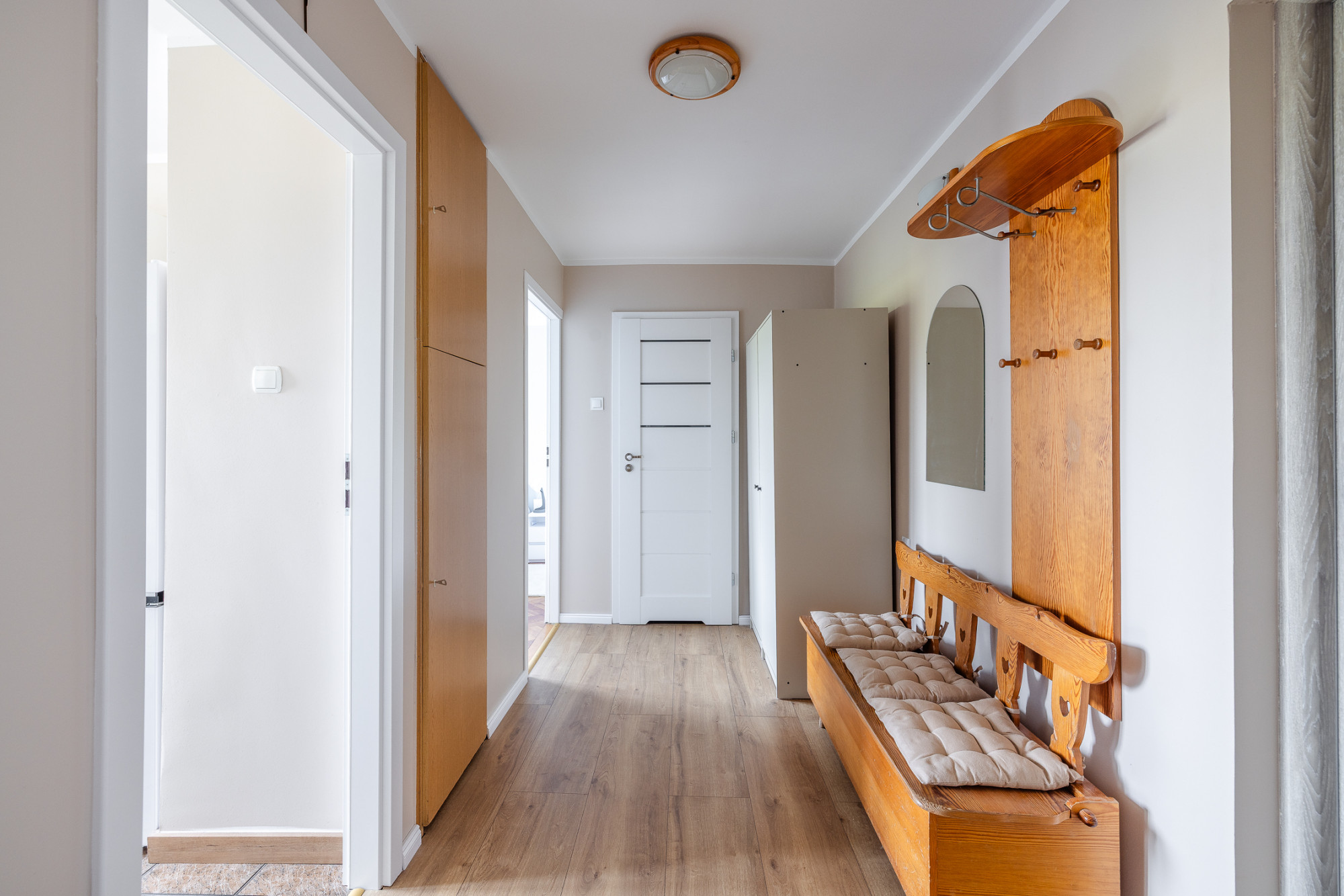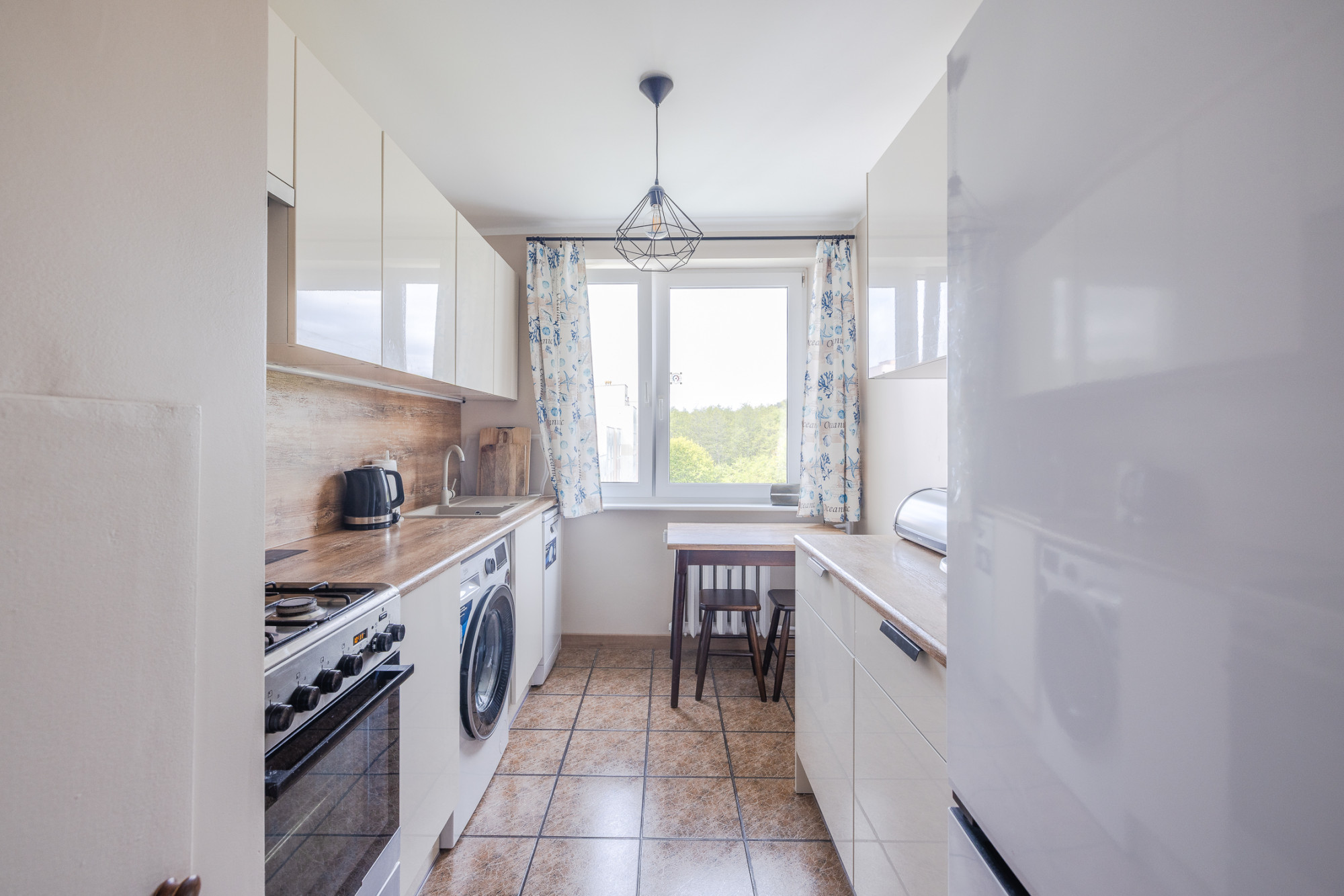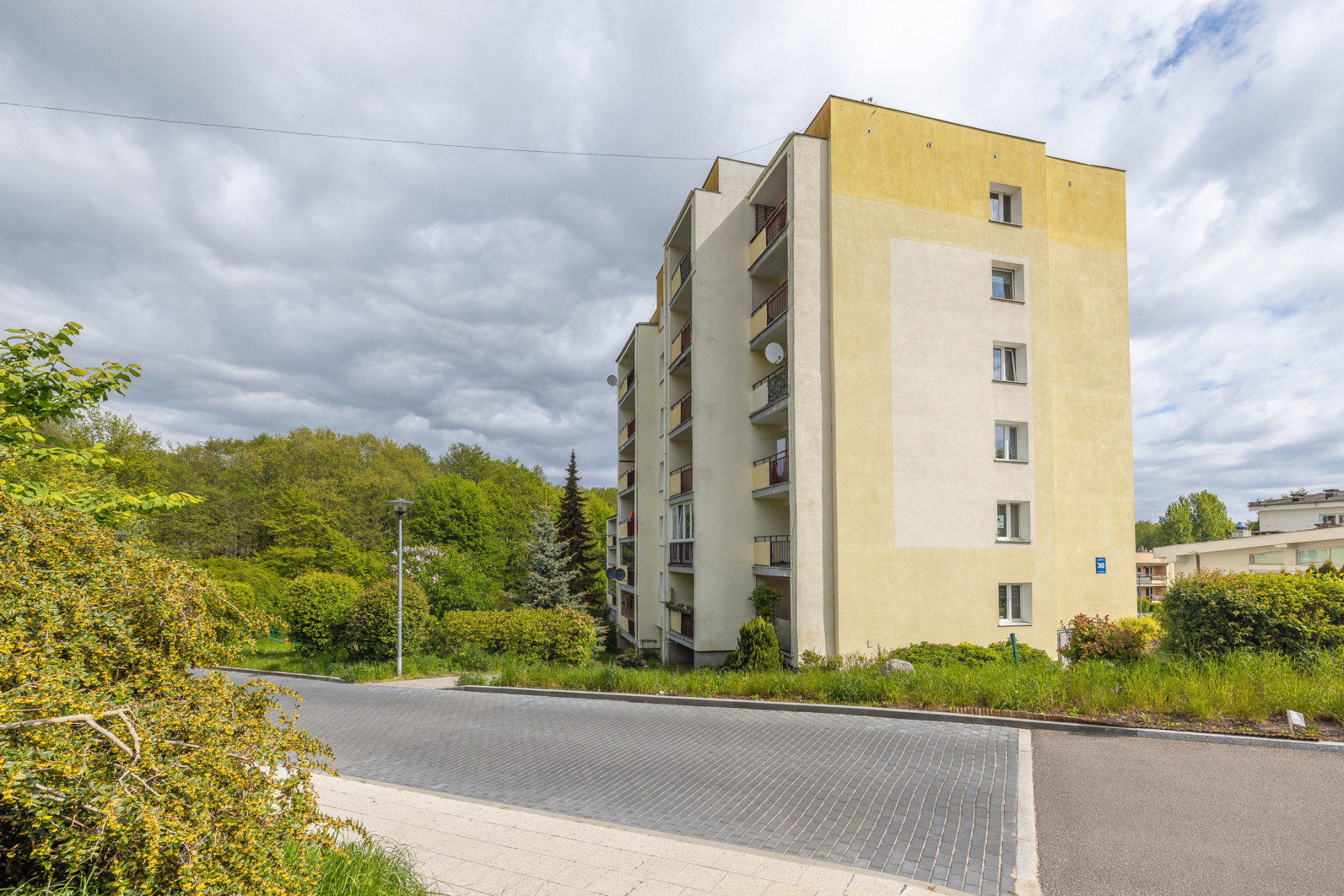 Wyremontowane dwupokojowe mieszkanie z klimatyzacją i ekspozycją południowo-zachodnią. Duże okna w salonie zapewniają mnóstwo naturalnego światła oraz piękny widok na zachody słońca i pobliski las. Wnętrze wyróżnia się eleganckim, dębowym parkietem, który nadaje przestrzeni ciepła. Mieszkanie wyposażone jest w nowe sprzęty AGD, objęte gwarancją. Korzystny układ umożliwia ewentualną modyfikację na mieszkanie trzypokojowe.