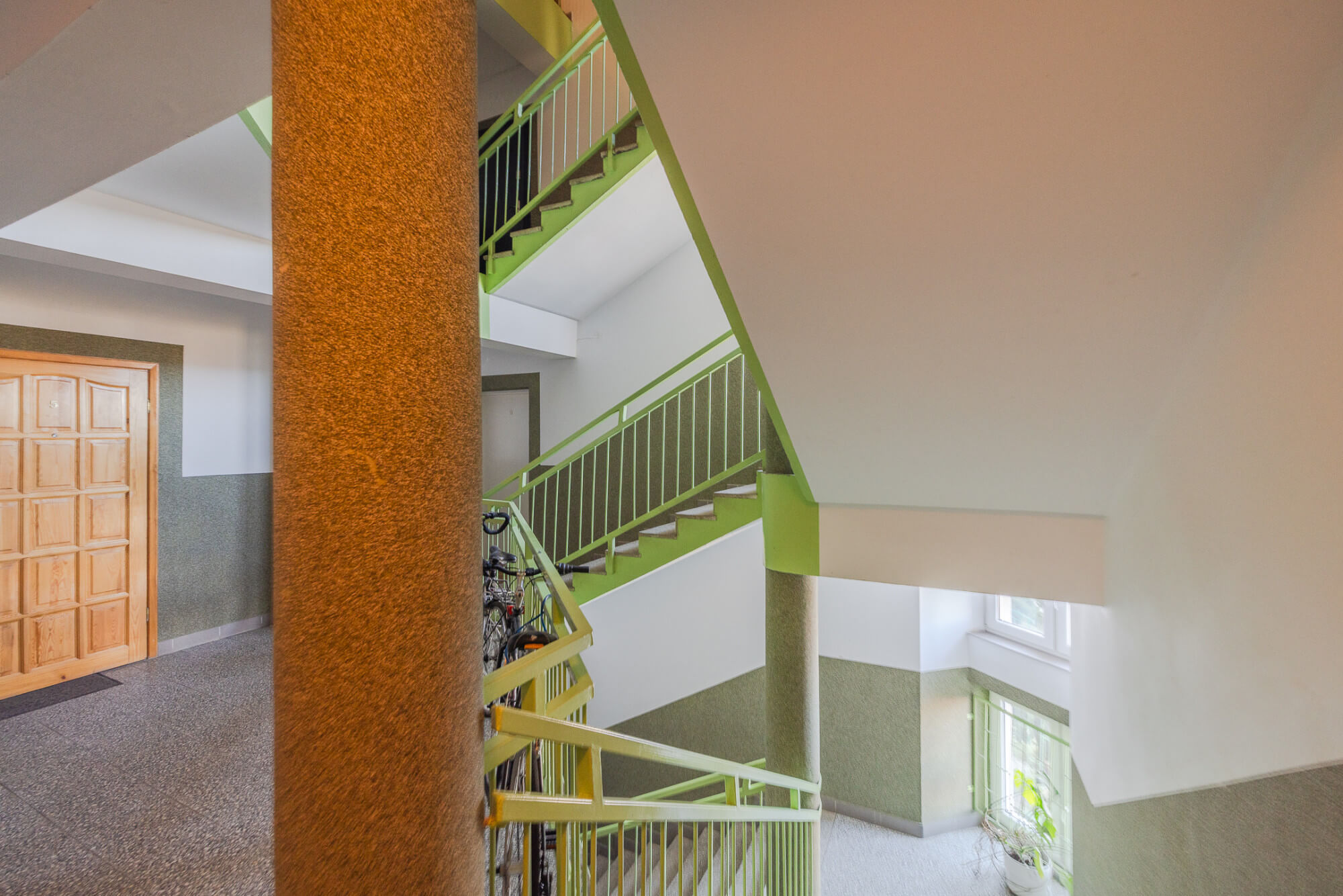 Mieszkanie mieści się na 1 piętrze 4-piętrowego bloku mieszkalnego powstałego w 1999 r. Wybudowano go z cegły. Stan całej nieruchomości należy uznać za dobry. Klatka schodowa zadbana, szeroka, a wejście do niej zabezpieczone domofonem. W pobliżu nieruchomości znajdziemy ogólnodostępne miejsca postojowe.