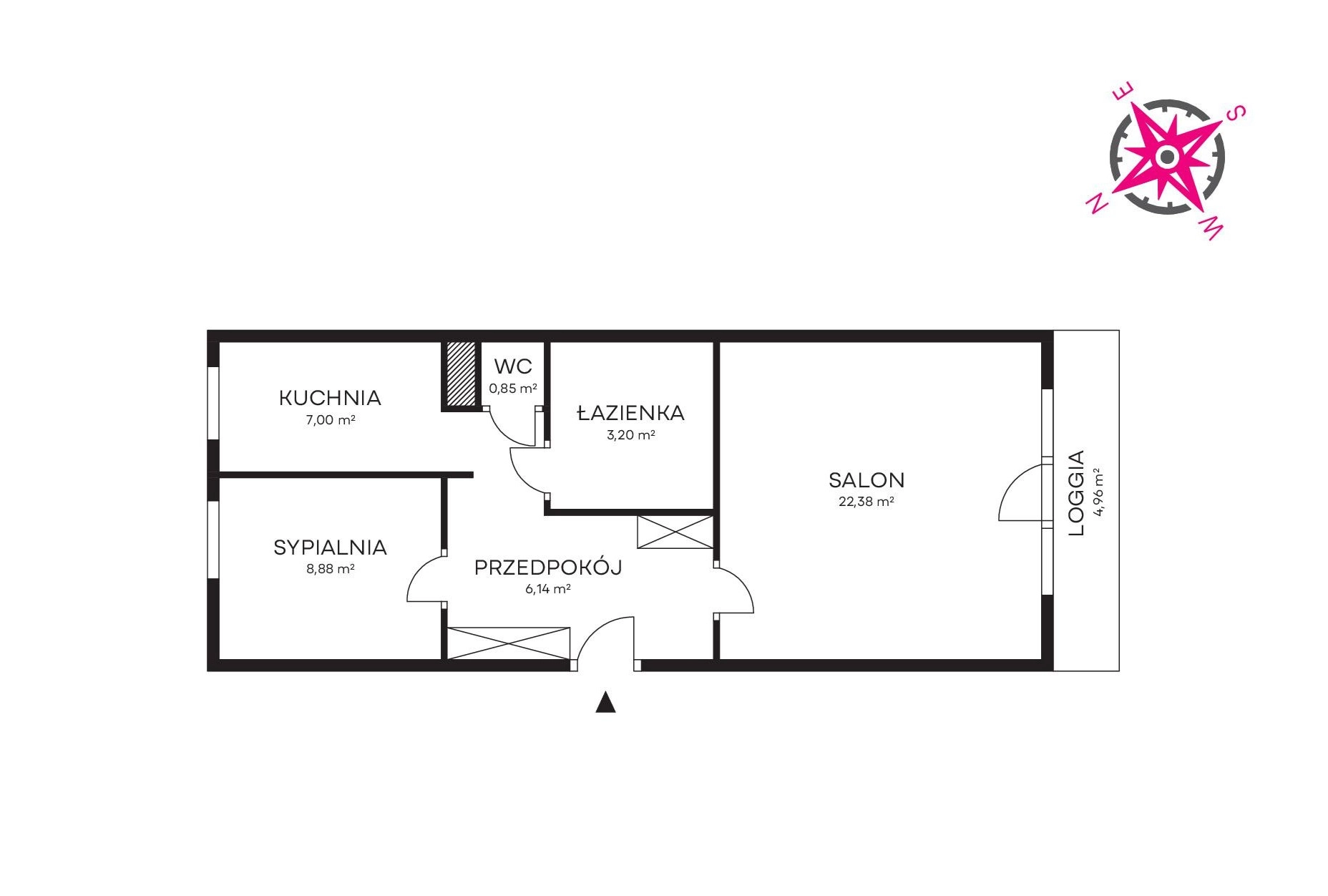 – salon (22,38 m2) z wyjściem na loggię (4,96 m2),
