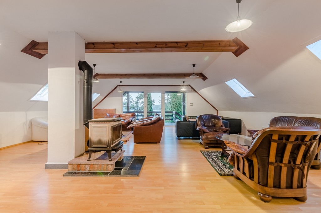 – parter: duży salon z aneksem o łącznej pow. ok. 67 m2! z wyjściem na taras i widokiem na jezioro; pomieszczenie gospodarcze (pralnia), WC,