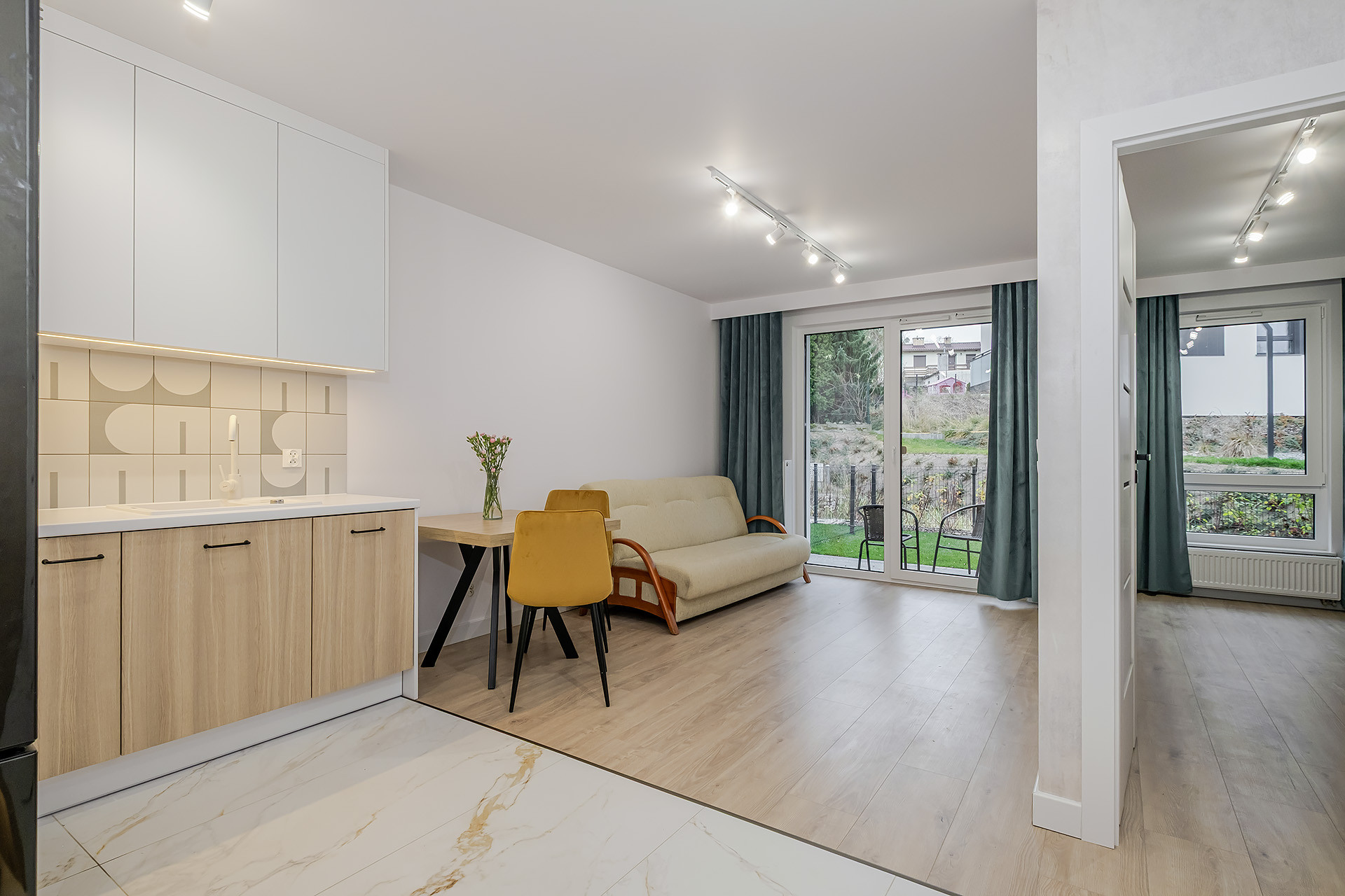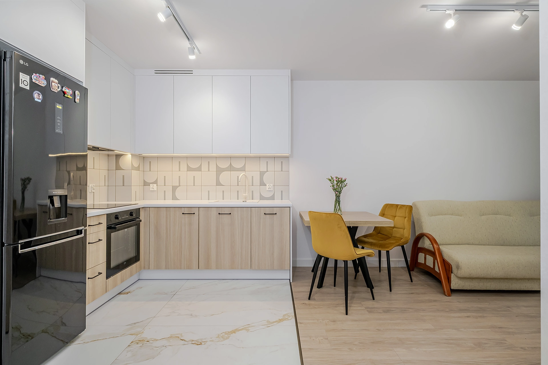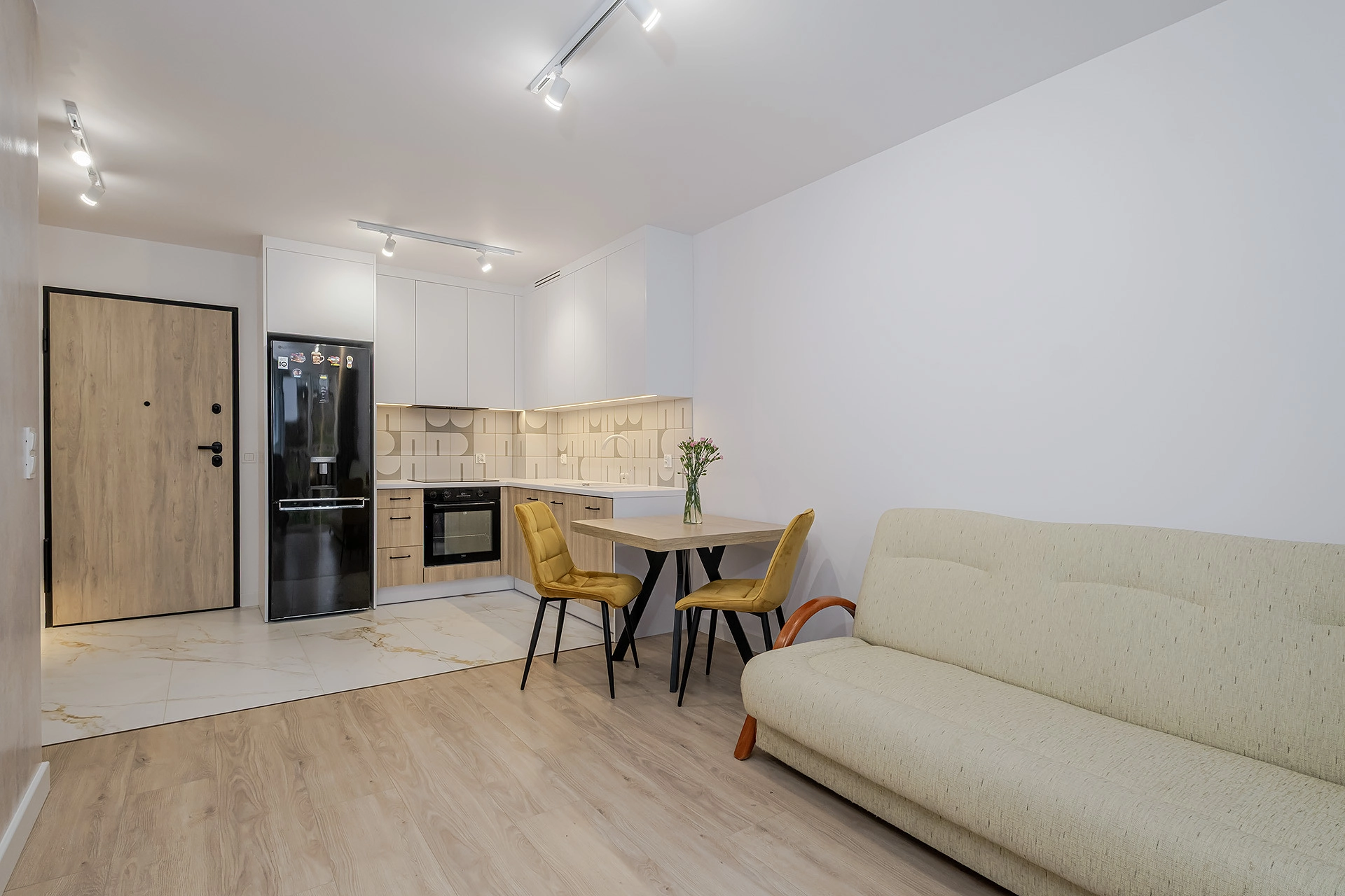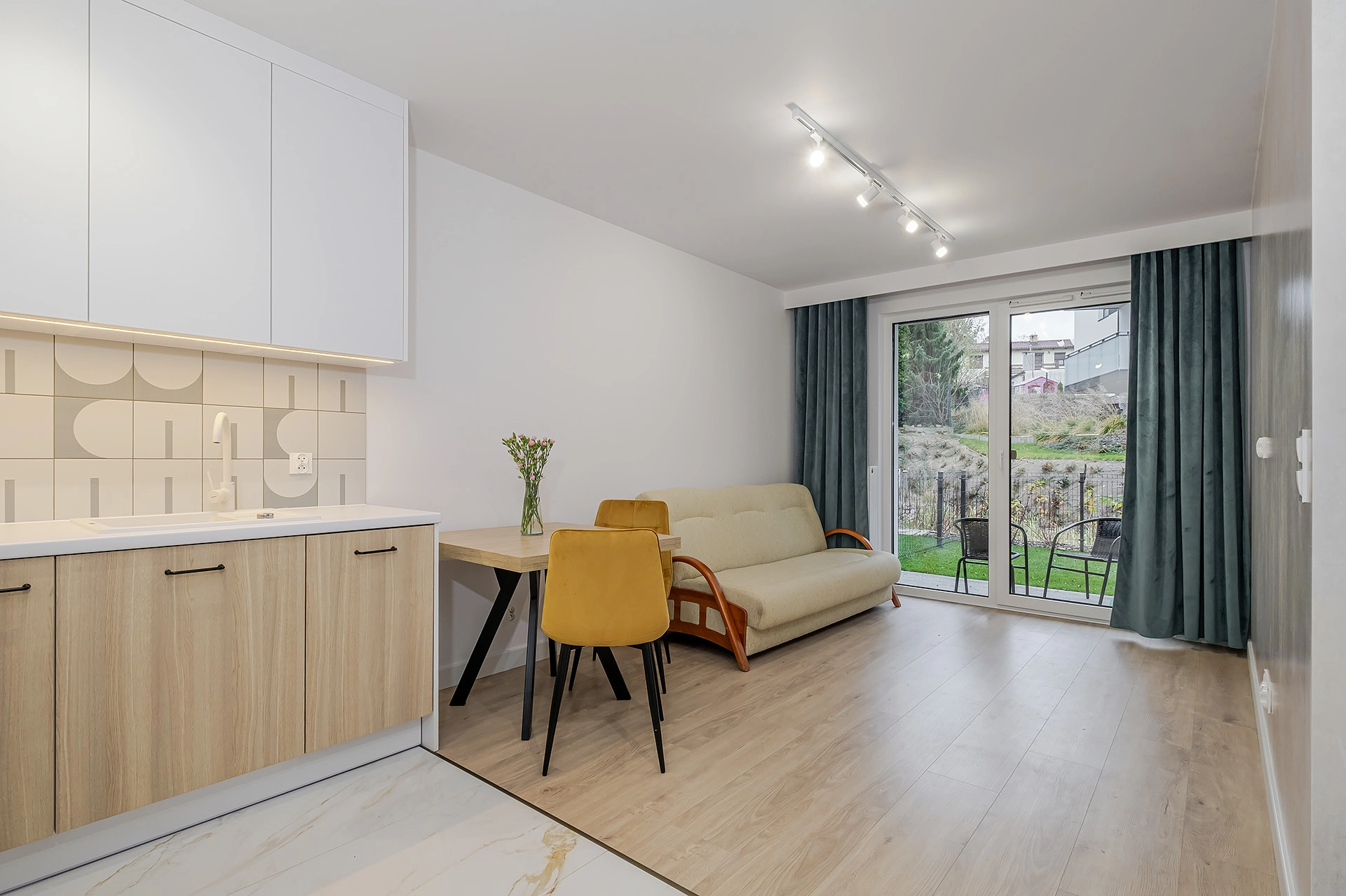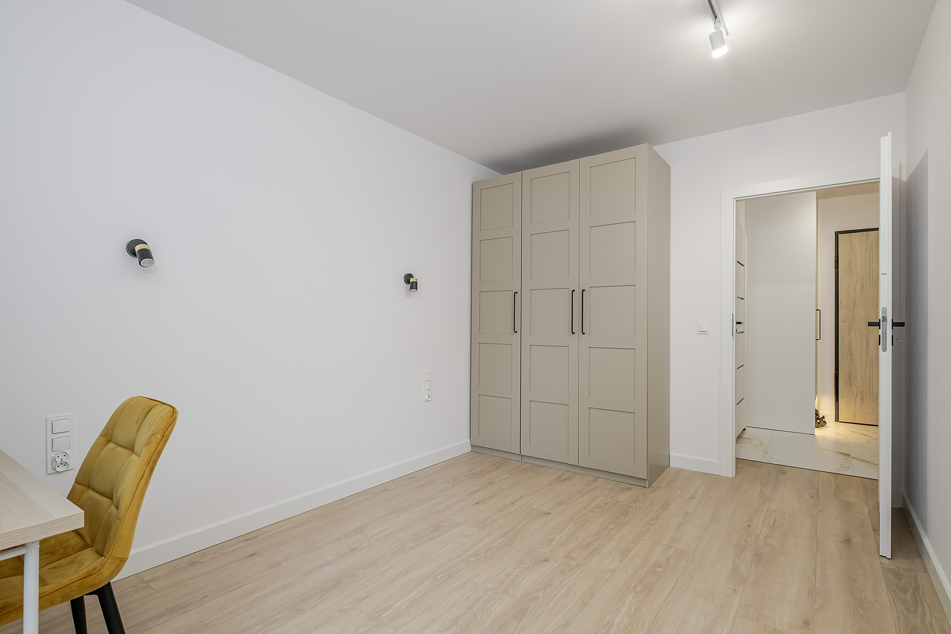 Przestronne, jasne, 2-pokojowe mieszkanie o metrażu 39,1 m², wykończone w wysokim standardzie, z meblami wykonanymi na zamówienie przez stolarza.