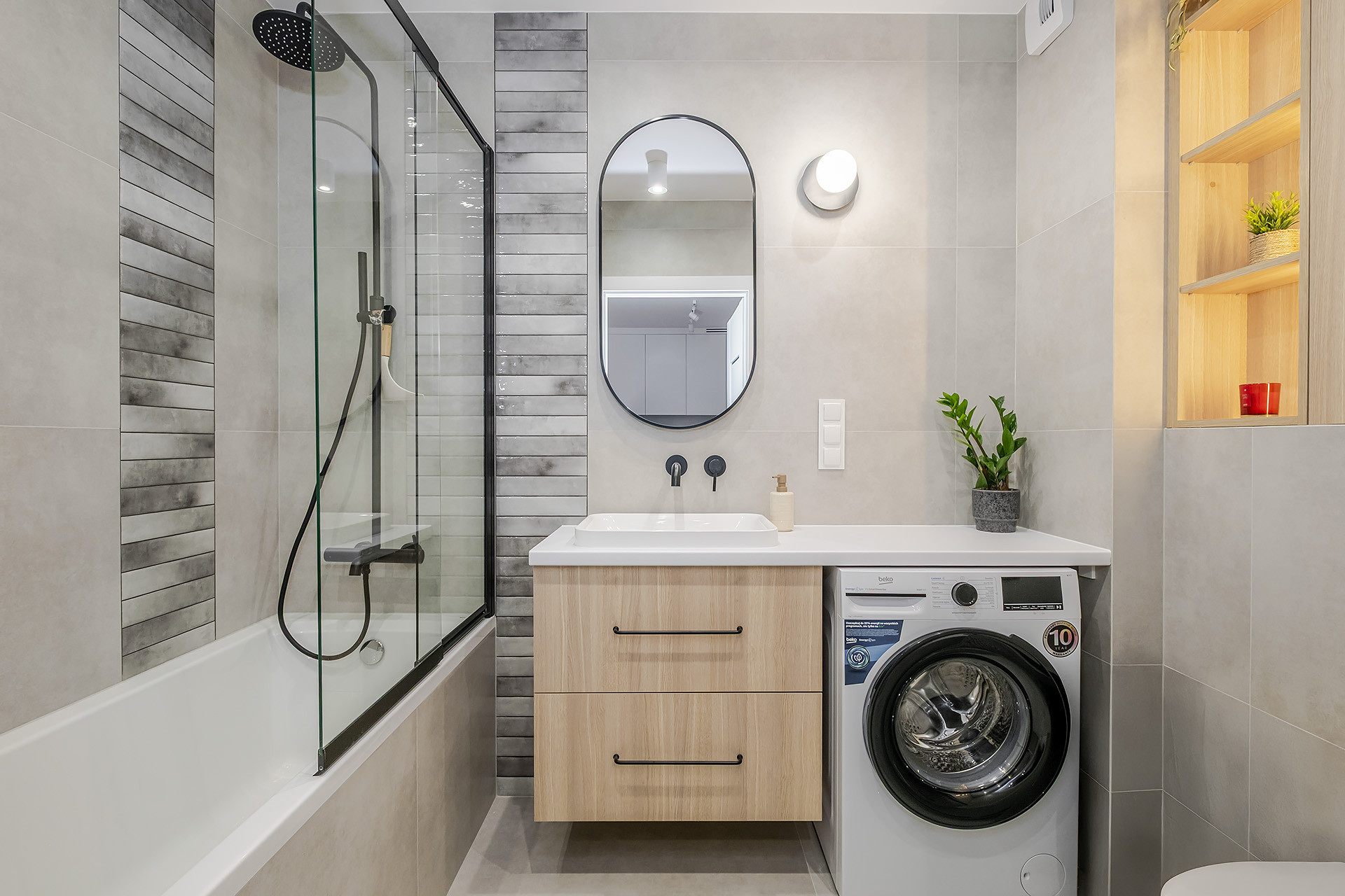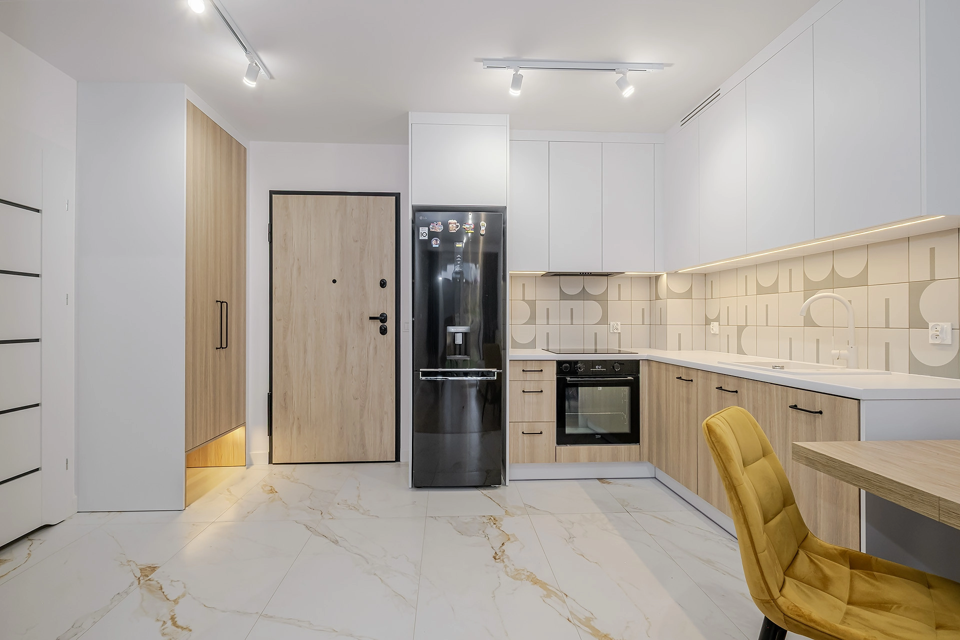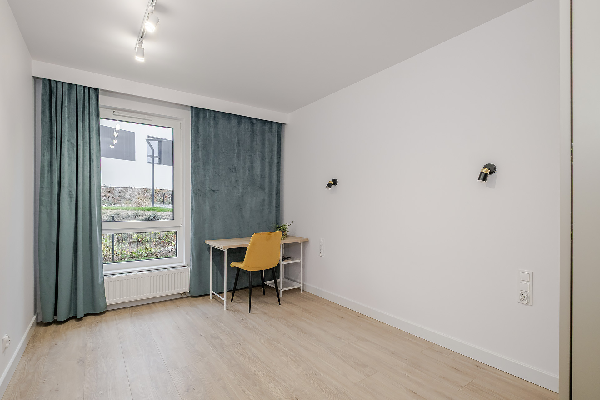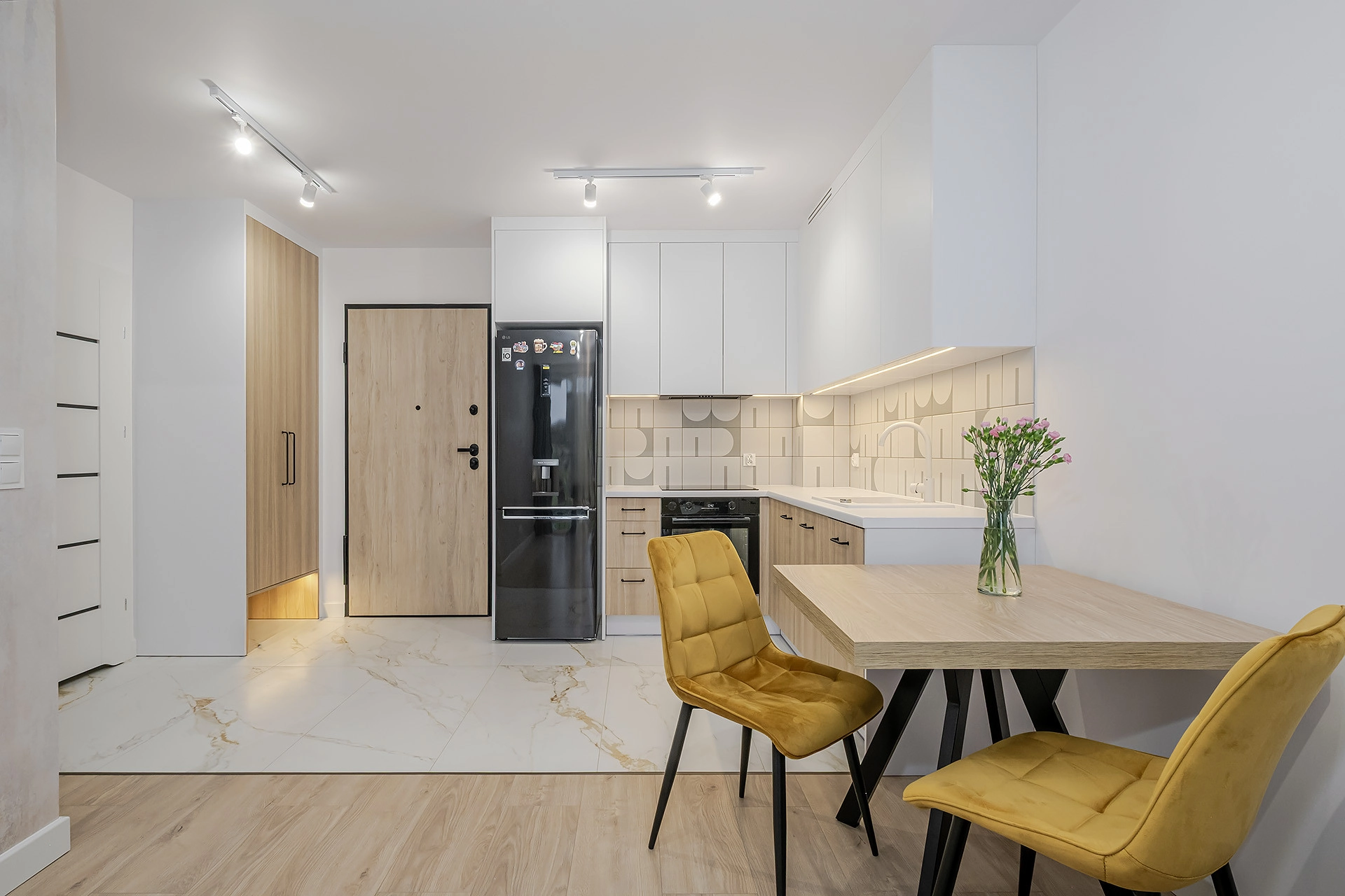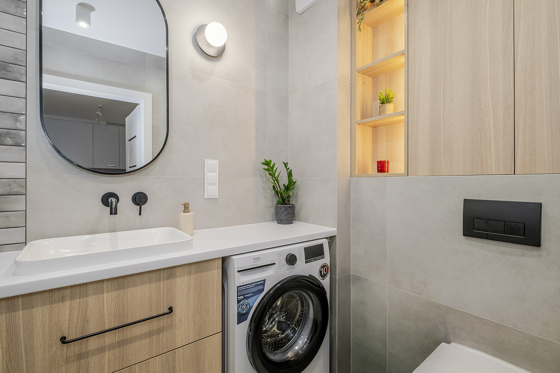 Przestronne, jasne, 2-pokojowe mieszkanie o metrażu 39,1 m², wykończone w wysokim standardzie, z meblami wykonanymi na zamówienie przez stolarza.