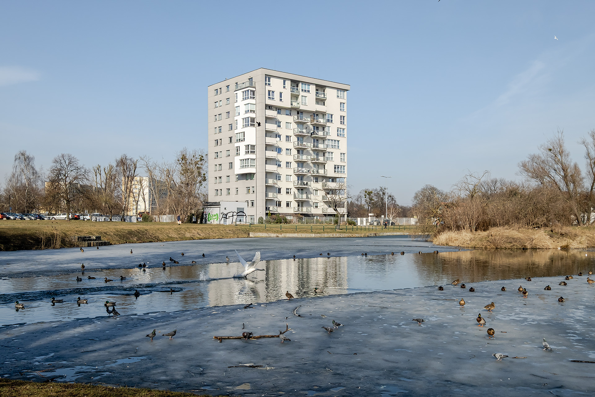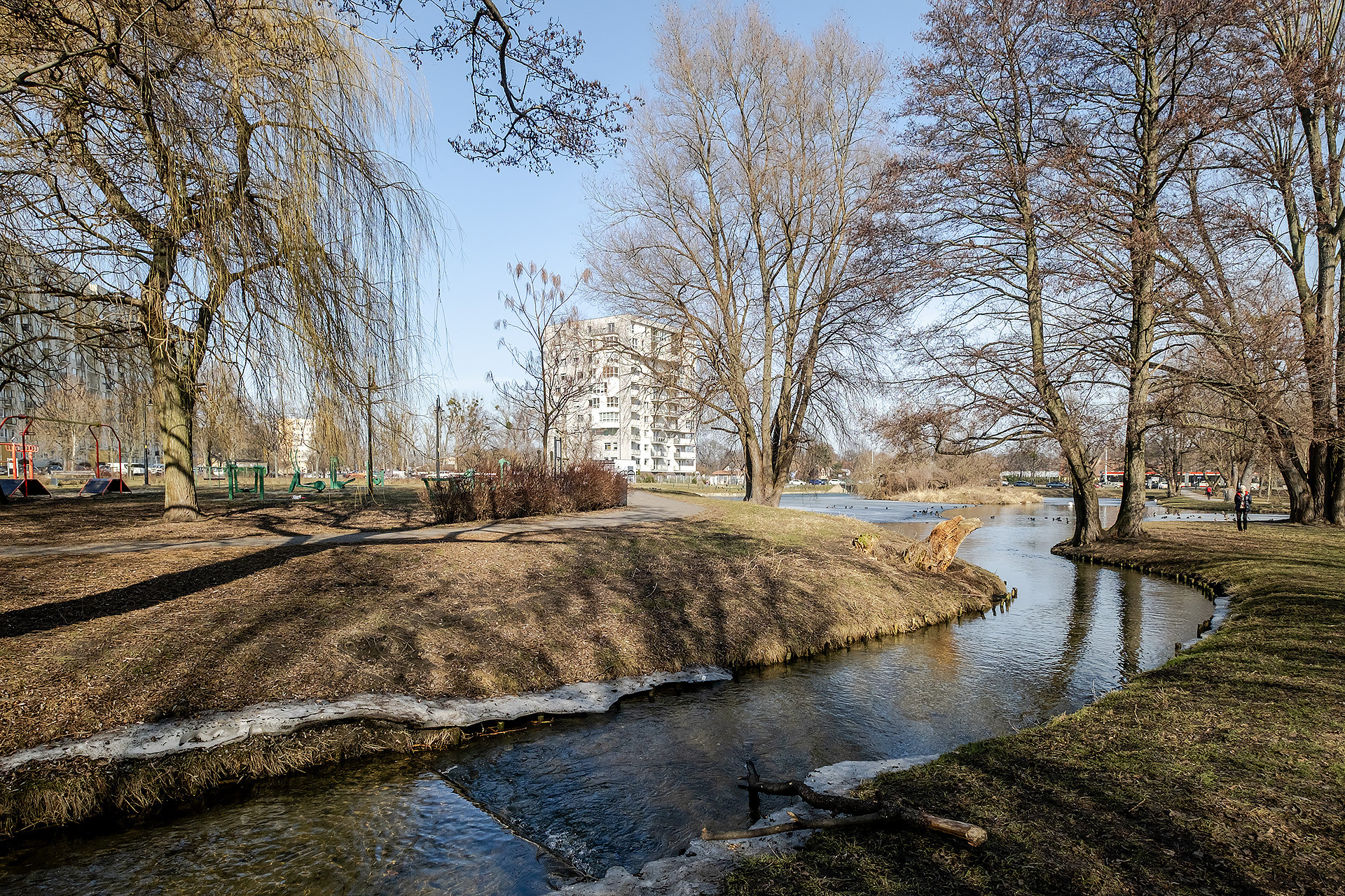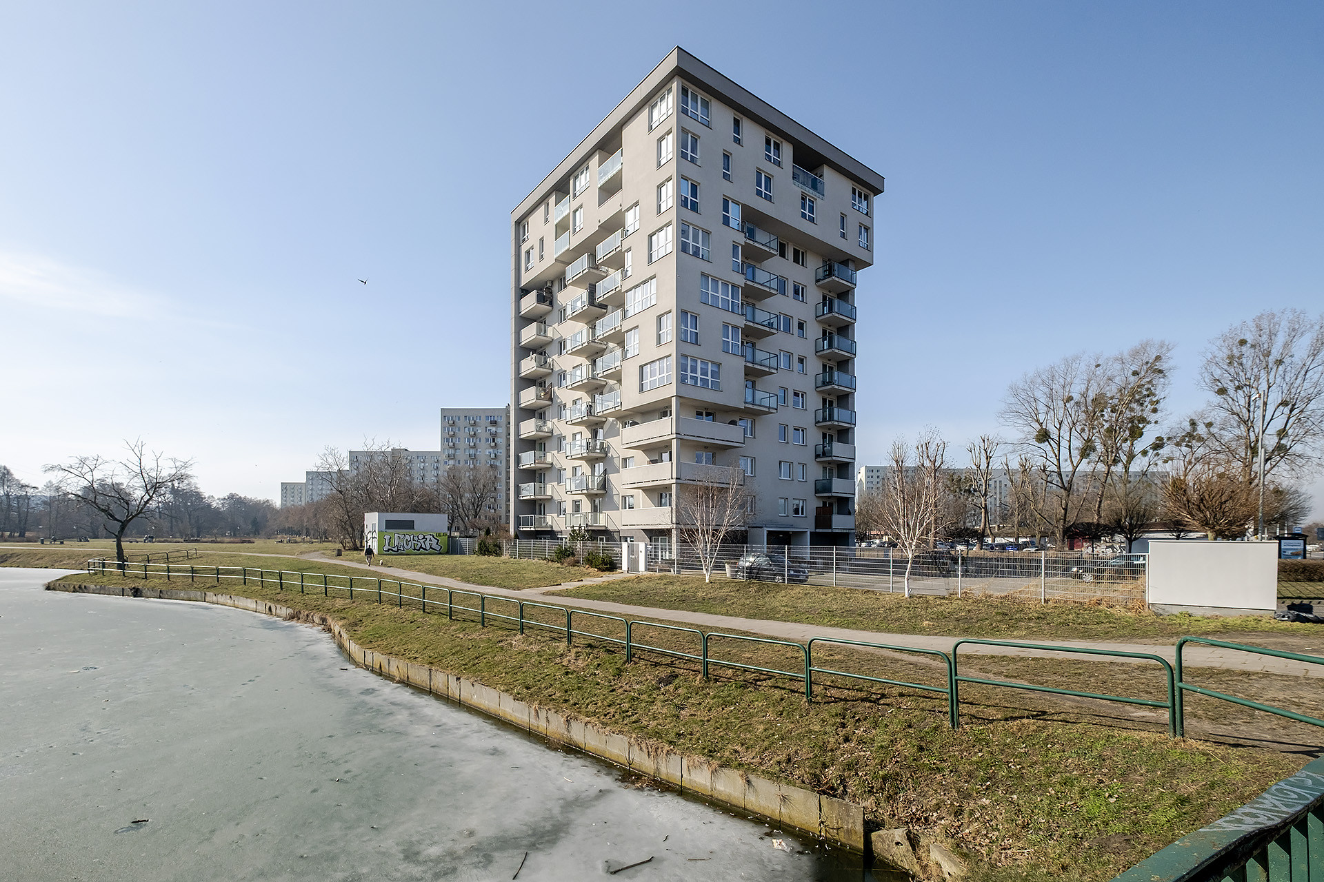 Z budynku można bezpośrednio wyjść do parku ze stawkiem, placami zabaw i boiskami.