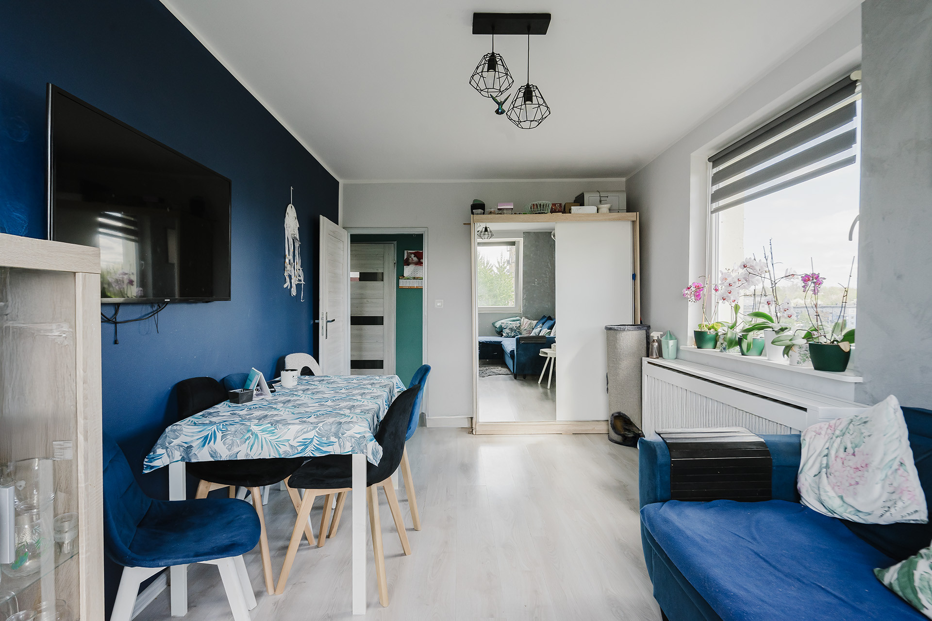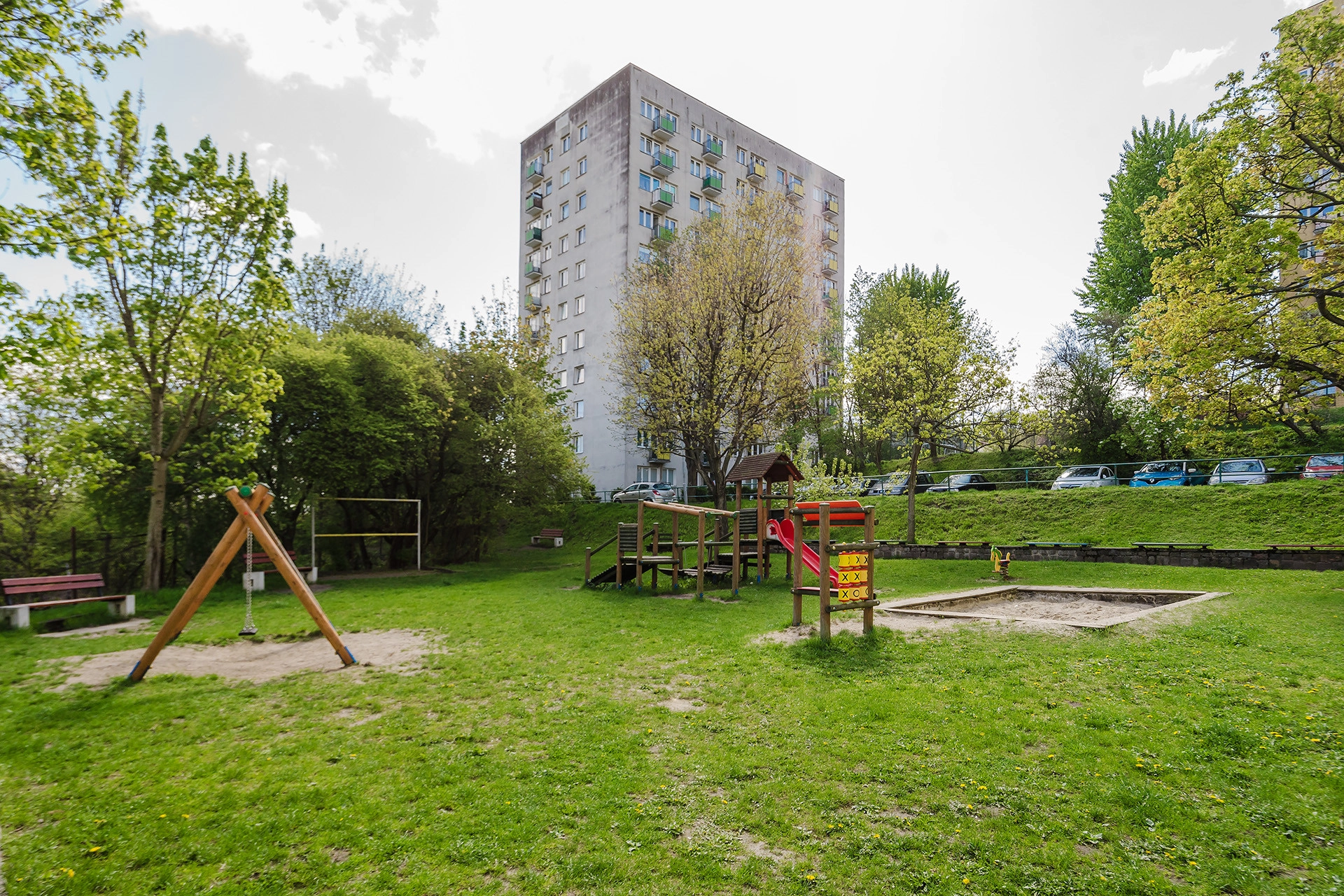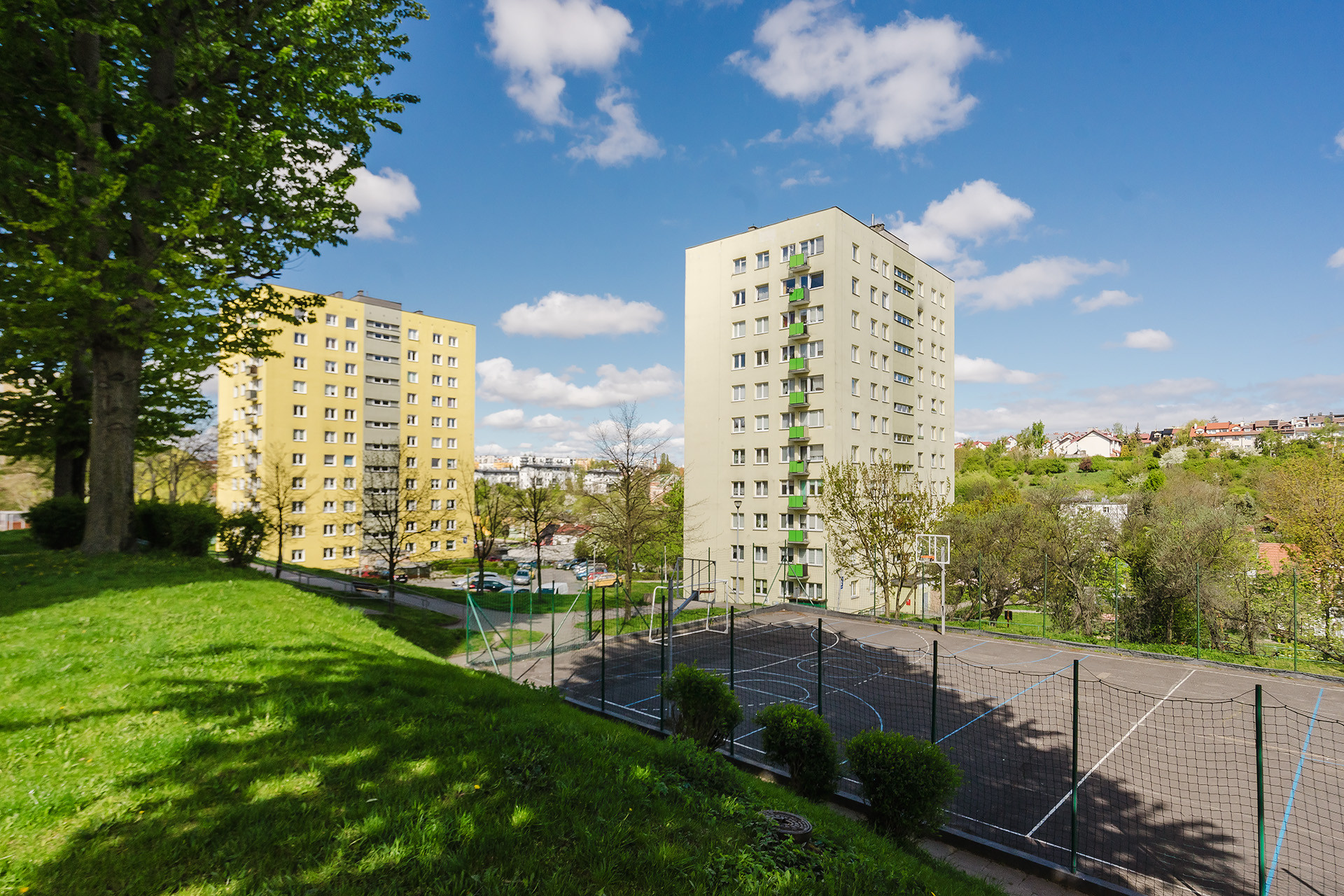 Mieszkanie mieści się w 10-piętrowym budynku wybudowanym w latach 70 z wielkiej płyty. Stan budynku jest dobry, a wejście do klatki schodowej zabezpieczone jest domofonem. Wewnątrz budynku winda, którą wymieniono w 2022 roku. Wokół liczne miejsca parkingowe dostępne tylko dla mieszkańców.