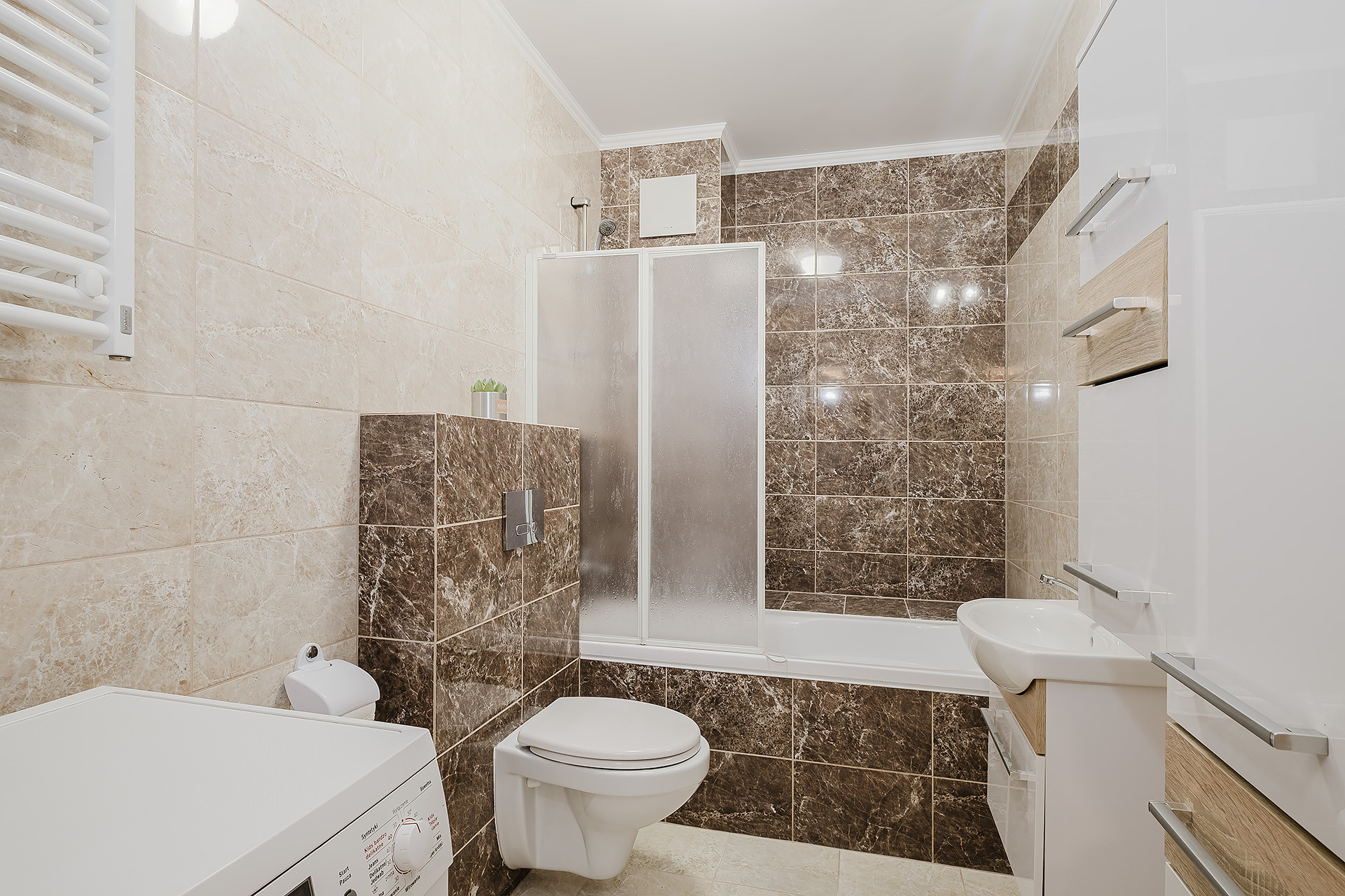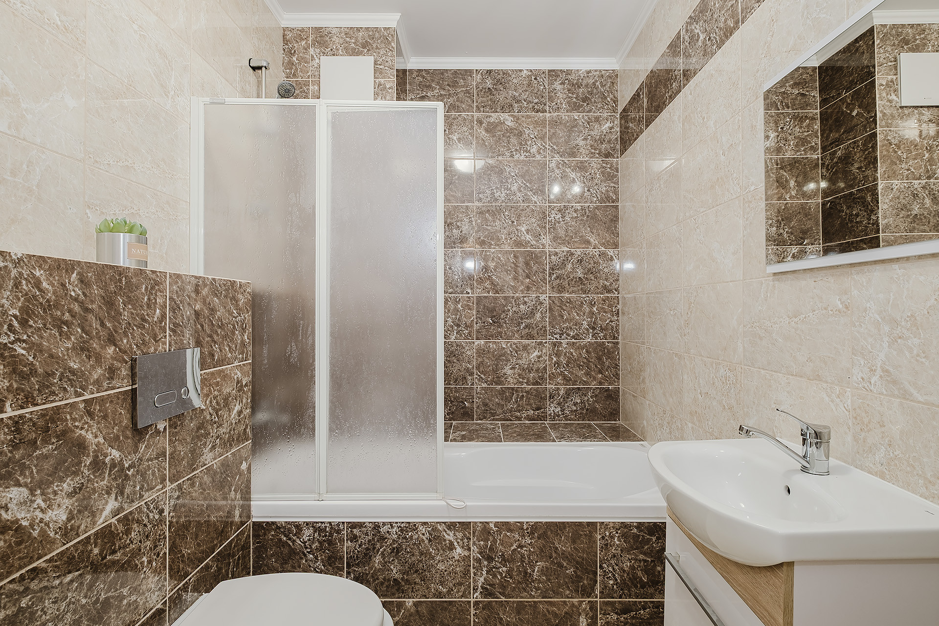 – łazienki z wanną o powierzchni 5,35 m2, podłoga i ściany wykończone glazurą i terakotą.