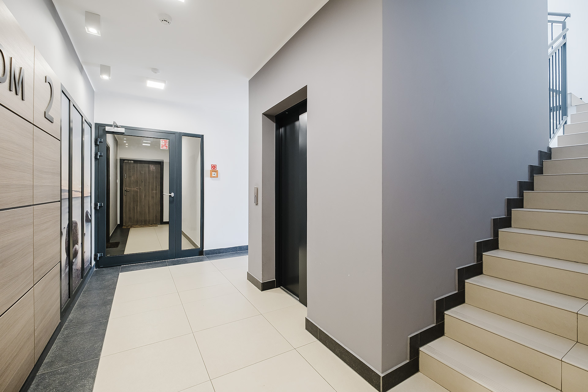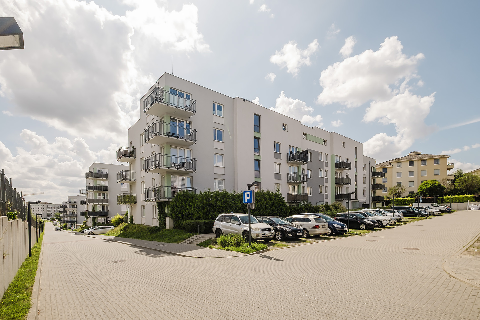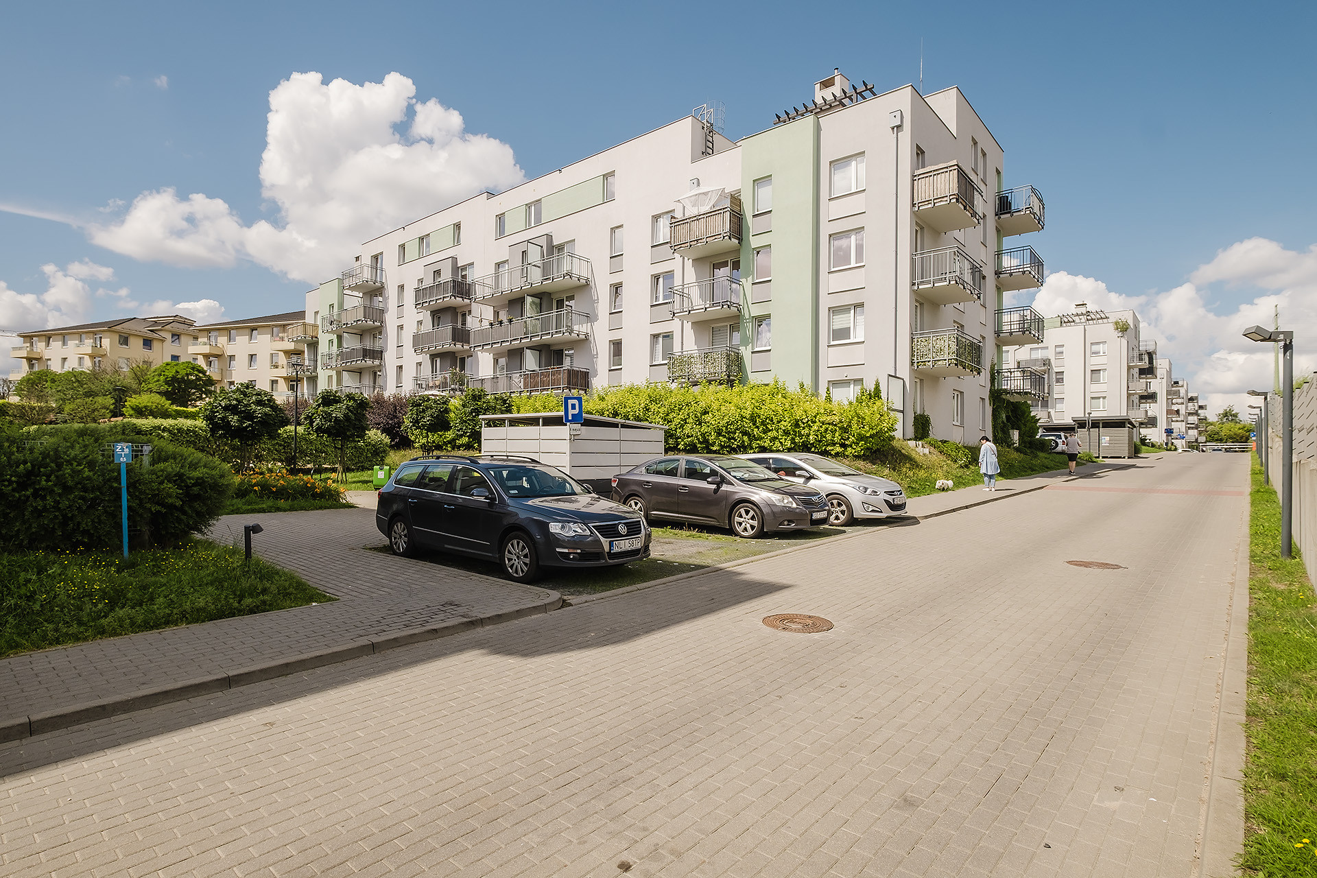 Mieszkanie mieści się na II piętrze bloku wybudowanego w 2018 roku przez dewelopera Hanza. Wejście do klatki schodowej, nowoczesne, szerokie, zadbane, zabezpieczone domofonem. Budynek wyposażony w windę. Obok budynku ogólnodostępne miejsca postojowe dla mieszkańców. Budynek wykonany z pustaka, dach płaski pokryty papą.