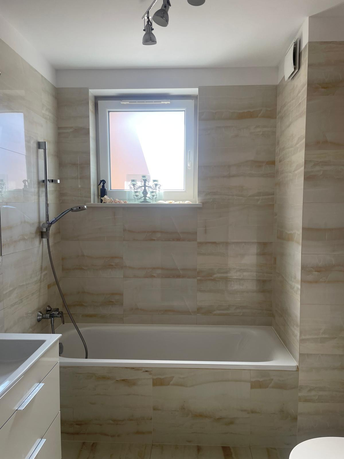 - elegancka łazienka w ciepłych, ziemistych barwach – wyposażona w wannę, stworzona z myślą o relaksie,