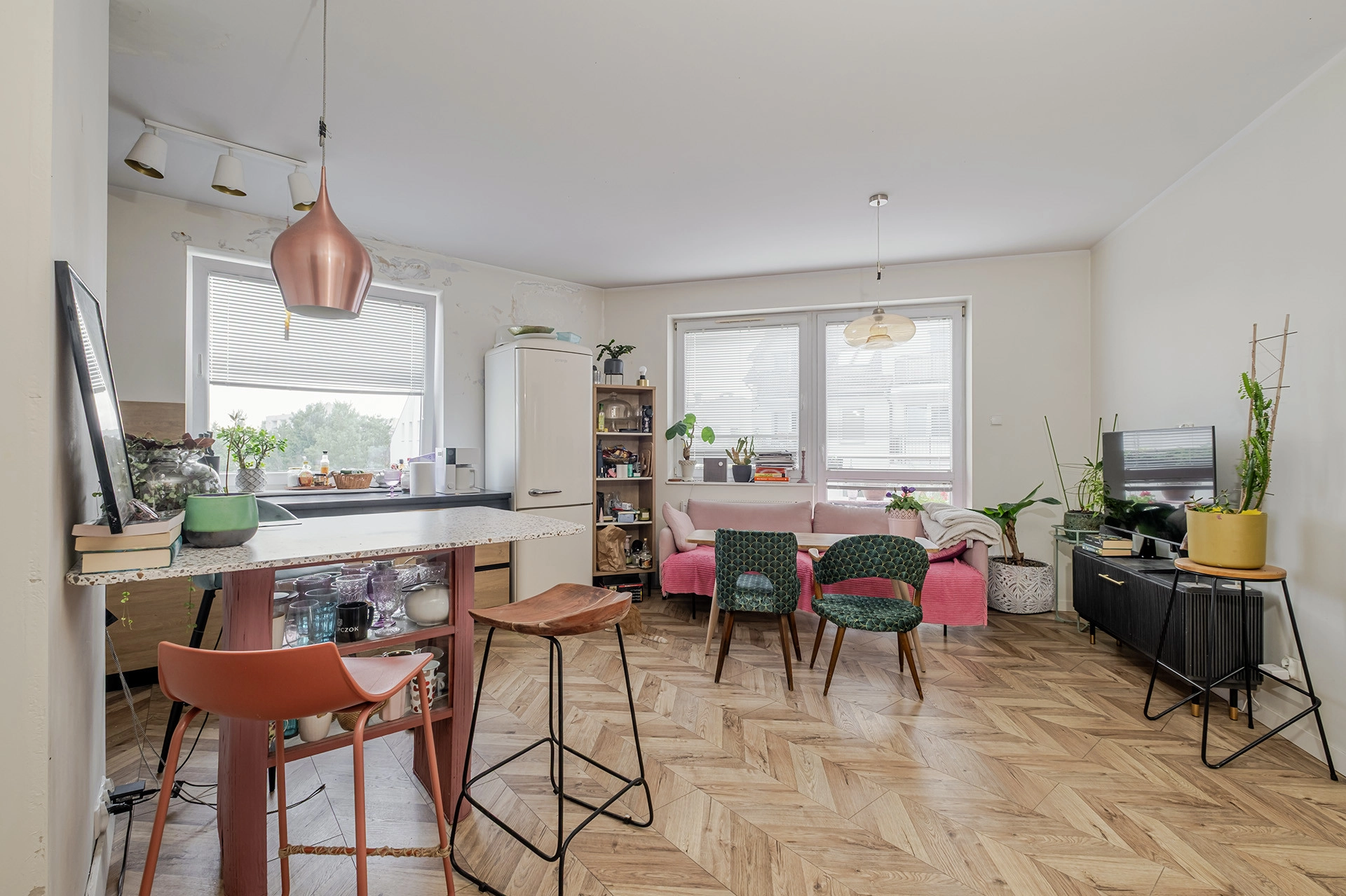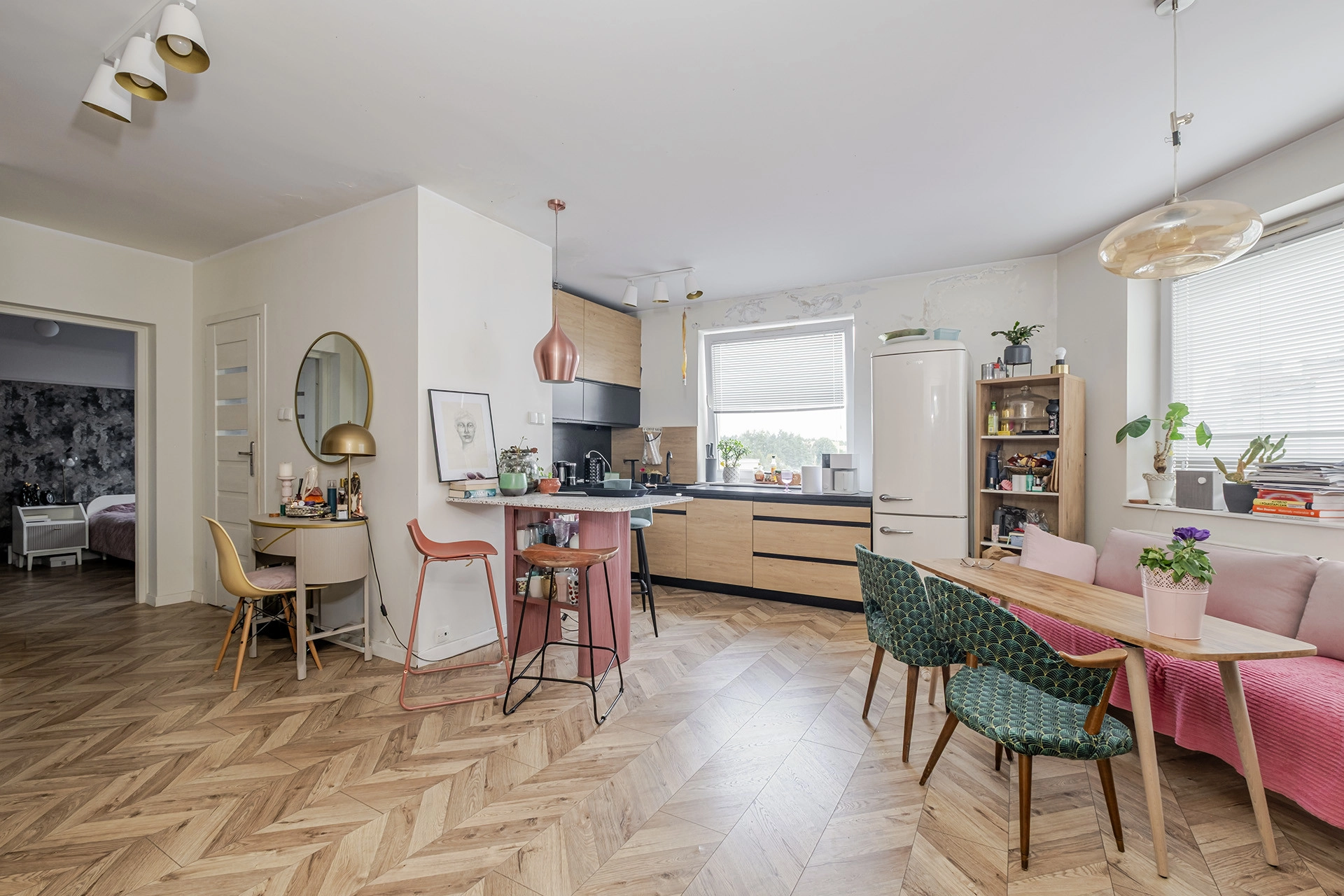 Dzięki dwustronnemu układowi i dużej powierzchni, salon jest doskonały do relaksu. Duże okna zapewniają dużo naturalnego światła, co sprawia, że przestrzeń jest jasna i przytulna.W pełni wyposażona kuchnia w sprzęty AGD, w tym piekarnik dual cook.