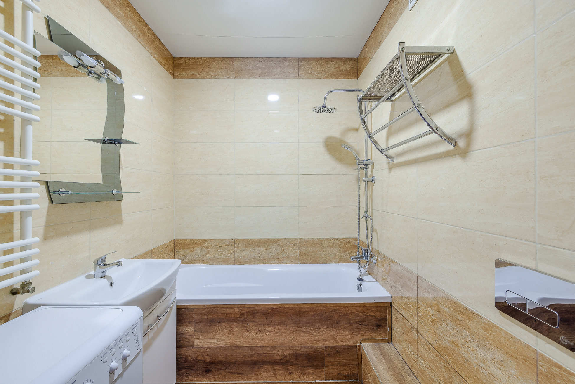 – łazienka (3,73 m2) z WC, wanną z prysznicem, pralką, umywalką, lustrem, grzejnikiem drabinkowym,