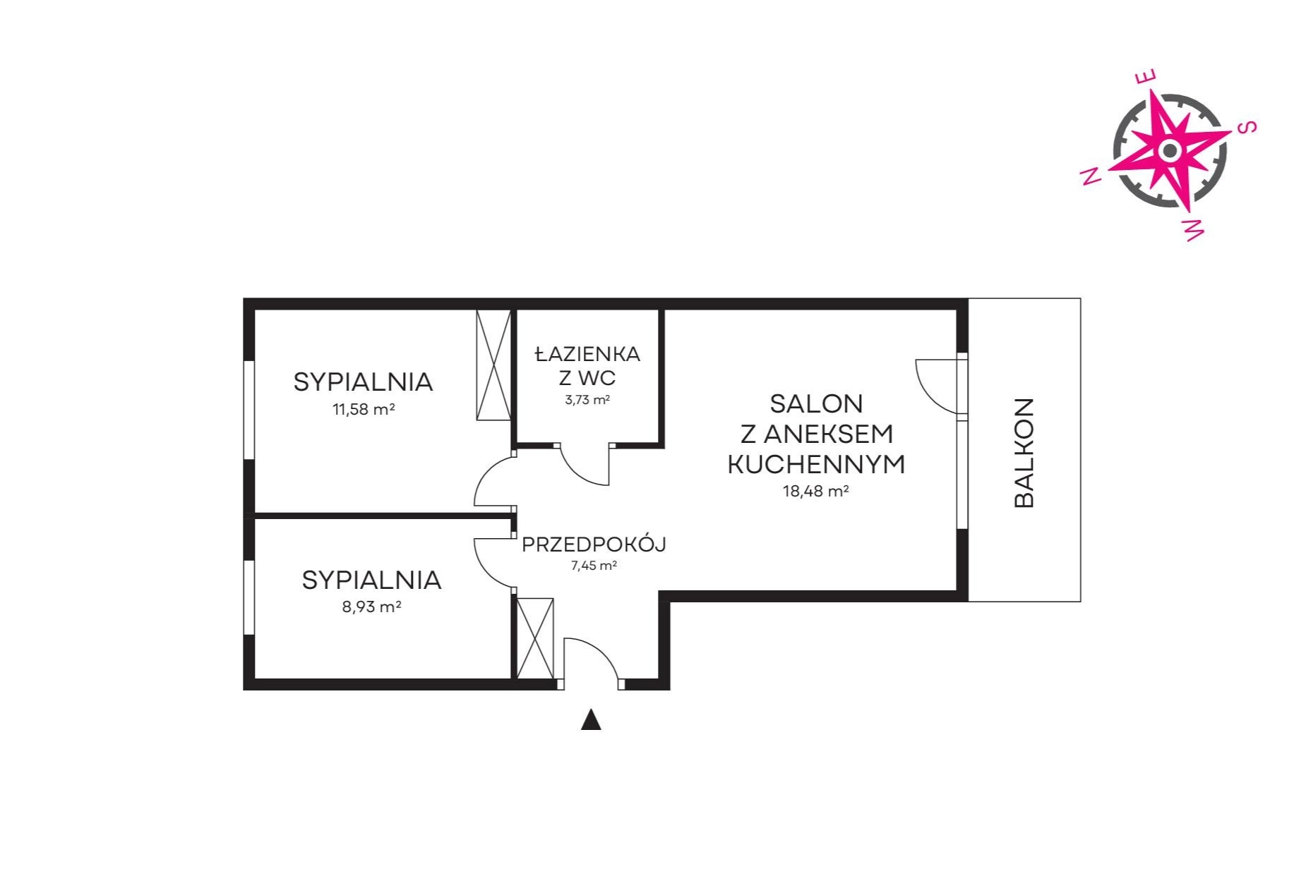 – 2 sypialnie (11,58 m2 oraz 8,93 m2); większa z nich z szafa w zabudowie,