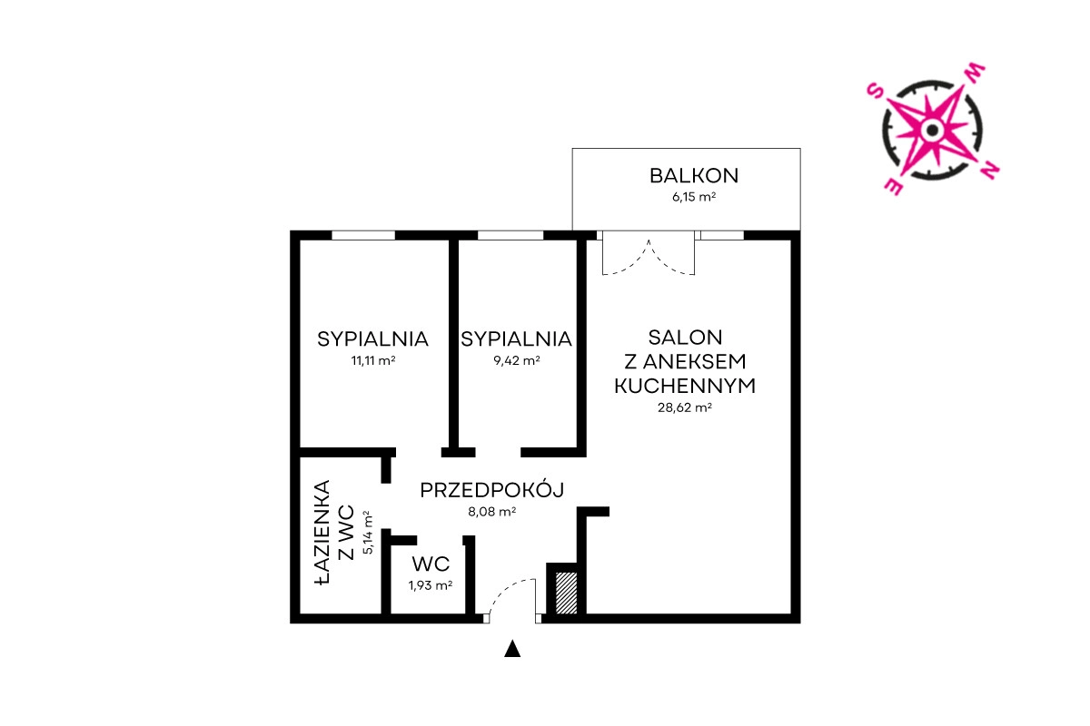 – salon z aneksem kuchennym (28,62 m2) oraz wyjściem na balkon (6,15 m2),