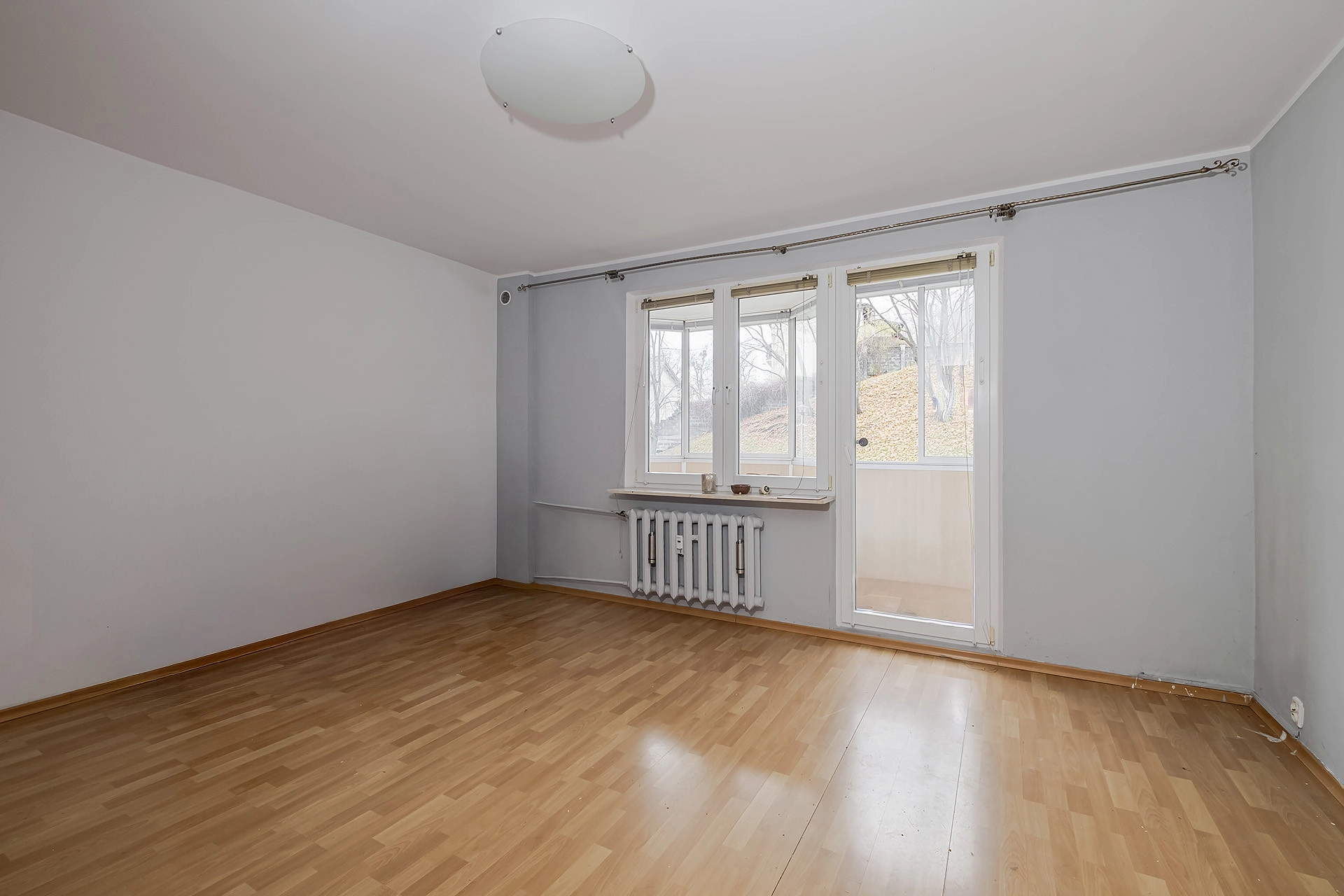 – salonu z wyjściem na przestronny, zabudowany balkon – widokiem na zieleń: