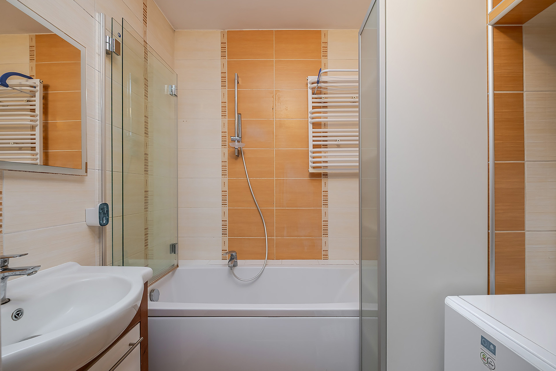 – łazienka (3,20 m2) z WC, wanną z prysznicem, umywalką, lustrem, grzejnikiem drabinkowym,
