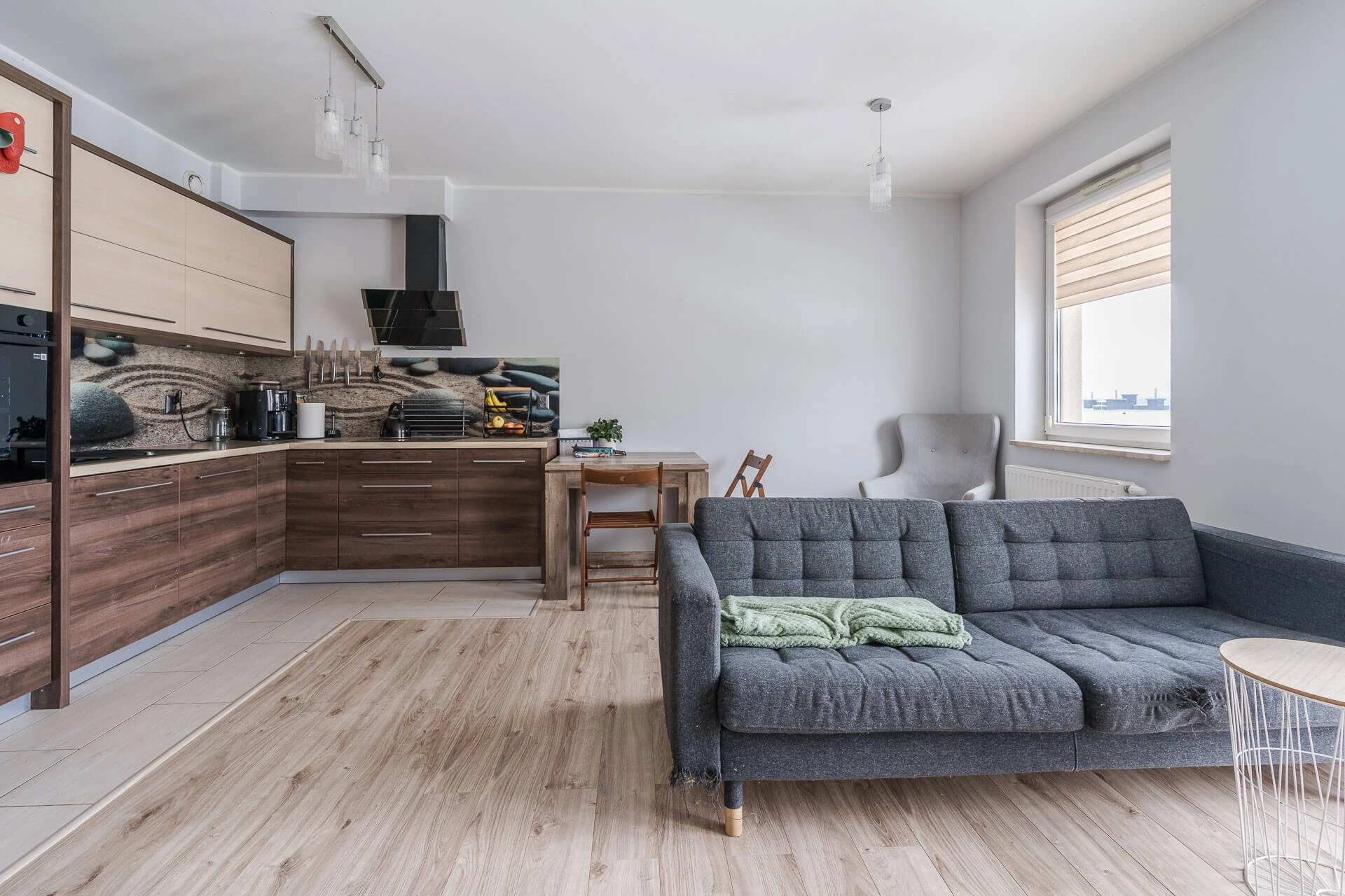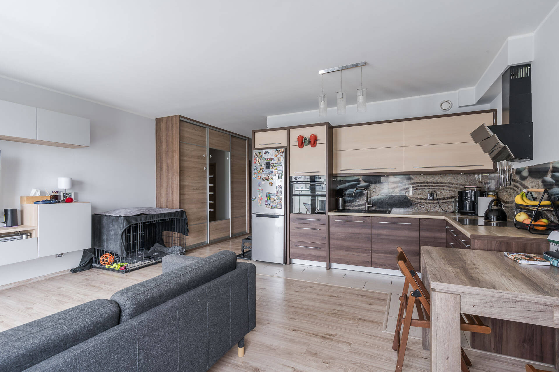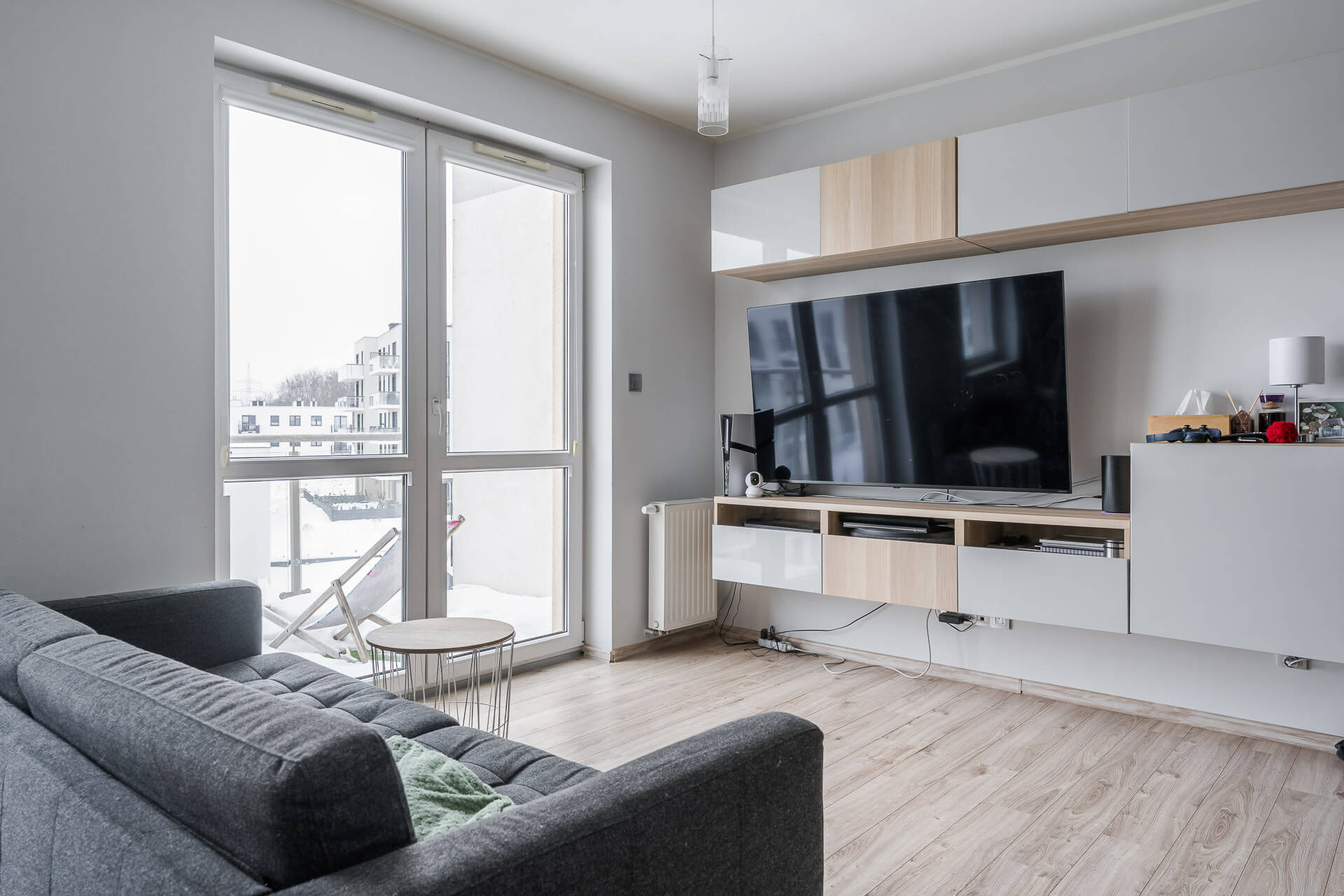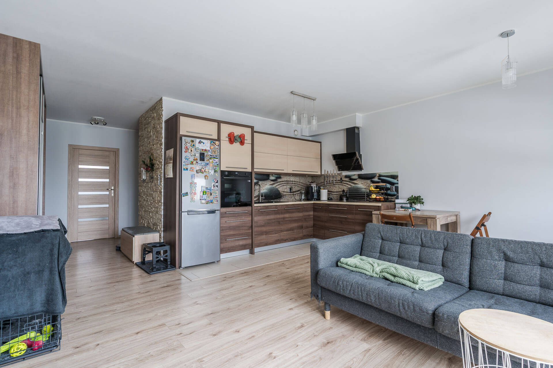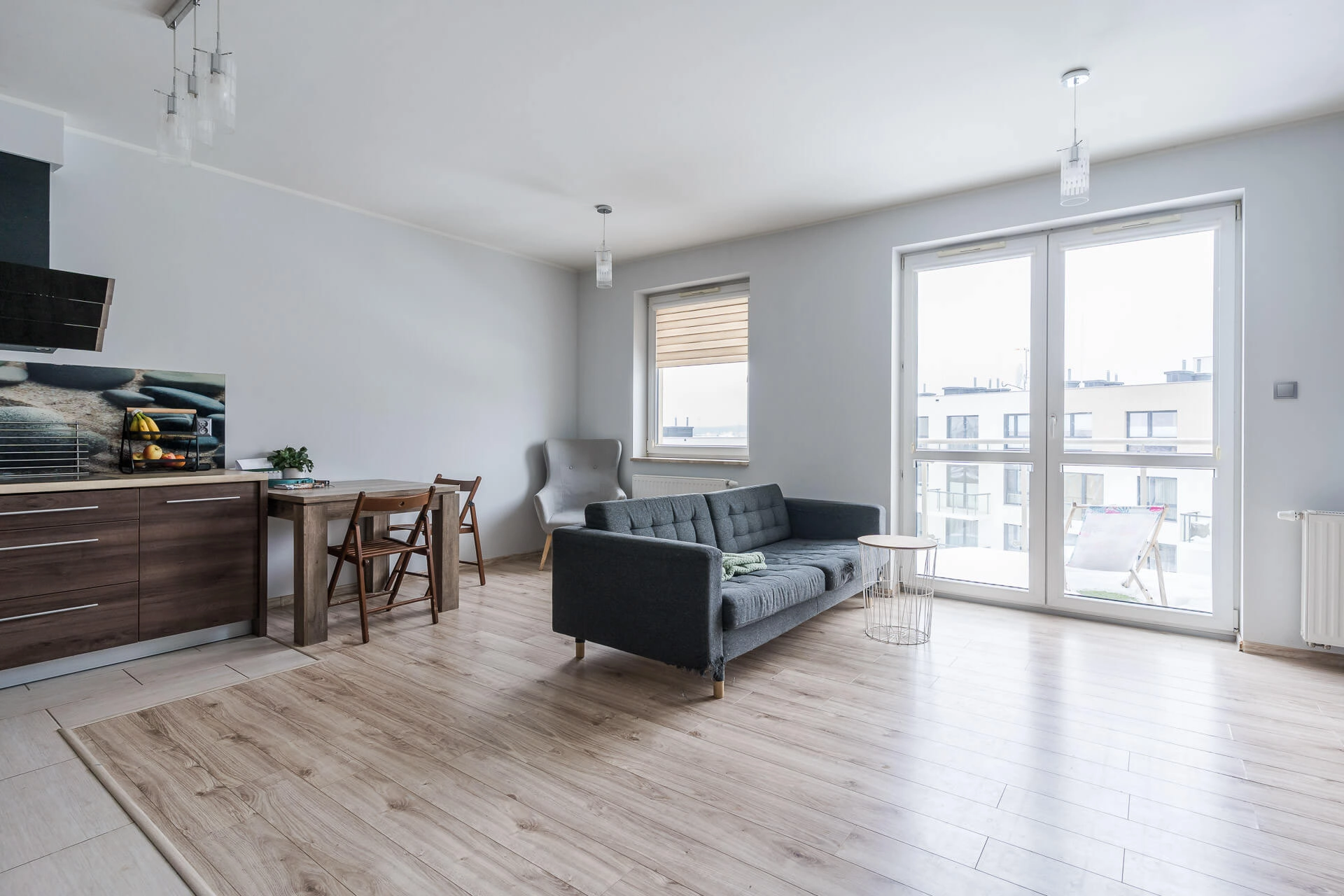 – Dużego salonu z aneksem kuchennym oraz wyjściem na balkon