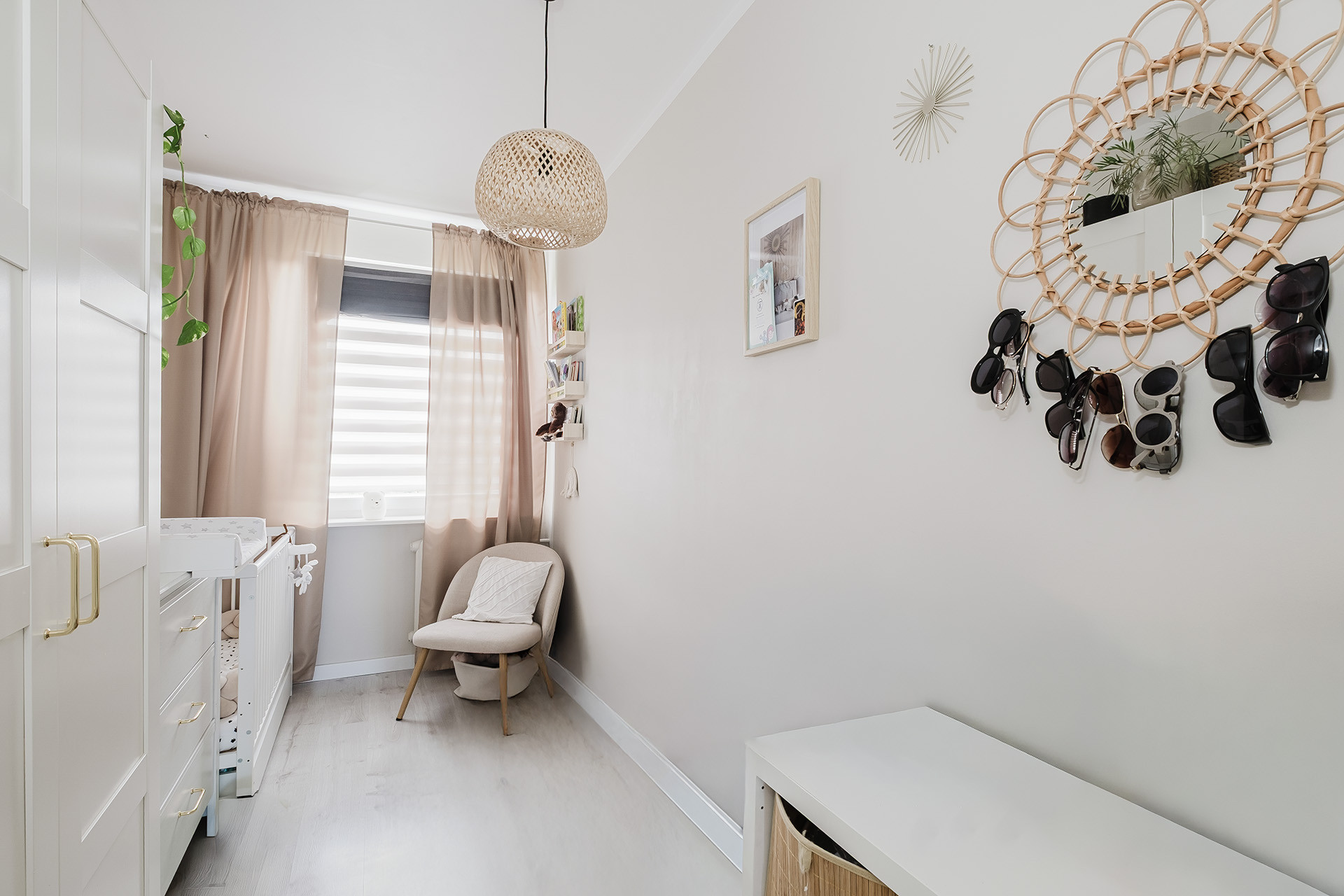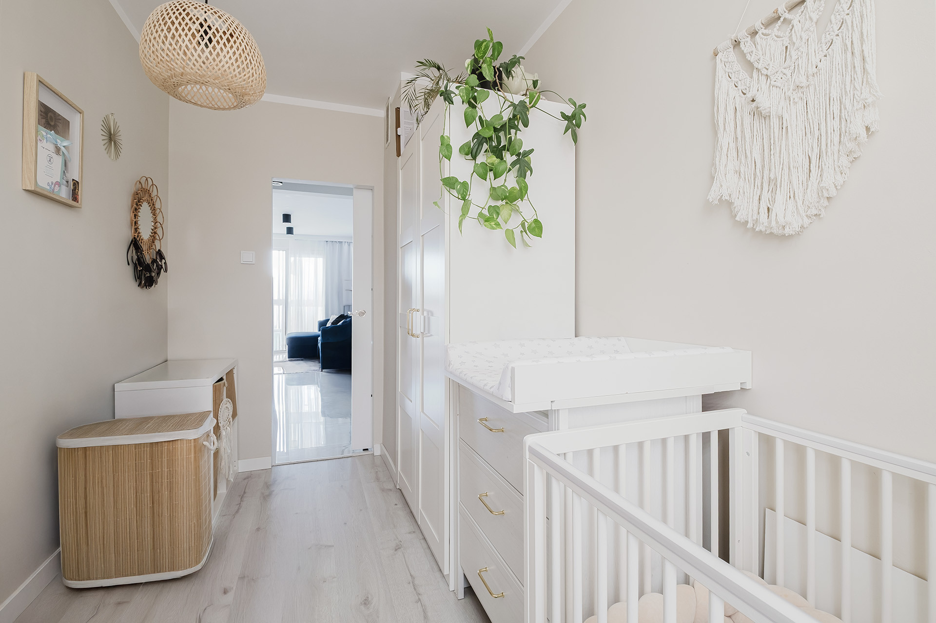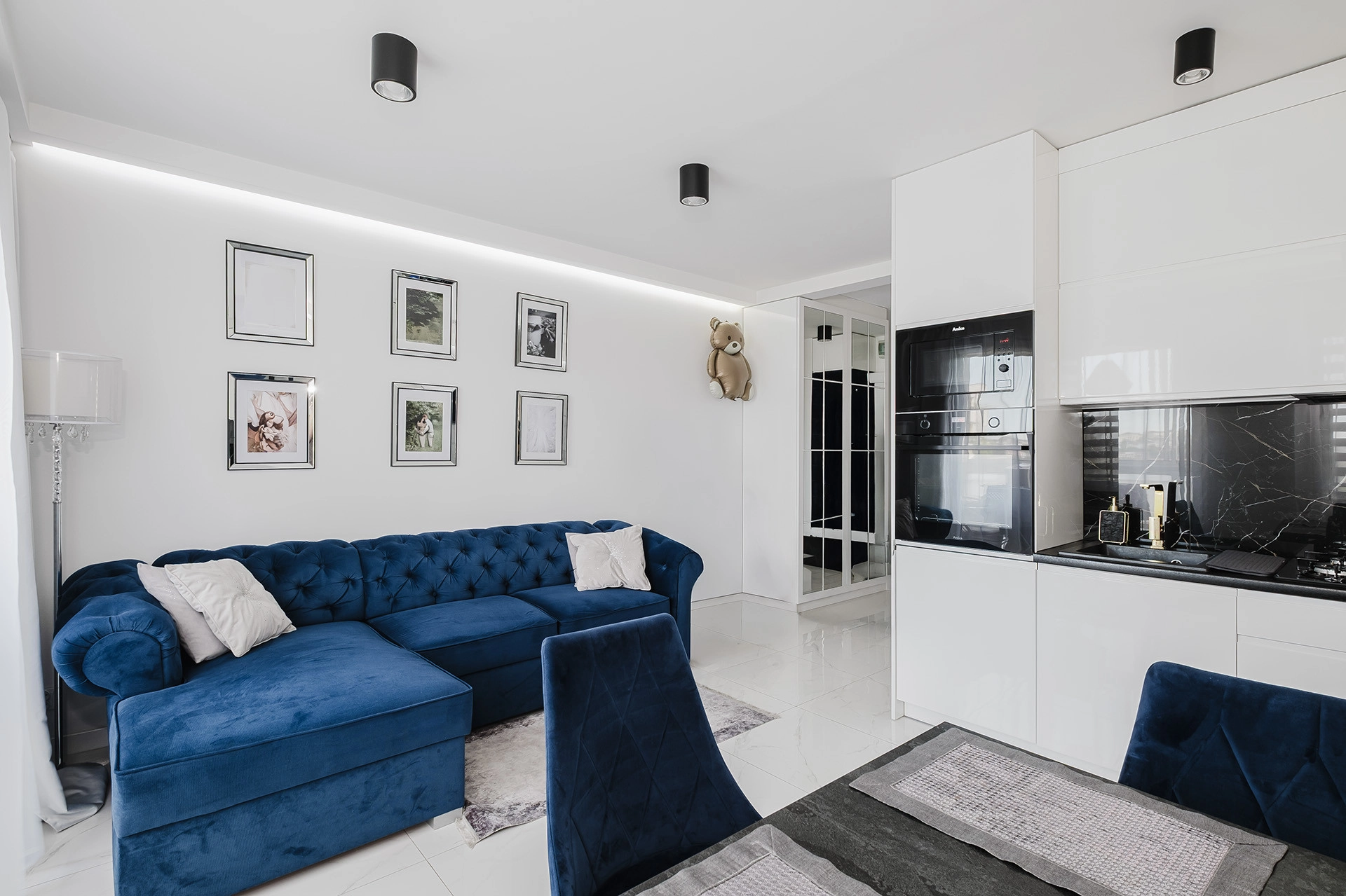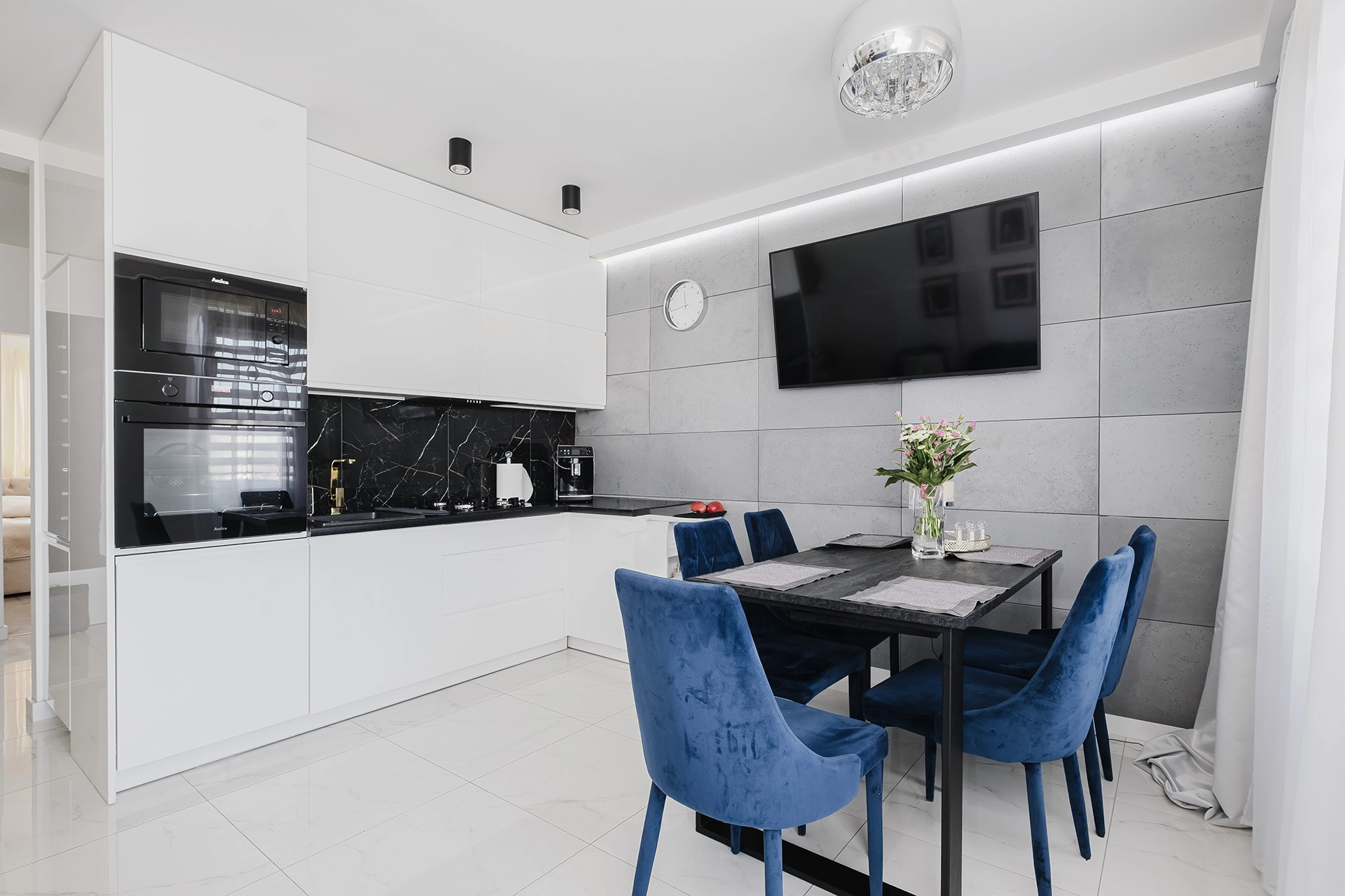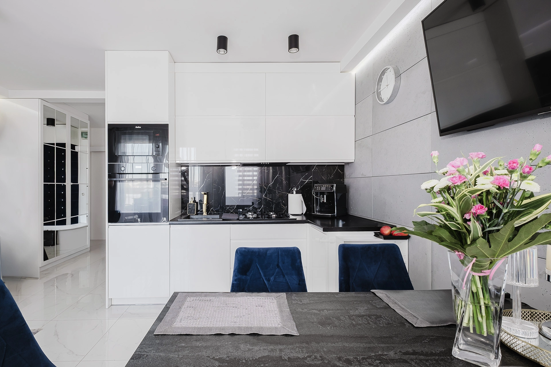 Wszystkie zabudowy meblowe zostały wykonane na wymiar, dzięki czemu mieszkanie jest maksymalnie praktyczne i gotowe do zamieszkania bez dodatkowych nakładów.