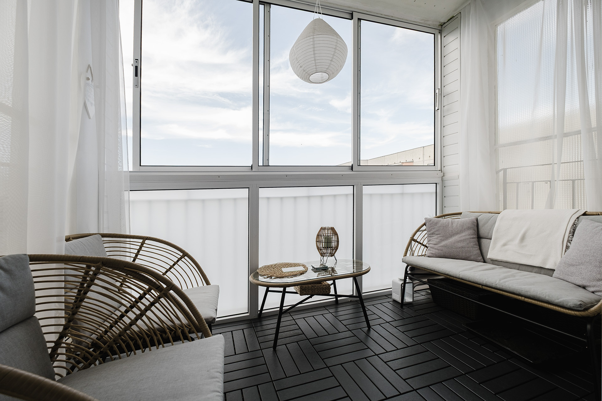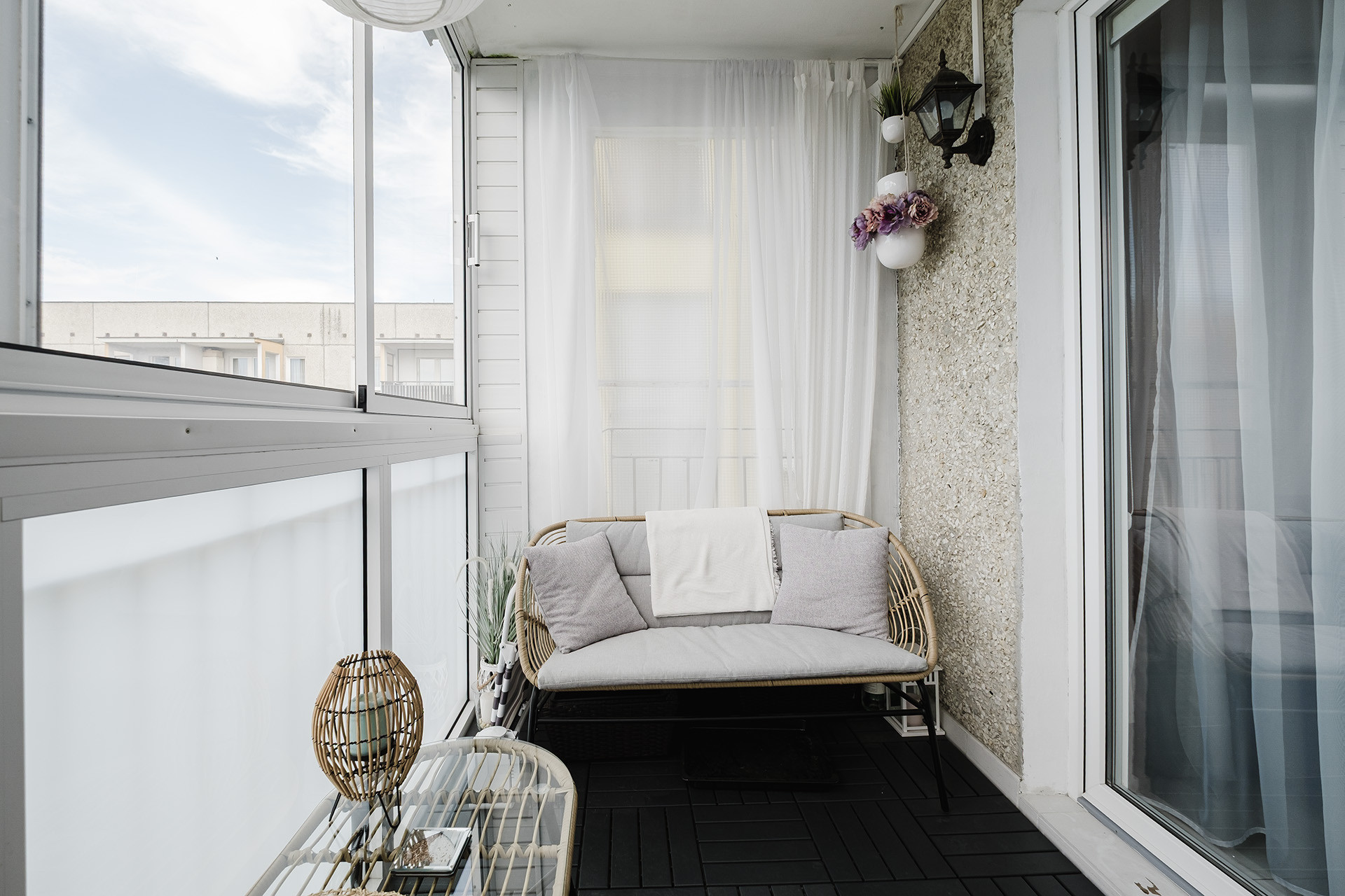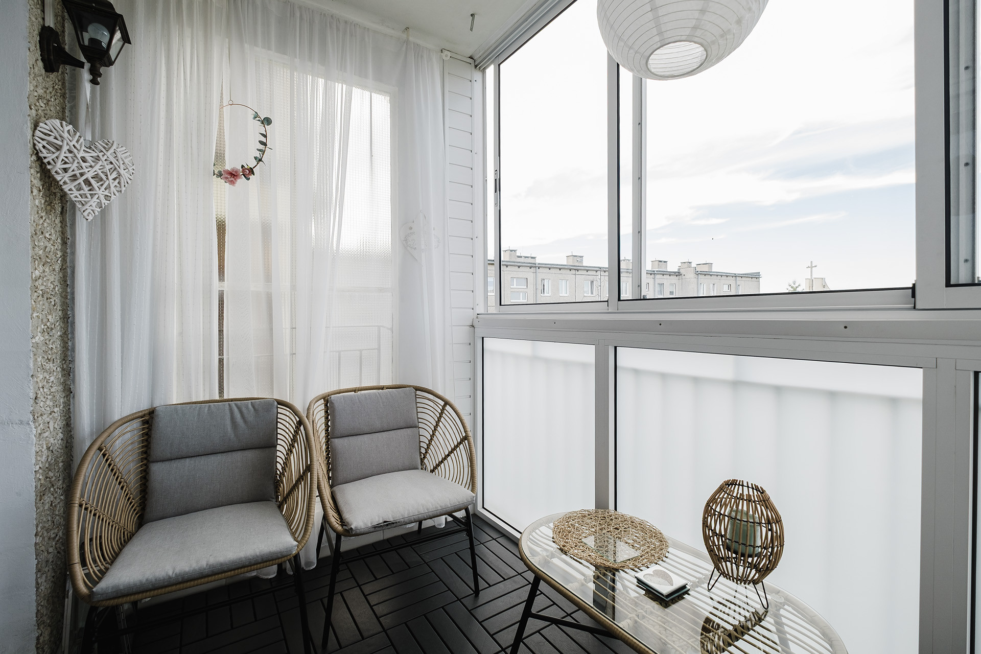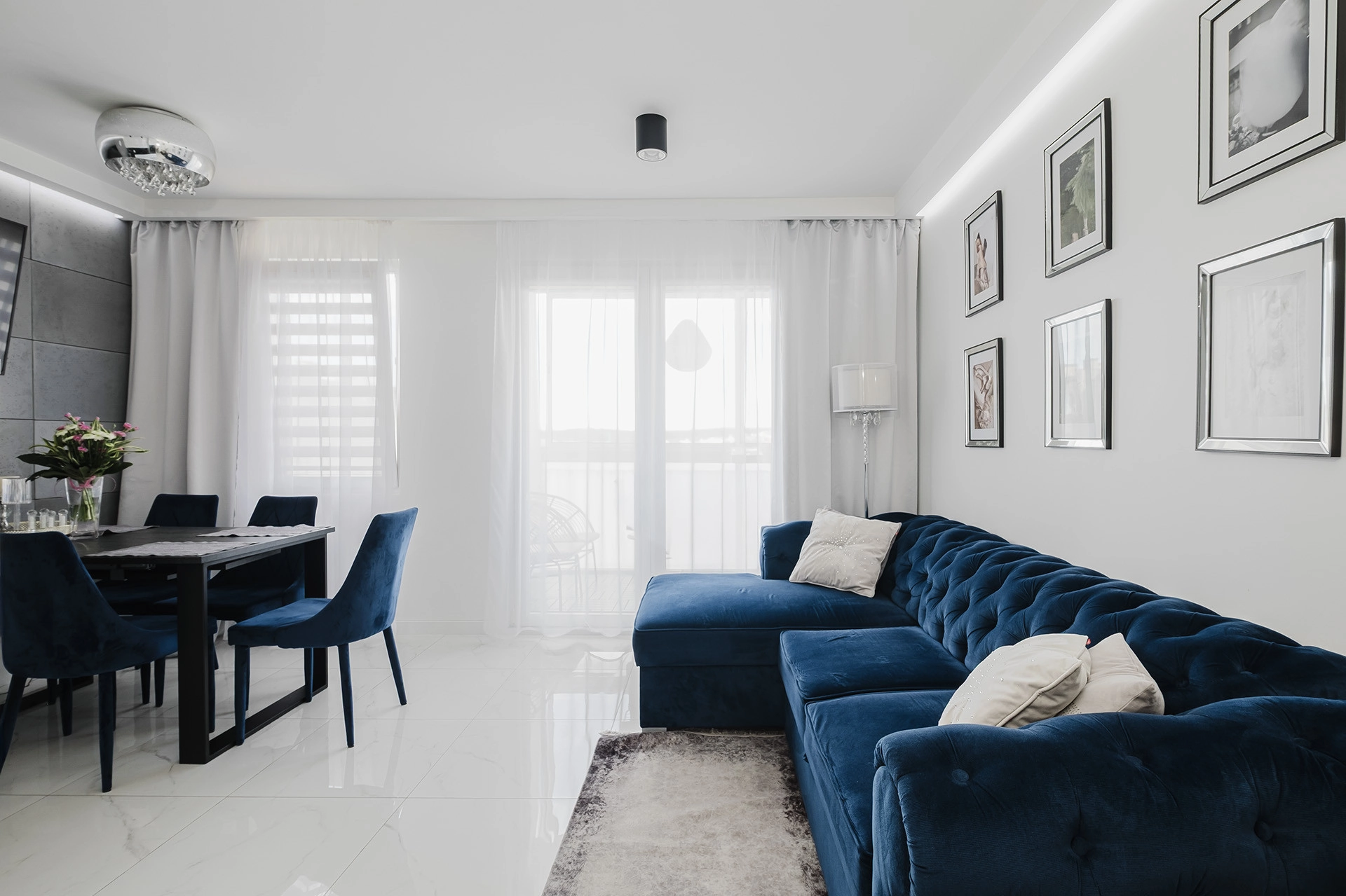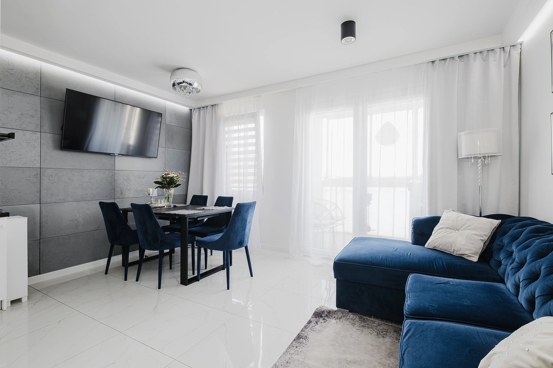 -jasny salon z aneksem kuchennym oraz wyjściem na zabudowany balkon – idealne miejsce do relaksu i spotkań