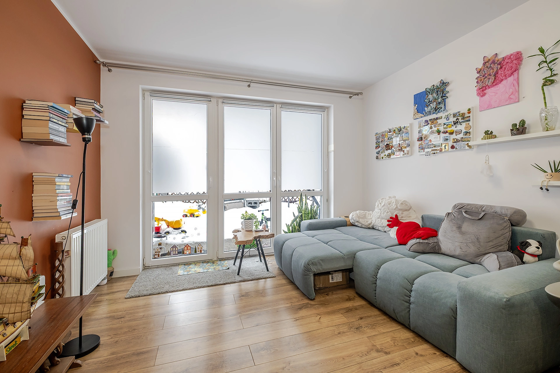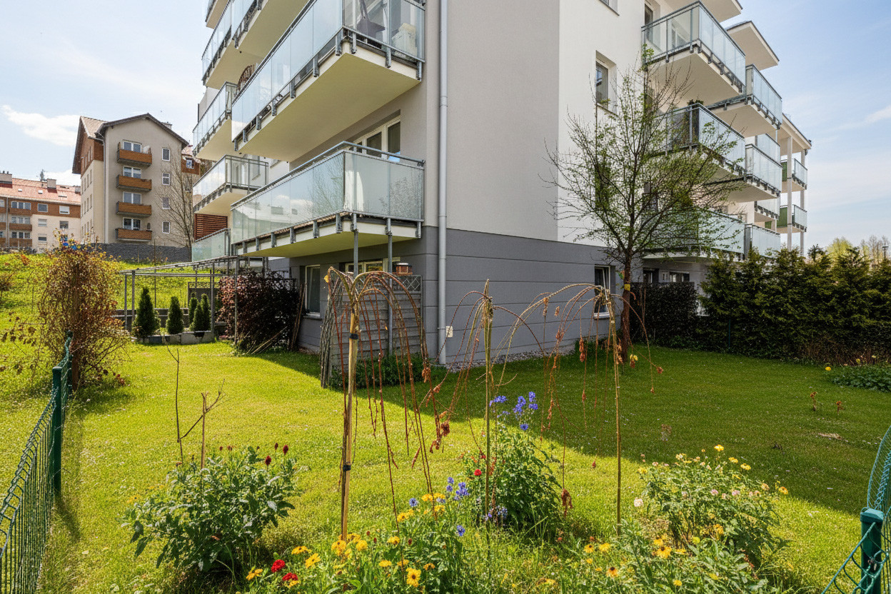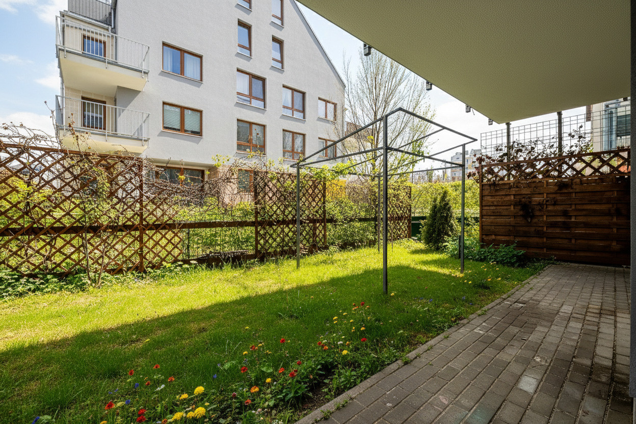 – jasnego salonu z aneksem kuchennym, który łączy się z przytulnym, narożnym ogrodem o powierzchni około 90 m²;