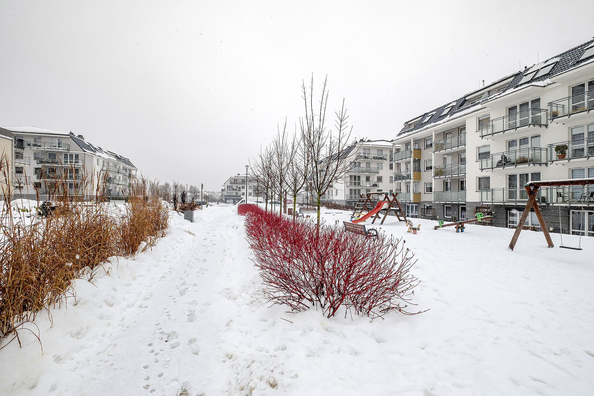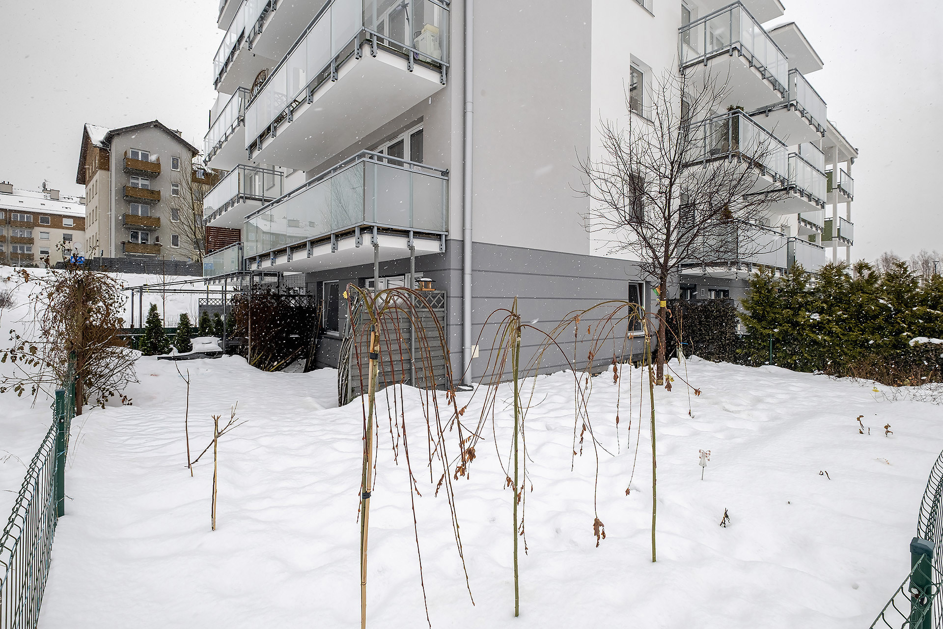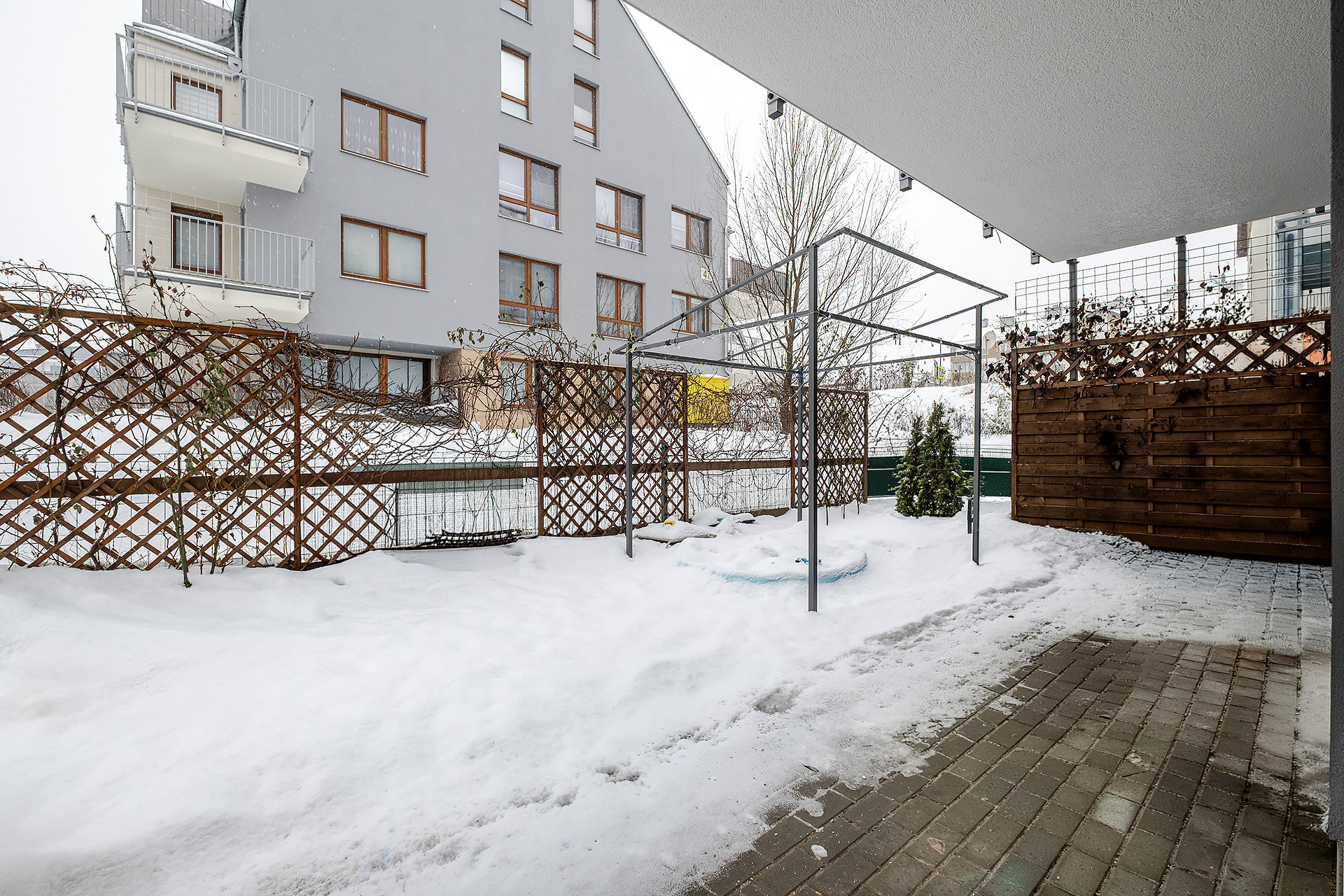 – jasnego salonu z aneksem kuchennym, który łączy się z przytulnym, narożnym ogrodem o powierzchni około 90 m²;