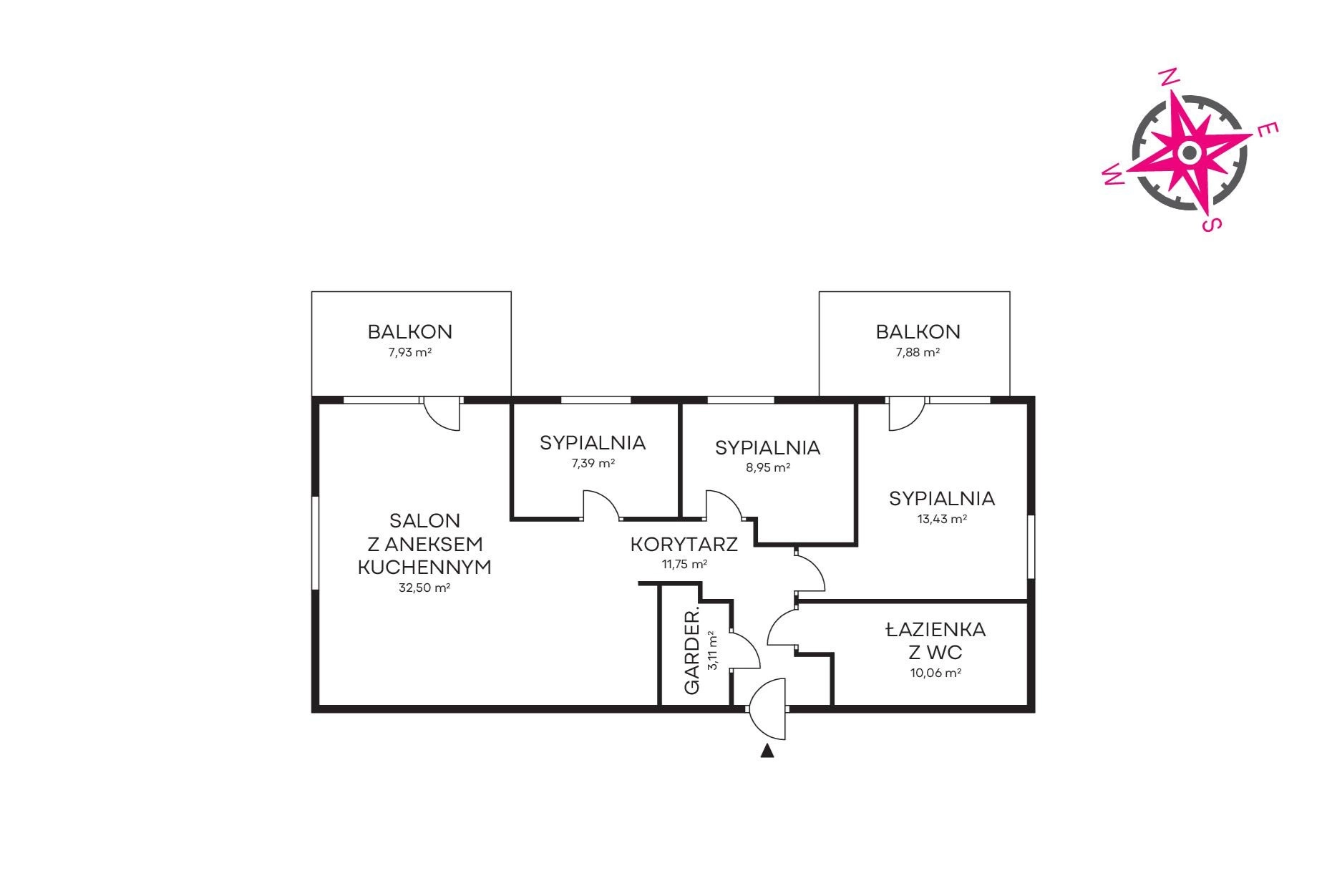 – 3 sypialnie (13,43 m2; 8,95 m2 oraz 7,39 m2); z największej z nich wyjście na balkon (7,88 m2),