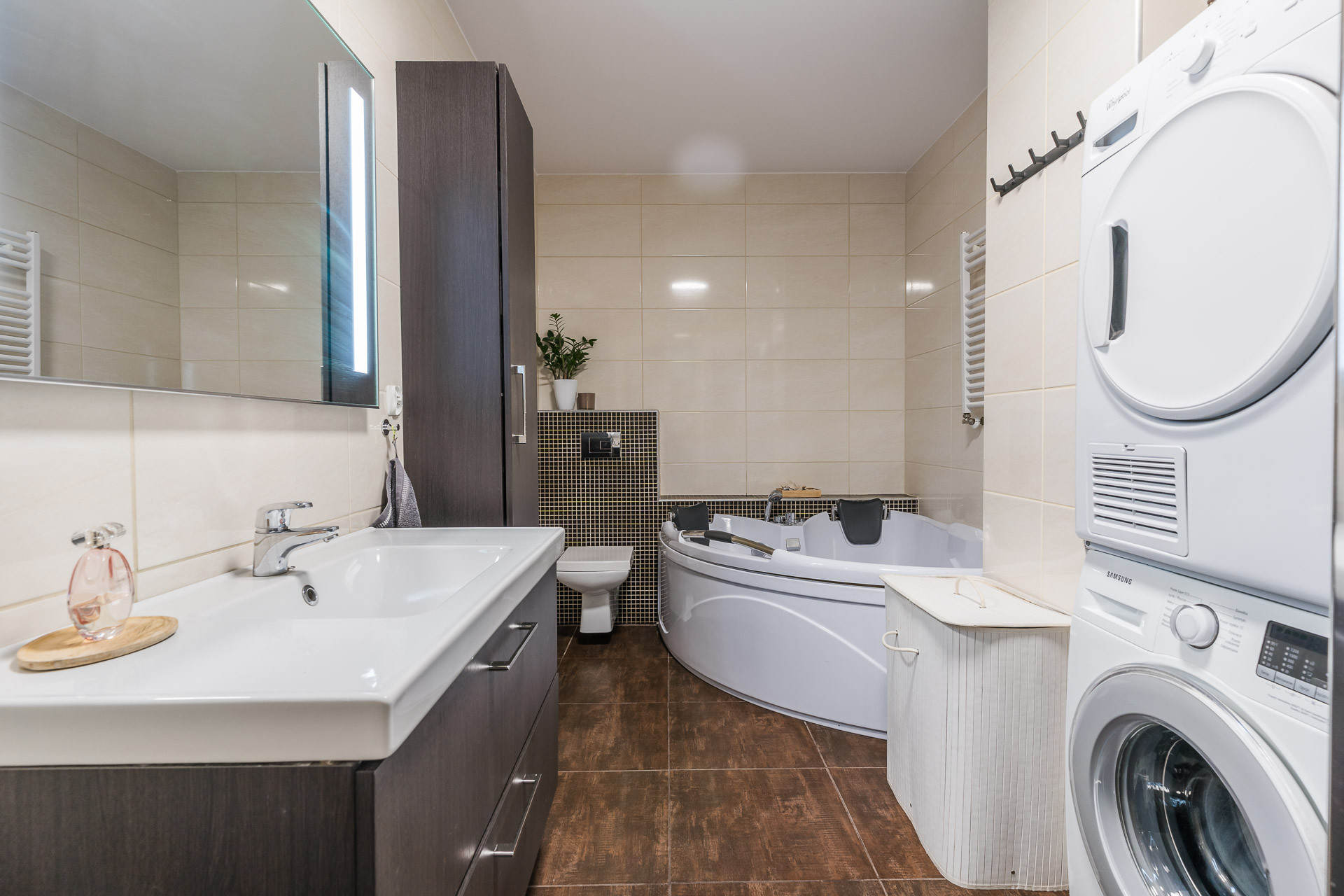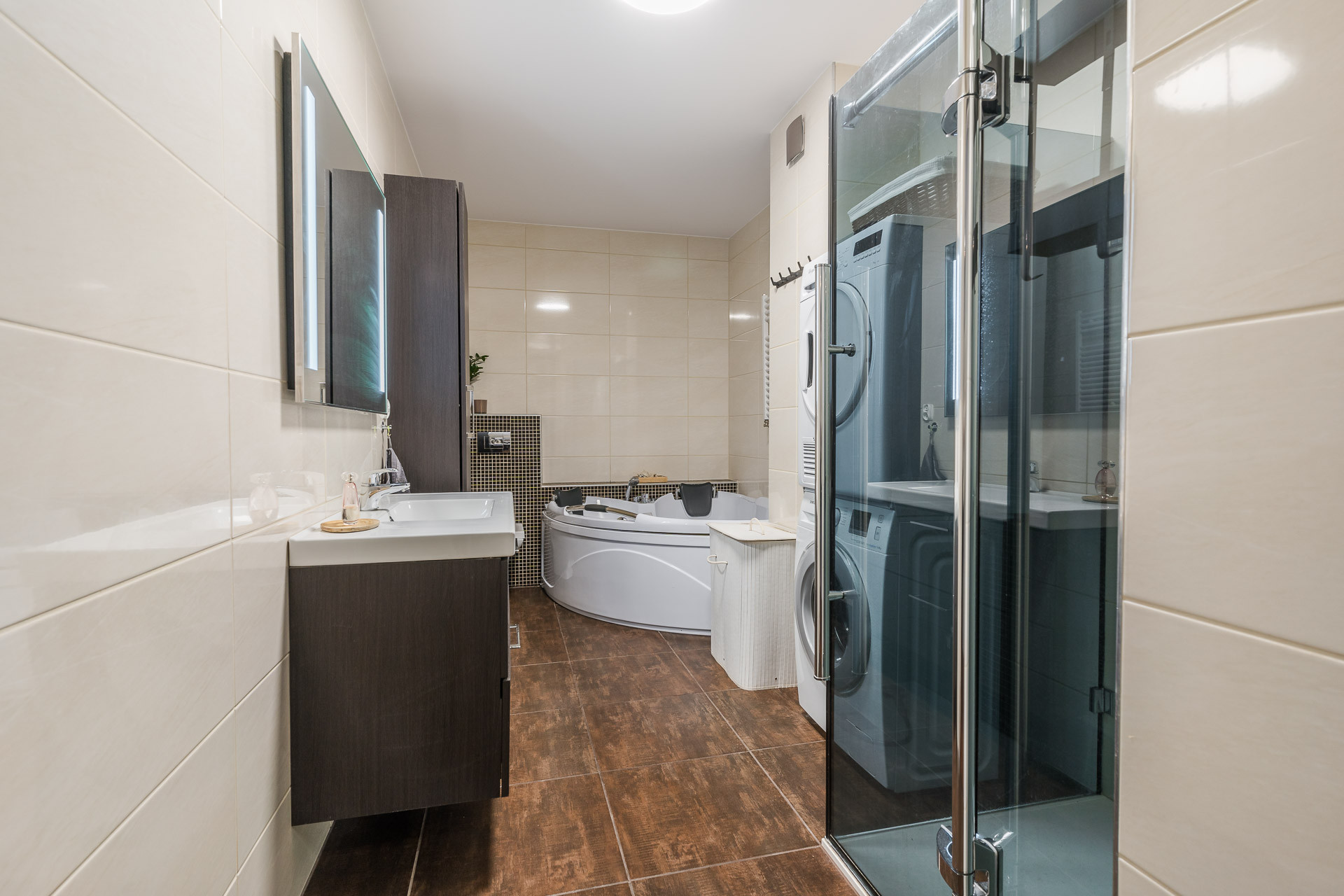 – łazienka (10,06 m2) z WC, narożną wanną, prysznocem, pralka, suszarką, umywalką, lustrem, grzejnikiem drabinkowym,