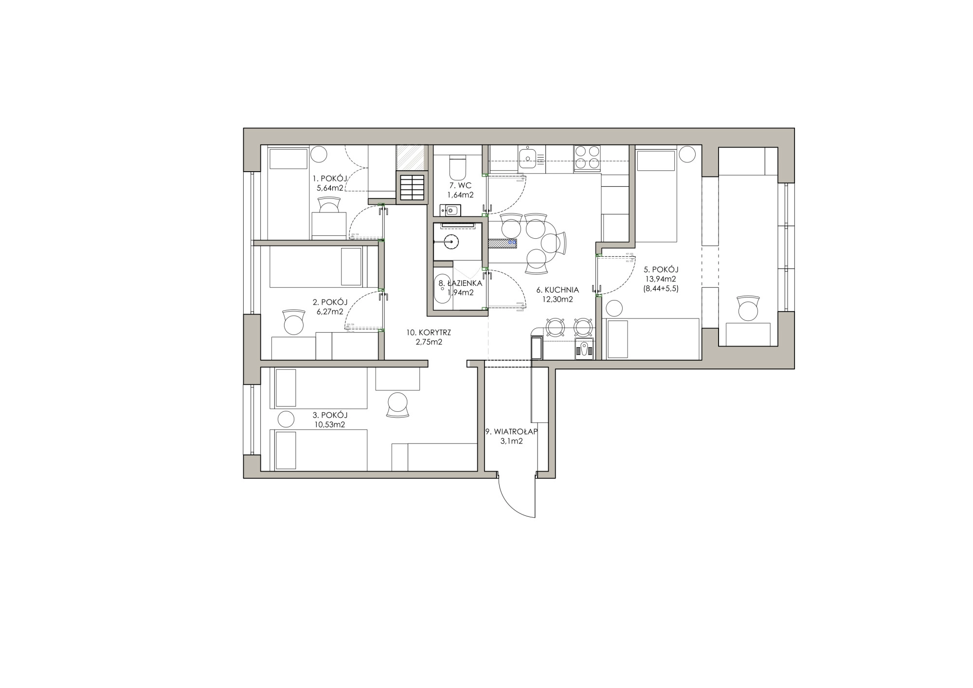 56,10 m² nowoczesnej przestrzeni podzielonej na: