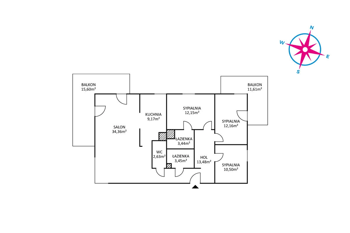 oraz dwóch balkonów (15,6 m2 oraz 11,61m2).